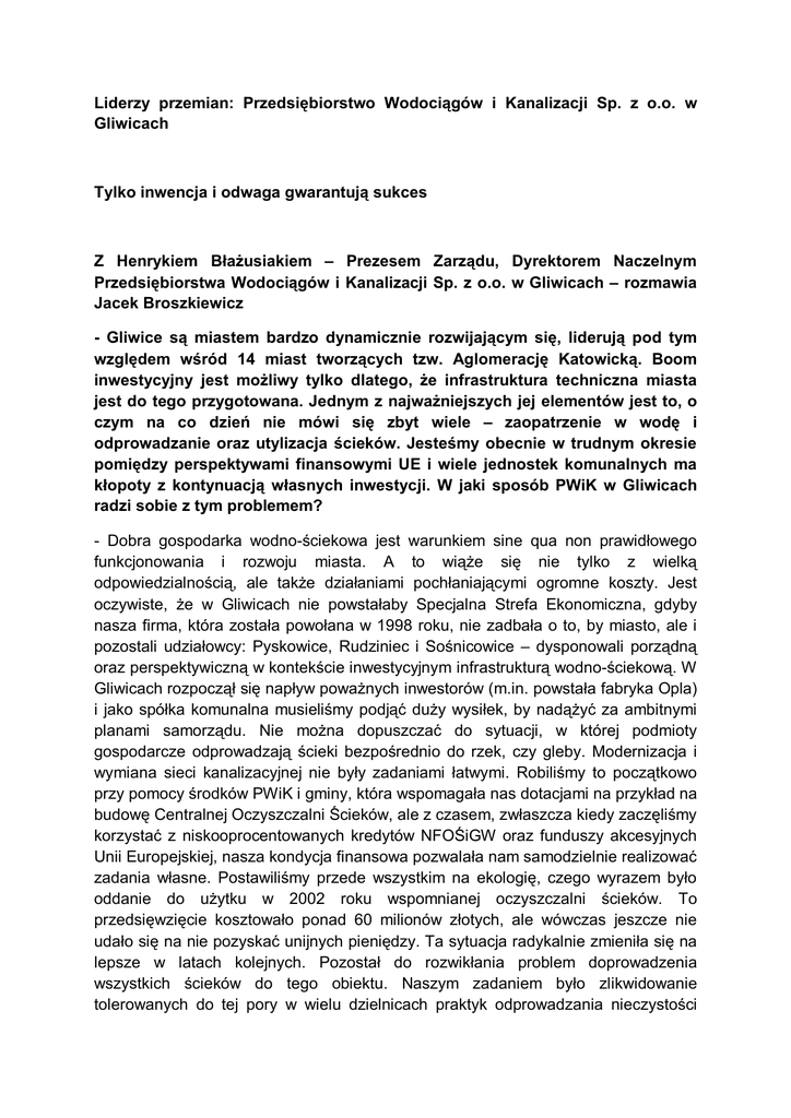 Liderzy przemian: Przedsiębiorstwo Wodociągów i Kanalizacji Sp. z o.o. w Gliwicach Tylko inwencja i odwaga gwarantują sukces Z Henrykiem Błażusiakiem – Prezesem Zarządu, Dyrektorem Naczelnym Przedsiębiorstwa Wodociągów i Kanalizacji Sp. z o.o. w Gliwicach – rozmawia Jacek Broszkiewicz - Gliwice są miastem bardzo dynamicznie rozwijającym się, liderują pod tym względem wśród 14 miast tworzących tzw. Aglomerację Katowicką. Boom inwestycyjny jest możliwy tylko dlatego, że infrastruktura techniczna miasta jest do tego przygotowana. Jednym z najważniejszych jej elementów jest to, o czym na co dzień nie mówi się zbyt wiele – zaopatrzenie w wodę i odprowadzanie oraz utylizacja ścieków. Jesteśmy obecnie w trudnym okresie pomiędzy perspektywami finansowymi UE i wiele jednostek komunalnych ma kłopoty z kontynuacją własnych inwestycji. W jaki sposób PWiK w Gliwicach radzi sobie z tym problemem? - Dobra gospodarka wodno-ściekowa jest warunkiem sine qua non prawidłowego funkcjonowania i rozwoju miasta. A to wiąże się nie tylko z wielką odpowiedzialnością, ale także działaniami pochłaniającymi ogromne koszty. Jest oczywiste, że w Gliwicach nie powstałaby Specjalna Strefa Ekonomiczna, gdyby nasza firma, która została powołana w 1998 roku, nie zadbała o to, by miasto, ale i pozostali udziałowcy: Pyskowice, Rudziniec i Sośnicowice – dysponowali porządną oraz perspektywiczną w kontekście inwestycyjnym infrastrukturą wodno-ściekową. W Gliwicach rozpoczął się napływ poważnych inwestorów (m.in. powstała fabryka Opla) i jako spółka komunalna musieliśmy podjąć duży wysiłek, by nadążyć za ambitnymi planami samorządu. Nie można dopuszczać do sytuacji, w której podmioty gospodarcze odprowadzają ścieki bezpośrednio do rzek, czy gleby. Modernizacja i wymiana sieci kanalizacyjnej nie były zadaniami łatwymi. Robiliśmy to początkowo przy pomocy środków PWiK i gminy, która wspomagała nas dotacjami na przykład na budowę Centralnej Oczyszczalni Ścieków, ale z czasem, zwłaszcza kiedy zaczęliśmy korzystać z niskooprocentowanych kredytów NFOŚiGW oraz funduszy akcesyjnych Unii Europejskiej, nasza kondycja finansowa pozwalała nam samodzielnie realizować zadania własne. Postawiliśmy przede wszystkim na ekologię, czego wyrazem było oddanie do użytku w 2002 roku wspomnianej oczyszczalni ścieków. To przedsięwzięcie kosztowało ponad 60 milionów złotych, ale wówczas jeszcze nie udało się na nie pozyskać unijnych pieniędzy. Ta sytuacja radykalnie zmieniła się na lepsze w latach kolejnych. Pozostał do rozwikłania problem doprowadzenia wszystkich ścieków do tego obiektu. Naszym zadaniem było zlikwidowanie tolerowanych do tej pory w wielu dzielnicach praktyk odprowadzania nieczystości wprost do gruntu poprzez szamba przelewowe lub wprost do rowów lub potoków. Nasze miasto nie wyróżniało się pod tym względem na tle całego kraju, ale należało jak najszybciej i najskuteczniej uporządkować sytuację na miarę europejskich standardów. Wtedy właśnie postanowiliśmy sięgnąć po środki UE – wspólnie z samorządem, który złożył wniosek o dotację na całkowite skanalizowanie przynajmniej największych dzielnic Gliwic. - Z jakiego punktu startowaliście? - Przed nami był ogrom pracy. Bo na początku drugiego tysiąclecia miasto było skanalizowane zaledwie w 40 procentach. Od momentu rozpisania pierwszego przetargu na roboty w dzielnicy Brzezinka staliśmy się praktycznie zupełnie samodzielni i odpowiedzialni z ramienia samorządu za gospodarkę wodno-ściekową. To moment, kiedy mogliśmy liczyć na własne siły, pomysłowość, zaradność i skuteczność. To było 10 lat temu – efektywnie aplikowaliśmy o dotacje unijne na 15 zadań, w tym 13 związanych ściśle z modernizacją i wymianą kanalizacji w 13 dzielnicach. Osiągnęliśmy sukces realizując I etap modernizacji gospodarki wodnościekowej, i jako jedni z pierwszych w kraju nie musieliśmy zwracać Unii ani jednego euro – co jest wyjątkiem w tej branży. Z dzisiejszej perspektywy mogę z całą odpowiedzialnością powiedzieć, że podołaliśmy wyzwaniu, ponieważ Gliwice są obecnie skanalizowane w 98 procentach, a nasze możliwości kreślone zagospodarowaniem 30 tysięcy metrów sześciennych ścieków na dobę, są praktycznie dwukrotnie większe, niż przed realizacją unijnych projektów. Nie będę ukrywał, że ma to ogromne znaczenie dla rozwoju miasta, do którego ciągną rzesze inwestorów. - Mam wrażenie, że tak szybki postęp cywilizacyjny w dziedzinie, którą Pan reprezentuje wynika z faktu, że przedsiębiorstwa zajmujące się nią nie są wobec siebie konkurencyjne, a wymiana doświadczeń i pomysłów jest na porządku dziennym. Wiem, że gliwickie PWiK nigdy nie odmawiało kolegom z branży dobrych rad i sugestii… - To prawda. Niczego nie ukrywamy i nie strzeżemy tajemnic naszych sukcesów. Informacja o technologiach, sposobach skutecznego aplikowania po środki zewnętrzne jest szeroko dostępna. Wychodzę z założenia, że im więcej wiedzy przekażemy innym, tym więcej sami jej otrzymamy. Ta zasada sprawdza się w praktyce. Pomagamy sobie wzajemnie i robimy to zupełnie bezinteresownie, a zyskują na tym przede wszystkim mieszkańcy, przedsiębiorcy i instytucje, a takich o najwyższym poziomie technologicznym jest w Gliwicach cała masa i ciągle ich przybywa. Nie możemy odbiegać poziomem naszych rozwiązań i oferty od standardów nie tylko europejskich, ale i światowych. PWiK Gliwice było jednym z założycieli Stowarzyszenia Beneficjentów Polskich w branży wodno-kanalizacyjnej liczącej obecnie kilkuset członków i już sam ten fakt potwierdza od początku naszą gotowość do niesienia sobie wzajemnej pomocy, rady i wsparcia. Bo przecież początkowo nikt, włączając nawet NFOŚiGW, nie wiedział jak zarządzać funduszami unijnymi. Wspólnie się tego uczyliśmy i dz