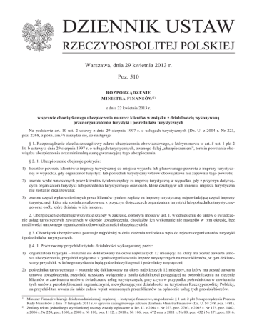 DZIENNIK USTAW RZECZYPOSPOLITEJ POLSKIEJ Warszawa, dnia 29 kwietnia 2013 r. Poz. 510 ROZPORZĄDZENIE MINISTRA FINANSÓW 1) z dnia 22 kwietnia 2013 r. w sprawie obowiązkowego ubezpieczenia na rzecz klientów w związku z działalnością wykonywaną przez organizatorów turystyki i pośredników turystycznych Na podstawie art. 10 ust. 2 ustawy z dnia 29 sierpnia 1997 r. o usługach turystycznych (Dz. U. z 2004 r. Nr 223, poz. 2268, z późn. zm.2)) zarządza się, co następuje: § 1. Rozporządzenie określa szczegółowy zakres ubezpieczenia obowiązkowego, o którym mowa w art. 5 ust. 1 pkt 2 lit. b ustawy z dnia 29 sierpnia 1997 r. o usługach turystycznych, zwanego dalej „ubezpieczeniem”, termin powstania obowiązku ubezpieczenia oraz minimalną sumę gwarancyjną tego ubezpieczenia. § 2. 1. Ubezpieczenie obejmuje pokrycie: 1) kosztów powrotu klientów z imprezy turystycznej do miejsca wyjazdu lub planowanego powrotu z imprezy turystycznej w wypadku, gdy organizator turystyki lub pośrednik turystyczny wbrew obowiązkowi nie zapewnia tego powrotu; 2) zwrotu wpłat wniesionych przez klientów tytułem zapłaty za imprezę turystyczną w wypadku, gdy z przyczyn dotyczących organizatora turystyki lub pośrednika turystycznego oraz osób, które działają w ich imieniu, impreza turystyczna nie zostanie zrealizowana; 3) zwrotu części wpłat wniesionych przez klientów tytułem zapłaty za imprezę turystyczną, odpowiadającą części imprezy turystycznej, która nie została zrealizowana z przyczyn dotyczących organizatora turystyki lub pośrednika turystycznego oraz osób, które działają w ich imieniu. 2. Ubezpieczenie obejmuje wszystkie szkody w zakresie, o którym mowa w ust. 1, w odniesieniu do umów o świadczenie usług turystycznych zawartych w okresie ubezpieczenia, chociażby ich wykonanie nie nastąpiło w tym okresie, bez możliwości umownego ograniczenia odpowiedzialności ubezpieczyciela. § 3. Obowiązek ubezpieczenia powstaje najpóźniej w dniu złożenia wniosku o wpis do rejestru organizatorów turystyki i pośredników turystycznych. § 4. 1. Przez roczny przychód z tytułu działalności wykonywanej przez: 1) organizatora turystyki – rozumie się deklarowany na okres najbliższych 12 miesięcy, na który ma zostać zawarta umowa ubezpieczenia, przychód wyłącznie z tytułu organizowania imprez turystycznych na rzecz klientów, w tym deklarowany przychód, w którego uzyskaniu będą pośredniczyli agenci i pośrednicy turystyczni; 2) pośrednika turystycznego – rozumie się deklarowany na okres najbliższych 12 miesięcy, na który ma zostać zawarta umowa ubezpieczenia, przychód uzyskany wyłącznie z tytułu działalności polegającej na pośredniczeniu na zlecenie klientów w zawieraniu umów o świadczenie usług turystycznych, przy czym w przypadku pośrednictwa w zawieraniu tych umów z przedsiębiorcami zagranicznymi, niewykonującymi działalności na terytorium Rzeczypospolitej Polskiej, za przychód ten uważa się także całość wpłat wnoszonych przez klientów na opłacenie usług tych przedsiębiorców. Minister Finansów kieruje działem administracji rządowej – instytucje finansowe, na podstawie § 1 ust. 2 pkt 3 rozporządzenia Prezesa Rady Ministrów z dnia 18 listopada 2011 r. w sprawie szczegółowego zakresu działania Ministra Finansów (Dz. U. Nr 248, poz. 1481). 2) Zmiany tekstu jednolitego wymienionej ustawy zostały ogłoszone w Dz. U. z 2004 r. Nr 273, poz. 2703, z 2005 r. Nr 175, poz. 1462, z 2006 r. Nr 220, poz. 1600, z 2008 r. Nr 180, poz. 1112, z 2010 r. Nr 106, poz. 672 oraz z 2011 r. Nr 80, poz. 432 i Nr 171, poz. 1016. 1) Dziennik Ustaw –2– Poz. 510 2. W przypadku połączenia przedsiębiorców prowadzących działalność organizatora turystyki lub pośrednika turystycznego lub przejęcia przez przedsiębiorcę prowadzącego działalność organizatora turystyki lub pośrednika turystycznego zobowiązań innego przedsiębiorcy, wynikających z zawartych przez niego umów o organizowanie imprez turystycznych lub umów o pośredniczenie na zlecenie klientów w zawieraniu umów o świadczenie usług turystycznych, roczny przychód z tytułu działalności gospodarczej stanowi odpowiednio sumę deklarowanych przychodów połączonych przedsiębiorców albo sumę deklarowanych przychodów przedsiębiorcy i deklarowanych przychodów wynikających z przejętych zobowiązań. 3. Roczny przychód, o którym mowa w ust. 1 i 2, deklarowany na okres najbliższych 12 miesięcy na potrzeby określenia minimalnej wysokości sumy gwarancyjnej nie może być niższy niż roczny przychód osiągnięty w roku obrotowym poprzedzającym rok zawarcia umowy ubezpieczenia. § 5. W przypadku gdy organizator turystyki lub pośrednik turystyczny wykonuje jednocześnie działalność w więcej niż jednym zakresie, o którym mowa w § 6, minimalna wysokość sumy gwarancyjnej jest określana na poziomie wyższej wartości procentowej lub kwotowej właściwej dla zabezpieczenia finansowego wykonywanej działalności. § 6. W celu określenia minimalnej wysokości sumy gwarancyjnej dokonuje się następującego rozróżnienia wykonywanej działalności: 1) organizowanie imprez turystycznych i pośredniczenie na zlecenie klientów w zawieraniu umów o świadczenie usług turystycznych na terytorium państw europejskich i pozaeuropejskich z wykorzystaniem transportu lotniczego w ramach przewozu czarterowego, z wyłączeniem pkt 4; 2) organizowanie imprez turystycznych i pośredniczenie na zlecenie klientów w zawieraniu umów o świadczenie usług turystycznych na terytorium państw pozaeuropejskich z wykorzystaniem innego środka transportu niż transport lotniczy w ramach przewozu czarterowego, z wyłączeniem pkt 4; 3) organizowanie imprez turystycznych i pośredniczenie na zlecenie klientów w zawieraniu umów o świadczenie usług turystycznych na terytorium państw europejskich z wykorzystaniem innego środka transportu niż