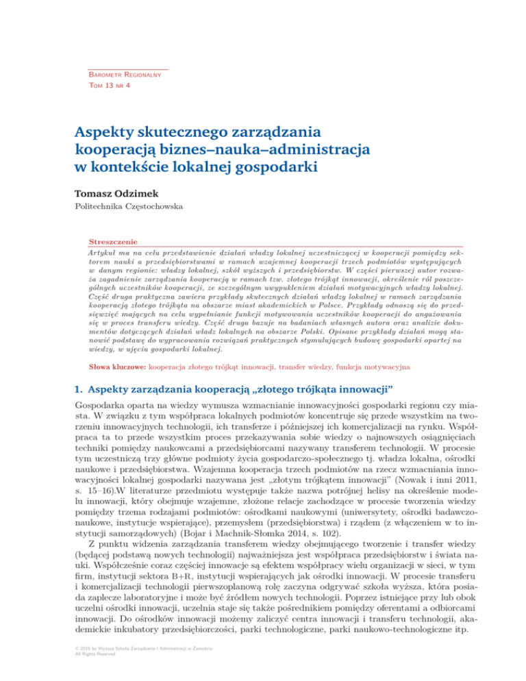 Barometr Regionalny Tom 13 nr 4 Aspekty skutecznego zarządzania kooperacją biznes–nauka–administracja w kontekście lokalnej gospodarki Tomasz Odzimek Politechnika Częstochowska Streszczenie Artykuł ma na celu przedstawienie działań władzy lokalnej uczestniczącej w kooperacji pomiędzy sektorem nauki a przedsiębiorstwami w ramach wzajemnej kooperacji trzech podmiotów występujących w danym regionie: władzy lokalnej, szkół wyższych i przedsiębiorstw. W części pierwszej autor rozważa zagadnienie zarządzania kooperacją w ramach tzw. złotego trójkąt innowacji, określenie ról poszczególnych uczestników kooperacji, ze szczególnym uwypukleniem działań motywacyjnych władzy lokalnej. Część druga praktyczna zawiera przykłady skutecznych działań władzy lokalnej w ramach zarządzania kooperacją złotego trójkąta na obszarze miast akademickich w Polsce. Przykłady odnoszą się do przedsięwzięć mających na celu wypełnianie funkcji motywowania uczestników kooperacji do angażowania się w proces transferu wiedzy. Część druga bazuje na badaniach własnych autora oraz analizie dokumentów dotyczących działań władz lokalnych na obszarze Polski. Opisane przykłady działań mogą stanowić podstawę do wypracowania rozwiązań praktycznych stymulujących budowę gospodarki opartej na wiedzy, w ujęciu gospodarki lokalnej. Słowa kluczowe: kooperacja złotego trójkąt innowacji, transfer wiedzy, funkcja motywacyjna 1. Aspekty zarządzania kooperacją „złotego trójkąta innowacji” Gospodarka oparta na wiedzy wymusza wzmacnianie innowacyjności gospodarki regionu czy miasta. W związku z tym współpraca lokalnych podmiotów koncentruje się przede wszystkim na tworzeniu innowacyjnych technologii, ich transferze i późniejszej ich komercjalizacji na rynku. Współpraca ta to przede wszystkim proces przekazywania sobie wiedzy o najnowszych osiągnięciach techniki pomiędzy naukowcami a przedsiębiorcami nazywany transferem technologii. W procesie tym uczestniczą trzy główne podmioty życia gospodarczo-społecznego tj. władza lokalna, ośrodki naukowe i przedsiębiorstwa. Wzajemna kooperacja trzech podmiotów na rzecz wzmacniania innowacyjności lokalnej gospodarki nazywana jest „złotym trójkątem innowacji” (Nowak i inni 2011, s. 15–16).W literaturze przedmiotu występuje także nazwa potrójnej helisy na określenie modelu innowacji, który obejmuje wzajemne, złożone relacje zachodzące w procesie tworzenia wiedzy pomiędzy trzema rodzajami podmiotów: ośrodkami naukowymi (uniwersytety, ośrodki badawczonaukowe, instytucje wspierające), przemysłem (przedsiębiorstwa) i rządem (z włączeniem w to instytucji samorządowych) (Bojar i Machnik-Słomka 2014, s. 102). Z punktu widzenia zarządzania transferem wiedzy obejmującego tworzenie i transfer wiedzy (będącej podstawą nowych technologii) najważniejsza jest współpraca przedsiębiorstw i świata nauki. Współcześnie coraz częściej innowacje są efektem współpracy wielu organizacji w sieci, w tym firm, instytucji sektora B+R , instytucji wspierających jak ośrodki innowacji. W procesie transferu i komercjalizacji technologii pierwszoplanową rolę zaczyna odgrywać szkoła wyższa, która posiada zaplecze laboratoryjne i może być źródłem nowych technologii. Poprzez istniejące przy lub obok uczelni ośrodki innowacji, uczelnia staje się także pośrednikiem pomiędzy oferentami a odbiorcami innowacji. Do ośrodków innowacji możemy zaliczyć centra innowacji i transferu technologii, akademickie inkubatory przedsiębiorczości, parki technologiczne, parki naukowo-technologiczne itp. © 2015 by Wyższa Szkoła Zarządzania i Administracji w Zamościu All Rights Reserved 106 Tomasz Odzimek Władza lokalna nie uczestniczy w tworzeniu technologii, ale odgrywa bardzo ważną rolę w tworzeniu warunków do transferu a często również sama zarządza transferem technologii między nauką a biznesem. Władza lokalna jest bowiem w stanie stworzyć przyszłościową strategię rozwoju innowacyjności regionu czy miasta i skutecznie ja wdrażać za pomocą zarządzania współpracą z ośrodkami naukowymi jak i przedsiębiorstwami (Harvey 1989, s. 3). Transfer wiedzy w wymiarze lokalnym skupia się głównie na obszarze miast, w szczególności metropolii uniwersyteckich, skupiających duże ośrodki naukowe i przemysł. Warunkiem efektywnego występowania transferu jest skuteczne zarządzanie całą kooperacją lokalnych powiązań. Wówczas możliwe jest osiąganie konkretnych celów, przede wszystkim wzrostu innowacyjności lokalnej gospodarki poprzez transfer wiedzy. W ramach złotego trójkąta innowacji można zauważyć istniejącą regułę polegającą na tym, że na obszarze ze sprawnie działającą kooperacją trzech podmiotów następuje wzrost innowacyjności lokalnej gospodarki. Tworzy się zatem innowacyjny obszar, który w literaturze określany jest jako region o przyspieszonym rozwoju ekonomiczno-społecznym, bazującym na gospodarce opartej na wiedzy i przemyśle zaawansowanych technologii oraz charakteryzujący się zwiększoną konkurencyjnością i wyższym poziomem życia mieszkańców. W tym znaczeniu innowacyjny obszar odnosi się do miasta metropolii, ale może również obejmować większy układ zurbanizowany tworzący innowacyjny region (Wdowiarz-Bilska 2008, s. 130). Odwrotną prawidłowością jest obszar na którym mało skuteczna kooperacja oznacza nikły stopień transferu wiedzy i tym samym słaby poziom innowacyjności lokalnej gospodarki. Tworzenie a następnie transfer nowej wiedzy w wymiarze lokalnym muszą być poprzedzone skutecznym zarządzaniem wzajemną kooperacją ośrodków naukowych z sektorem przedsiębiorstw z aktywnym uczestnictwem władz lokalnych. Kwestia skutecznego zarządzania taką kooperacją jest więc warunkiem sine qua non rozwoju danego regionu i lokalnej gospodarki. Na proces zarządzania składa się wie