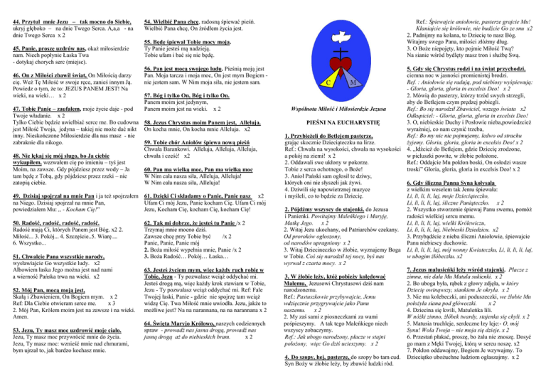 44. Przytul mnie Jezu – tak mocno do Siebie, ukryj głęboko – na dnie Twego Serca. A,a,a - na dnie Twego Serca x 2 45. Panie, proszę uzdrów nas, okaż miłosierdzie nam. Niech popłynie Łaska Twa - dotykaj chorych serc (miejsc). 46. On z Miłości zbawił świat, On Miłością darzy cię. Weź Tę Miłość w swoje ręce, zanieś innym Ją. Powiedz o tym, że to: JEZUS PANEM JEST! Na wieki, na wieki… x 2 54. Wielbić Pana chcę, radosną śpiewać pieśń. Wielbić Pana chcę, On źródłem życia jest. 55. Będę śpiewał Tobie mocy moja. Ty Panie jesteś mą nadzieją. Tobie ufam i bać się nie będę. 56. Pan jest mocą swojego ludu. Pieśnią moją jest Pan. Moja tarcza i moja moc, On jest mym Bogiem nie jestem sam. W Nim moja siła, nie jestem sam. 57. Bóg i tylko On, Bóg i tylko On. Panem moim jest jedynym, Panem moim jest na wieki. x 2 47. Tobie Panie – zaufałem, moje życie daje - pod Twoje władanie. x 2 Tylko Ciebie będzie uwielbiać serce me. Bo cudowna 58. Jezus Chrystus moim Panem jest, Alleluja. jest Miłość Twoja, jedyna – takiej nie może dać nikt On kocha mnie, On kocha mnie Alleluja. x2 inny. Nieskończone Miłosierdzie dla nas masz - nie zabraknie dla nikogo. 59. Tobie chór Aniołów śpiewa nową pieśń Chwała Barankowi. Alleluja, Alleluja, Alleluja, chwała i cześć! x2 48. Nie lękaj się mój sługo, bo Ja ciebie wykupiłem, wezwałem cię po imieniu – tyś jest Moim, na zawsze. Gdy pójdziesz przez wody – Ja 60. Pan ma wielką moc, Pan ma wielką moc tam będę z Tobą, gdy pójdziesz przez rzeki – nie W Nim cała nasza siła, Alleluja, Alleluja! zatopią ciebie. W Nim cała nasza siła, Alleluja! 49. Dzisiaj spojrzał na mnie Pan i ja też spojrzałem 61. Dzięki Ci składamy o Panie, Panie nasz x2 na Niego. Dzisiaj spojrzał na mnie Pan, Ufam Ci mój Jezu, Panie kocham Cię. Ufam Ci mój powiedziałem Mu: ,, - Kocham Cię!'' Jezu, Kocham Cię, kocham Cię, kocham Cię! 50. Radość, radość, radość, radość. Radość mają Ci, których Panem jest Bóg. x2 2. Miłość... 3. Pokój... 4. Szczęście..5. Wiarę.... 6. Wszystko... 51. Chwalcie Pana wszystkie narody, wysławiajcie Go wszystkie ludy. x2 Albowiem łaska Jego można jest nad nami a wierność Pańska trwa na wieki. x2 52. Mój Pan, mocą moją jest, Skałą i Zbawieniem, On Bogiem mym. x 2 Ref: Dla Ciebie otwieram serce me. x3 2. Mój Pan, Królem moim jest na zawsze i na wieki. Amen. 53. Jezu, Ty masz moc uzdrowić moje ciało. Jezu, Ty masz moc przywrócić mnie do życia. Jezu, Ty masz moc: wznieść mnie nad chmurami, bym ujrzał to, jak bardzo kochasz mnie. Ref.: Śpiewajcie aniołowie, pasterze grajcie Mu! Kłaniajcie się królowie, nie budźcie Go ze snu x2 2. Padnijmy na kolana, to Dziecię to nasz Bóg. Witajmy swego Pana, miłości złóżmy dług. 3. O Boże niepojęty, kto pojmie Miłość Twą? Na sianie wśród bydlęty masz tron i służbę Swą. 62. Tak mi dobrze, że jesteś tu Panie /x 2 Trzymaj mnie mocno dziś. Zawsze chcę przy Tobie być /x 2 Panie, Panie, Panie mój 2. Boża miłość wypełnia mnie, Panie /x 2 3. Boża Radość… Pokój… Łaska… 63. Jesteś życiem mym, więc każdy ruch robię w Tobie, Jezu - Ty pozwalasz wciąż oddychać mi. Jesteś drogą mą, więc każdy krok stawiam w Tobie, Jezu - Ty pozwalasz wciąż oddychać mi. Ref: Fale Twojej łaski, Panie - gdzie nie spojrzę tam wciąż widzę Cię. Twa Miłość mnie uwiodła. Jezu, jakże to możliwe jest? Na na narannana, na na narannana x 2 64. Święta Maryjo Królowo, naszych codziennych spraw - prowadź nas jasna drogą, prowadź nas jasną drogą aż do niebieskich bram. x2 Wspólnota Miłość i Miłosierdzie Jezusa PIEŚNI NA EUCHARYSTIĘ 1. Przybieżeli do Betlejem pasterze, grając skocznie Dzieciąteczku na lirze. Ref.: Chwała na wysokości, chwała na wysokości a pokój na ziemi! x 2 2. Oddawali swe ukłony w pokorze. Tobie z serca ochotnego, o Boże! 3. Anioł Pański sam ogłosił te dziwy, których oni nie słyszeli jak żywi. 4. Dziwili się napowietrznej muzyce i myśleli, co to będzie za Dziecię. 2. Pójdźmy wszyscy do stajenki, do Jezusa i Panienki. Powitajmy Maleńkiego i Maryję, Matkę Jego. x 2 2. Witaj Jezu ukochany, od Patriarchów czekany. Od proroków ogłoszony, od narodów upragniony x 2 3. Witaj Dziecineczko w żłobie, wyznajemy Boga w Tobie. Coś się narodził tej nocy, byś nas wyrwał z czarta mocy. x 2 3. W żłobie leży, któż pobieży kolędować Małemu, Jezusowi Chrystusowi dziś nam narodzonemu. Ref.: Pastuszkowie przybywajcie, Jemu wdzięcznie przygrywajcie jako Panu naszemu. x2 2. My zaś sami z piosneczkami za wami pośpieszymy. A tak tego Maleńkiego niech wszyscy zobaczymy. Ref.: Jak ubogo narodzony, płacze w stajni położony, więc Go dziś ucieszymy. x 2 4. Do szopy, hej, pasterze, do szopy bo tam cud. Syn Boży w żłobie leży, by zbawić ludzki ród. 5. Gdy się Chrystus rodzi i na świat przychodzi, ciemna noc w jasności promienistej brodzi. Ref. : Aniołowie się radują, pod niebiosy wyśpiewują: - Gloria, gloria, gloria in excelsis Deo! x 2 2. Mówią do pasterzy, którzy trzód swych strzegli, aby do Betlejem czym prędzej pobiegli. Ref.: Bo się narodził Zbawiciel, wszego świata x2 Odkupiciel: - Gloria, gloria, gloria in excelsis Deo! 3. O, niebieskie Duchy i Posłowie nieba,powiedzcież wyraźniej, co nam czynić trzeba, Ref.: Bo my nic nie pojmujemy, ledwo od strachu żyjemy. Gloria, gloria, gloria in excelsis Deo! x 2 4. „Idźcież do Betlejem, gdzie Dziecię zrodzone, w pieluszki powite, w żłobie położone. Ref.: Oddajcie Mu pokłon boski, On osłodzi wasze troski” Gloria, gloria, gloria in excelsis Deo! x 2 6. Gdy śliczna Panna Syna kołysała z wielkim weselem tak Jemu śpiewała: Li, li, li, li, laj, moje Dzieciąteczko, Li, li, li, li, laj, śliczne Paniąteczko. x 2 2. Wszystko stworzenie śpiewaj Panu swemu, pomóż radości wielkiej sercu memu. Li, li, li, li, laj, wielki Królewi