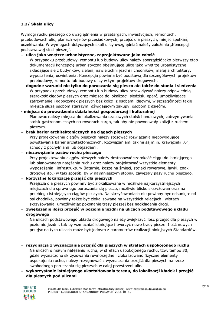 3.2/ Skala ulicy Wymogi ruchu pieszego do uwzględnienia w przetargach, inwestycjach, remontach, przebudowach ulic, planach węzłów przesiadkowych, przejść dla pieszych, miejsc spotkań, oczekiwania. W wymogach dotyczących skali ulicy uwzględniać należy założenia „Koncepcji podstawowej sieci pieszej”. ulica jako wnętrze urbanistyczne, zaprojektowane jako całość W przypadku przebudowy, remontu lub budowy ulicy należy sporządzić jako pierwszy etap dokumentacji koncepcję urbanistyczną obejmującą ulicę jako wnętrze urbanistyczne składające się z budynków, zieleni, nawierzchni jezdni i chodników, małej architektury, wyposażenia, oświetlenia. Koncepcja powinna być podstawą dla szczegółowych projektów przebudowy, remontu lub budowy ulicy w tym projektów drogowych. dogodne warunki nie tylko do poruszania się pieszo ale także do stania i siedzenia W przypadku przebudowy, remontu lub budowy ulicy przewidywać należy odpowiednią szerokość ciągów pieszych oraz miejsca do lokalizacji siedzisk, oparć, umożliwiające zatrzymanie i odpoczynek pieszych bez kolizji z osobami idącymi, w szczególności takie miejsca służą osobom starszym, dźwigającym zakupy, osobom z dziećmi. - miejsca do prowadzenia działalności gospodarczej i kulturalnej Planować należy miejsca do lokalizowania czasowych stoisk handlowych, zatrzymywania stoisk gastronomicznych na rowerach cargo, tak aby nie powodowały kolizji z ruchem pieszym. brak barier architektonicznych na ciągach pieszych Przy projektowaniu ciągów pieszych należy stosować rozwiązania niepowodujące powstawania barier architektonicznych. Rozwiązaniami takimi są m.in. krawężniki „0”, schody z pochylniami lub objazdami. niezawężanie pasów ruchu pieszego Przy projektowaniu ciągów pieszych należy dostosować szerokość ciągu do istniejącego lub planowanego natężenia ruchu oraz należy projektować wszystkie elementy wyposażenia i infrastruktury (latarnie, kosze na śmieci, stojaki rowerowe, ławki, znaki drogowe itp.) w taki sposób, by w najmniejszym stopniu zawężały pasy ruchu pieszego. korzystne lokalizacje przejść dla pieszych Przejścia dla pieszych powinny być zlokalizowane w możliwie najkorzystniejszych miejscach dla sprawnego poruszania się pieszo, możliwie blisko skrzyżowań oraz na przebiegu istniejących ciągów pieszych. Na skrzyżowaniach nie powinny być odsunięte od osi chodnika, powinny także być zlokalizowane na wszystkich relacjach i wlotach skrzyżowania, umożliwiając pokonanie trasy pieszej bez nadkładania drogi. zwiększenie ilości przejść w poziomie jezdni na ulicach podstawowego układu drogowego Na ulicach podstawowego układu drogowego należy zwiększyć ilość przejść dla pieszych w poziomie jezdni, tak by wzmacniać istniejące i tworzyć nowe trasy piesze. Ilość nowych przejść na tych ulicach może być jednym z parametrów realizacji niniejszych Standardów. rezygnacja z wyznaczania przejść dla pieszych w strefach uspokojonego ruchu Na ulicach o małym natężeniu ruchu, w strefach uspokojonego ruchu, tzw. tempo 30, gdzie wyznaczono skrzyżowania równorzędne i zlokalizowano fizyczne elementy uspokojenia ruchu, należy rezygnować z wyznaczania przejść dla pieszych na rzecz swobodnego poruszania się pieszych w całej przestrzeni ulic. wykorzystanie istniejącego ukształtowania terenu, do lokalizacji kładek i przejść dla pieszych pod ulicami 7/10 Miasto dla ludzi. Lubelskie standardy infrastruktury pieszej, www.miastodlaludzi.ulublin.eu PROJEKT_LUBELSKICH_STANDARDOW_PIESZYCH_2016_01_19 Z uwagi na ukształtowanie terenu Lublina należy wykorzystać lokalne warunki takie jak skarpy, suche doliny, nasypy w celu lokalizacji kładek i prejść pod ulicami tam gdzie naturalne ukształtowanie terenu na to pozwala. Rozwiązania te powinny niwelować różnice wysokości trasy pieszej i skracać ich długość oraz umożliwiać ich swobodne pokonanie bez barier architektonicznych. rozwijanie stref uspokojonego ruchu i przestrzenie współdzielone Na ulicach o małym natężeniu ruchu: w osiedlach domów jednorodzinnych, niewielkich ulicach w centrum, należy dążyć do zwiększenia ilości stref tempo 30, z realnym fizycznym uspokojeniem ruchu, oraz przestrzeni współdzielonych bez wyróżniania chodnika i jezdni, co rozwiązuje problem parkowania na chodnikach. projektowanie zgodnie z projektowaniem uniwersalnym W projektach dotyczących budowy, przebudowy lub remontu ulic i dróg należy stosowac rozwiązania z zakresu projektowania uniwersalnego, które wspomagają osoby niepełnosprawne w poruszaniu się. Są to m.in. pochylnie, podjazdy, windy, sygnalizatory dla osób niewidomych - dźwiękowe i wibracyjne, ścieżki prowadzące, pola uwagi, pasy ostrzegawcze, schematy i mapy, oświetlenie. rezygnacja z miejsc parkingowych na chodnikach – wprowadzanie parkowania równoległego na jezdni Należy sukcesywnie przenosić miejsca parkingowe z chodników na jezdnie, w postaci parkowania równoległego, co przyczyni się do zwiększenia powierzchni dostępnej dla pieszych i umożliwi swobodne poruszanie się użytkowników o różnych potrzebach. węzły komunikacji publicznej – łatwość przesiadki Węzły komunikacji publicznej należy projektować na kluczowych skrzyżowaniach jako dogodne miejsca przesiadkowe oraz przestrzenie publiczne. Dla jakości i funkcjonalności węzła szczególnie istotne są: przystanki zlokalizowane na wszystkich wylotach skrzyżowania, minimalne odległości pomiędzy przystankami, wygodne przejście bez barier architektonicznych, w poziomie jezdni, czas przejścia bez długiego oczekiwania na światłach, informacja pasażerska, informacje dla niewidomych, miejsca do siedzenia, atrakcyjne miejsca spotkań i odpoczynku, integrowanie komunikacji pieszej, publicznej i rowerowej. ograniczenie stosowania zatok autobusowych Na drogach niższych klas, szczególnie w przypadku niskiego natężenia
