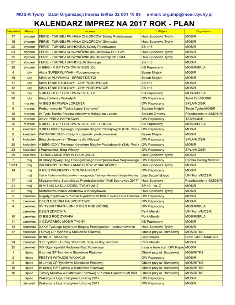 MOSiR Tychy Dział Organizacji Imprez tel/fax 32 661 16 89 e-mail: [email protected] KALENDARZ IMPREZ NA 2017 ROK - PLAN Data/dzień Miesiąc Impreza Miejsce Organizator 17 styczeń FERIE - TURNIEJ PN HALA CHŁOPCÓW Szkoły Podstawowe Hala Sportowa Tychy MOSiR 18 styczeń FERIE - TURNIEJ PN HALA CHŁOPCÓW Gimnazja Hala Sportowa Tychy MOSiR 20 styczeń FERIE - TURNIEJ UNIHOKEJA Szkoły Podstawowe ZS nr 6 MOSiR 23 styczeń FERIE - TURNIEJ KOSZYKÓWKI dla Chłopców SP i GIM Hala Sportowa Tychy MOSiR 25 styczeń FERIE - TURNIEJ KOSZYKÓWKI dla Dziewcząt SP i GIM Hala Sportowa Tychy MOSiR 27 styczeń FERIE - TURNIEJ UNIHOKEJA Gimnazja ZS nr 6 MOSiR 29 styczeń 4 BIEG - X GP TYCHÓW W BIEG. DŁ. KS Paprocany MOSiR/SPLA 4 luty Akcja SUPERPŁYWAK - Podsumowanie Basen Miejski MOSiR 18 luty MMA W PŁYWANIU - SPRINT DZIECI Basen Miejski MOSiR 11 luty MMA TENIS STOŁOWY - GRY POJEDYNCZE ZS nr 7 MOSiR 12 luty MMA TENIS STOŁOWY - GRY POJEDYNCZE ZS nr 7 MOSiR 26 luty 5 BIEG - X GP TYCHÓW W BIEG. DŁ. KS Paprocany MOSiR/SPLA 26 luty Bieg Żołnierzy Wyklętych OW Paprocany Tyski Fan/MOSiR 5 marzec VI BIEG IM.PAWŁA LORENSA OW Paprocany SPLA/MOSiR 9 marzec Podsumowanie "Tyskie Laury Sportowe" Stadion Miejski Twoje Tychy/MOSiR 16 marzec IV Tyski Turniej Przedszkolaków w Hokeju na Lodzie Stadion Zimowy Przedszkole nr 5/MOSiR 19 marzec XXVII PERŁA PAPROCAN OW Paprocany TSS/MOSiR 26 marzec 6 BIEG - X GP TYCHÓW W BIEG. DŁ. I PODSU. KS Paprocany MOSiR/SPLA 6 kwiecień 3 BIEG XXXV Tyskiego Kryterium Biegów Przełajowych (Szk. Pod.) OW Paprocany MOSiR 8 kwiecień WATERRR CUP - Klasy III - zawodi i podsumowanie Basen Miejski MOSiR 8 kwiecień Bieg chrytatywny - "Biegamy dla Miłosza" OW Paprocany SPLA/MOSiR 20 kwiecień 4 BIEG XXXV Tyskiego Kryterium Biegów Przełajowych (Szk. Pod.) OW Paprocany MOSiR 23 kwiecień I Papracoński Bieg Wiosny OW Paprocany SPLA/MOSiR 29 kwiecień TURNIEJ MIKSTÓW W SIATKÓWCE Hala Sportowa Tychy MOSiR 7 maj III Charytatywny Bieg Ewangelickiego Duszpasterstwa Wojskowego OW Paprocany Parafia Ewang./MOSiR 13/14 maj WIOSENNY TURNIEJ AMATORÓW W SIATKÓWCE Hala Sportowa Tychy MOSiR 14 maj X BIEG WIOSENNY - "POLSKA BIEGA" OW Paprocany MOSiR maj Tyskie Rodziny na Baczyńskim - Inauguracja Tyskiego Metropol. Święta Rodziny plac Baczyńskiego UM Tychy/MOSiR 17 maj Międzygminna Spartakiada Przedszkolaków "Mali Sportowcy 2017" Hala Sportowa Przedszkole nr 5/MOSiR 21 maj III MITING LA DLA DZIECI TYCHY 2017 SP 40 - os. Z MOSiR 27 maj Mistrzostwa Miasta Amatorów w Koszykówce Hala Sportowa Tychy MOSiR 3 czerwiec Regaty Kajakowe o Puchar Dyrektora MOSiR z okazji Dnia Dziecka OW Paprocany MOSiR 3 czerwiec DZIEŃ DZIECKA NA SPORTOWO OW Paprocany MOSiR 4 czerwiec XV TYSKI TRIATHLON i X BIEG POD GÓRKĘ OW Paprocany MOSiR/SPLA czerwiec DZIEŃ ZDROWIA Park Miejski UM Tychy/MOSiR 10 czerwiec IX BIEG POD ŻYRAFĄ Park Miejski MOSiR/SPLA 11 czerwiec X CZWÓRBÓJ MOSiR TYCHY KS Paprocany MOSiR 14 czerwiec XXXV Tyskiego Kryterium Biegów Przełajowych - podsumowanie Hala Sportowa Tychy MOSiR 17 czerwiec I turniej GP Tychów w Siatkówce Plażowej Obiekt przy ul. Brzozowej MOSiR/TKS czerwiec III NIGHT SKATING ulice miasta Stow. GREEN/MOSiR 24 czerwiec "Dni Tyskie" - Turniej Streetball, rzuty za trzy, osobiste Park Miejski MOSiR 25 czerwiec XIX Ogólnopolski Rodzinny Rajd Rowerowy trasa w lesie start OW Papro MOSiR 1 lipiec II turniej GP Tychów w Siatkówce Plażowej Obiekt przy ul. Brzozowej MOSiR/TKS 2 lipiec FESTYN WITAJCIE WAKACJE OW Paprocany MOSiR 8 lipiec III turniej GP Tychów w Siatkówce Plażowej Obiekt przy ul. Brzozowej MOSiR/TKS 15 lipiec IV turniej GP Tychów w Siatkówce Plażowej Obiekt przy ul. Brzozowej MOSiR/TKS 16 lipiec Turniej Mikstów w Siatkówce Plażowej o Puchar Dyrektora MOSiR Obiekt przy ul. Brzozowej MOSiR/TKS lipiec Wakacyjna Liga Koszyków Ulicznej 2017 OW Paprocany MOSiR sierpień Wakacyjna Liga Koszyków Ulicznej 2017 OW Paprocany MOSiR 20 sierpień BARBARIAN RACE - BITWA O PAPROCANY KS i OW Paprocany Stowarzyszenie/MOSiR 26 sierpień Wakacyjny Turniej Piłki Nożnej dla Chłopców (SP i GIM) KS Paprocany MOSiR 27 sierpień WAKACYJNY FESTYN ŻEGNAJCIE WAKACJE OW Paprocany MOSiR 27 sierpień Wakacyjny Turniej Amatorów w Koszykówce OW Paprocany MOSiR 2 wrzesień V TYSKI DOGTREKKING OW Paprocany TRAVOIS/MOSiR 3 wrzesień XXII Międzynarodowy Tyski Bieg Uliczny i VI Tyski Półmaraton Hala Sportowa Tychy, ul. miasSPLA/MOSiR 9 wrzesień Zakończenie Sportowych Wakacji Regaty Kajakowe Dzieci OW Paprocany MOSiR 9 wrzesień Regaty Żeglarskie o Puchar Dyrektora MOSiR OW Paprocany MOSiR 9 wrzesień IX Turniej Koszyków Ulicznej Hala Sportowa Tychy MOSiR 14 wrzesień 1 bieg XXXVI Tyskiego Kryterium Biegów Przełajowych (Szk. Pod.) OW Paprocany MOSiR 21 wrzesień 2 bieg XXXVI Tyskiego Kryterium Biegów Przełajowych (Szk. Pod.) OW Paprocany MOSiR wrzesień II Charytatywny Bieg z Nadzieją Fundacji Śląskie Hospicjum dla Dzie OW Paprocany fundacja/MOSiR 7 październik IX TURNIEJ RZUTÓW ZA TRZY Hala Sportowa Tychy MOSiR 22 październik XXVIII PERŁA PAPROCAN OW Paprocany TSS/MOSiR 29 październik Bieg o Puchar Dyrektora MOSiR Tychy KS Paprocany MOSiR/SPLA 11/12 listopad Turniej Amatorów w PN Halowej kat. OPEN Hala Sportowa MOSiR 19 listopad Mistrzostwa Miasta Amatorów w Pływaniu Basen Miejski MOSiR 25/26 listopad Mistrzostwa Miasta Amatorów w Tenisie Stołowym - gry podwójne ZS 7 MOSiR 26 listopad Bieg o Puchar Prezesa SPLA Tychy KS Paprocany MOSiR/SPLA 9 grudzień Mikołajkowy Bal Przebierańców na Lodzie Lodowisko sezonowe OW PaMOSiR 9/10 grudzień Mistrzostwa Miasta Amatorów w Siatkówce Hala Sportowa Tychy MOSiR grudzień Bieg Świąteczno-Noworoczny KS Paprocany MOSiR/SPLA 17