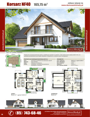 Korsarz NF40 www.domoweklimaty.pl www.domoweklimaty.pl 165,75 m zobacz więcej na www.domoweklimaty.pl 2 autor: arch. Jarosław Charkiewicz 16,54 m 4m Projekt domu dla pięcioosobowej rodziny z dodatkowym pokojem na parterze. Całe wnętrze tworzy spójną całość mimo, że wszystkie pomieszczenia są od siebie oddzielone. Zaopatrzony w obszerny strych nad garażem. 5m 13,30 m 22,30 m 4m 4m PROPOZYCJE ROZWIĄZAŃ MATERIAŁOWYCH: PARAMETRY: dach: elewacje: strop: ściany: pow. użytkowa: pow. zabudowy: wys. budynku: kubatura: min. wymiary działki: dachówka cementowa lub ceramiczna, kąt 42° tynk mineralny żelbetowy monolityczny zewnętrzne: murowane dwuwarstwowe wewnętrzne: murowane 165,75 m2 + garaż 33,56 m2 194,99 m2 9,52m 730,00 m3 24,54 x 22,30 m 24,54 m kotłownia 13.90 m2 pokój 12.05 m2 salon + jadalnia 29.29 m2 gard. 4.40 m2 garaż 33.56 m2 3.30 komun. 7.53 5.02 gard. 4.40 m2 2.97 pokój 11.82 korytarz 11.62 m2 78 pokój 12.05 m2 kuchnia 10.75 m2 parter: 96,20 m2 + garaż 33,56 m2 (85) 743-68-46 gard. 2.98 m2 hall 8.22 m2 strych 29.77 m2 poddasze: 69,55 m2 AUTORSKA PRACOWNIA ARCHITEKTONICZNA arch. Jarosław Charkiewicz 15-427 Białystok, ul. Lipowa 6 e-mail: [email protected] pokój 12.05 m2 łaz. 6.59 gard. 2.98 m2 pokój 12.05 m2