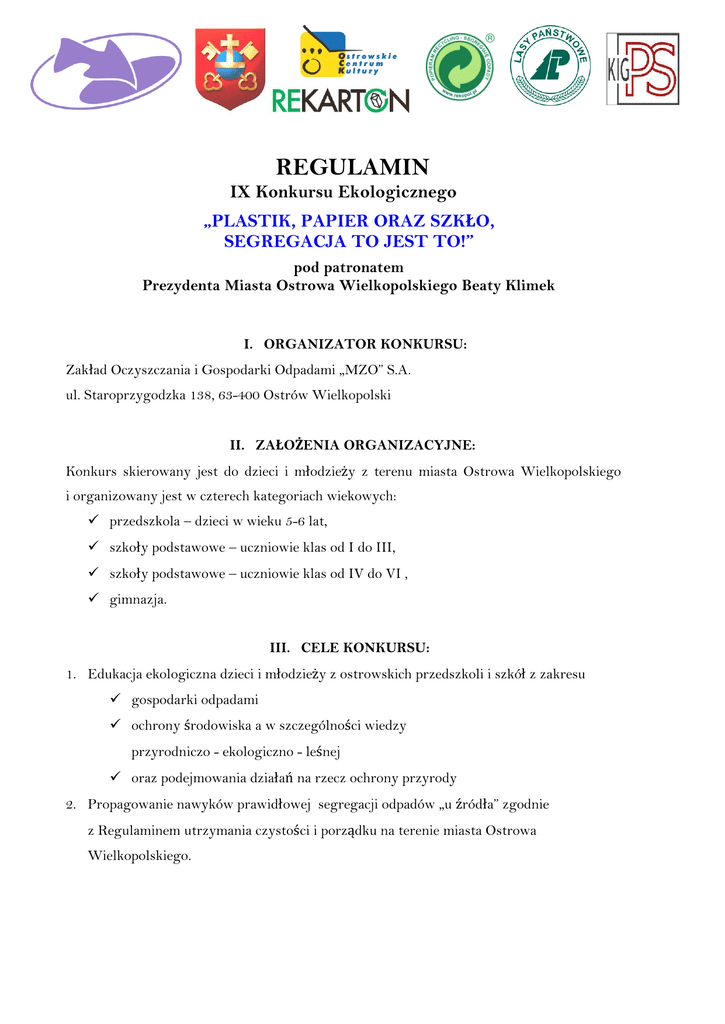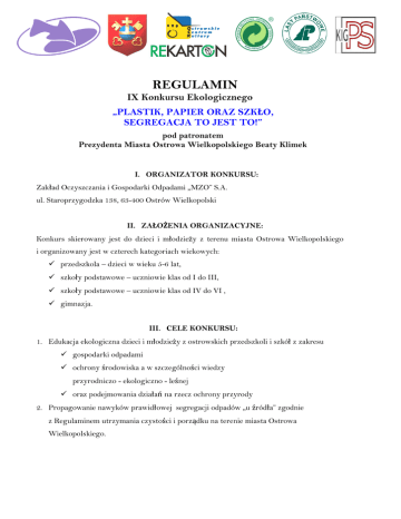 REGULAMIN IX Konkursu Ekologicznego „PLASTIK, PAPIER ORAZ SZKŁO, SEGREGACJA TO JEST TO!” pod patronatem Prezydenta Miasta Ostrowa Wielkopolskiego Beaty Klimek I. ORGANIZATOR KONKURSU: Zakład Oczyszczania i Gospodarki Odpadami „MZO” S.A. ul. Staroprzygodzka 138, 63-400 Ostrów Wielkopolski II. ZAŁOŻENIA ORGANIZACYJNE: Konkurs skierowany jest do dzieci i młodzieży z terenu miasta Ostrowa Wielkopolskiego i organizowany jest w czterech kategoriach wiekowych: przedszkola – dzieci w wieku 5-6 lat, szkoły podstawowe – uczniowie klas od I do III, szkoły podstawowe – uczniowie klas od IV do VI , gimnazja. III. CELE KONKURSU: 1. Edukacja ekologiczna dzieci i młodzieży z ostrowskich przedszkoli i szkół z zakresu gospodarki odpadami ochrony środowiska a w szczególności wiedzy przyrodniczo - ekologiczno - leśnej oraz podejmowania działań na rzecz ochrony przyrody 2. Propagowanie nawyków prawidłowej segregacji odpadów „u źródła” zgodnie z Regulaminem utrzymania czystości i porządku na terenie miasta Ostrowa Wielkopolskiego. IV. WARUNKI I WYMAGANIA: 1. Przedszkola – dzieci w wieku 5-6 lat: prace rysunkowe lub malarskie pod hasłem EKOPOJAZD PRZYSZŁOŚCI z wykorzystaniem odpadów segregowanych konkurs indywidualny - maksymalnie 6 prac z jednego przedszkola. 2. Szkoły podstawowe – klasy od I do III: projekt EKOTORBY z wykorzystaniem odpadów segregowanych format: A4 zespoły - maksymalnie 3 prace z jednej szkoły (max. po 3 osoby w zespole). 3. Szkoły podstawowe – klasy IV do VI: projekt EKOPLAKIETKA o tematyce związanej z tytułem konkursu format: średnica nie większa niż 20cm zespoły - maksymalnie 3 prace z jednej szkoły (max. po 3 osoby w zespole). 4. Gimnazja: KOMIKS o tematyce związanej z tytułem konkursu format: A3 (ilość okienek od 6-12 sztuk) zespoły - maksymalnie 3 prace z jednej szkoły (max. po 3 osoby w zespole). 5. Prace pozostają własnością organizatora i mogą być wykorzystane dla potrzeb Zakładu Oczyszczania i Gospodarki Odpadami „MZO” S.A. w Ostrowie Wielkopolskim. V. TRYB ZGŁASZANIA I TERMIN KONKURSU: 1. Potwierdzenie uczestnictwa w konkursie należy przesłać do dnia 30 września 2015r. do siedziby organizatora konkursu – ZAŁACZNIK 1. KARTA ZGŁOSZENIA. 2. Prace uczestników należy dostarczyć do dnia 23 października 2015r. do siedziby organizatora konkursu. Powinny one zawierać (w widocznym miejscu) imię i nazwisko dziecka/ucznia (numer i adres placówki, imię i nazwisko opiekuna/nauczyciela przygotowującego do konkursu) lub zespołu dzieci/uczniów. 3. Zgłoszenie uczestnictwa w konkursie jest równoznaczne z akceptacją warunków zawartych w niniejszym regulaminie przez uczestników. 4. Wyniki konkursu zostaną ogłoszone w dniu 6 listopada 2015r. podczas Gali Finałowej w Ostrowskim Centrum Kultury (szczegóły zostaną podane w zaproszeniu). VI. KOMISJA KONKURSOWA: 1. Za stronę merytoryczną konkursu odpowiedzialna jest Komisja Konkursowa w składzie: Cezary Janiszewski – dyrektor Powiatowej Galerii Sztuki Współczesnej Beata Rybka – kierownik Działu Sprzedaży ZOiGO „MZO” S.A. Maria Szeląg – instruktor-plastyk Ostrowskiego Centrum Kultury 2. W sprawach spornych Komisja zajmuje stanowisko w drodze głosowania większością głosów. 3. Komisja podejmuje decyzje o nagrodach i o prawidłowościach przebiegu konkursu. 4. Decyzje Komisji są ostateczne, nie przewiduje się od nich środków odwoławczych. VII. NAGRODY: 1. Organizator konkursu proponuje nagrody za I, II i III miejsce. 2. Nagrody przyznawane będą zgodnie z niniejszym regulaminem przez Komisję Konkursową, według uznania jej członków. 3. Fundatorami nagród są: Zakład Oczyszczania i Gospodarki Odpadami „MZO” S.A., Gmina Miasto Ostrów Wielkopolski, Krajowa Izba Gospodarcza Przemysłu Spożywczego i Opakowań, Organizacja Odzysku REKOPOL Lasy Państwowe - Nadleśnictwo Antonin. ZAŁACZNIK 1. KARTA ZGŁOSZENIA IX Konkursu Ekologicznego „PLASTIK, PAPIER ORAZ SZKŁO, SEGREGACJA TO JEST TO!” pod patronatem Prezydenta Miasta Ostrowa Wielkopolskiego Beaty Klimek Placówka oświatowa (nazwa i adres placówki oraz telefon kontaktowy) ................................................................................................................................................................ ................................................................................................................................................................ ................................................................................................................................................................ Imię i nazwisko uczestnika/uczestników 1. ................................................................................................................................................................ 2. ................................................................................................................................................................ 3. ................................................................................................................................................................ 4. ................................................................................................................................................................ 5. ................................................................................................................................................................ 6. ................................................................................................................................................................ Imię i nazwisko opiekuna/nauczyciela przygotowującego 1. .................................................................................................................................................................. ............................................................. (data i pieczęć placów