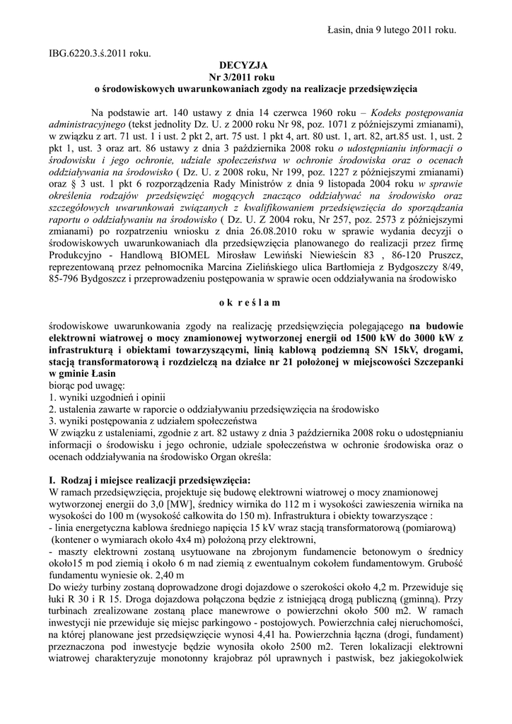 Łasin, dnia 9 lutego 2011 roku. IBG.6220.3.ś.2011 roku. DECYZJA Nr 3/2011 roku o środowiskowych uwarunkowaniach zgody na realizacje przedsięwzięcia Na podstawie art. 140 ustawy z dnia 14 czerwca 1960 roku – Kodeks postępowania administracyjnego (tekst jednolity Dz. U. z 2000 roku Nr 98, poz. 1071 z późniejszymi zmianami), w związku z art. 71 ust. 1 i ust. 2 pkt 2, art. 75 ust. 1 pkt 4, art. 80 ust. 1, art. 82, art.85 ust. 1, ust. 2 pkt 1, ust. 3 oraz art. 86 ustawy z dnia 3 października 2008 roku o udostępnianiu informacji o środowisku i jego ochronie, udziale społeczeństwa w ochronie środowiska oraz o ocenach oddziaływania na środowisko ( Dz. U. z 2008 roku, Nr 199, poz. 1227 z późniejszymi zmianami) oraz § 3 ust. 1 pkt 6 rozporządzenia Rady Ministrów z dnia 9 listopada 2004 roku w sprawie określenia rodzajów przedsięwzięć mogących znacząco oddziaływać na środowisko oraz szczegółowych uwarunkowań związanych z kwalifikowaniem przedsięwzięcia do sporządzania raportu o oddziaływaniu na środowisko ( Dz. U. Z 2004 roku, Nr 257, poz. 2573 z późniejszymi zmianami) po rozpatrzeniu wniosku z dnia 26.08.2010 roku w sprawie wydania decyzji o środowiskowych uwarunkowaniach dla przedsięwzięcia planowanego do realizacji przez firmę Produkcyjno - Handlową BIOMEL Mirosław Lewiński Niewieścin 83 , 86-120 Pruszcz, reprezentowaną przez pełnomocnika Marcina Zielińskiego ulica Bartłomieja z Bydgoszczy 8/49, 85-796 Bydgoszcz i przeprowadzeniu postępowania w sprawie ocen oddziaływania na środowisko ok reślam środowiskowe uwarunkowania zgody na realizację przedsięwzięcia polegającego na budowie elektrowni wiatrowej o mocy znamionowej wytworzonej energii od 1500 kW do 3000 kW z infrastrukturą i obiektami towarzyszącymi, linią kablową podziemną SN 15kV, drogami, stacją transformatorową i rozdzielczą na działce nr 21 położonej w miejscowości Szczepanki w gminie Łasin biorąc pod uwagę: 1. wyniki uzgodnień i opinii 2. ustalenia zawarte w raporcie o oddziaływaniu przedsięwzięcia na środowisko 3. wyniki postępowania z udziałem społeczeństwa W związku z ustaleniami, zgodnie z art. 82 ustawy z dnia 3 października 2008 roku o udostępnianiu informacji o środowisku i jego ochronie, udziale społeczeństwa w ochronie środowiska oraz o ocenach oddziaływania na środowisko Organ określa: I. Rodzaj i miejsce realizacji przedsięwzięcia: W ramach przedsięwzięcia, projektuje się budowę elektrowni wiatrowej o mocy znamionowej wytworzonej energii do 3,0 [MW], średnicy wirnika do 112 m i wysokości zawieszenia wirnika na wysokości do 100 m (wysokość całkowita do 150 m). Infrastruktura i obiekty towarzyszące : - linia energetyczna kablowa średniego napięcia 15 kV wraz stacją transformatorową (pomiarową) (kontener o wymiarach około 4x4 m) położoną przy elektrowni, - maszty elektrowni zostaną usytuowane na zbrojonym fundamencie betonowym o średnicy około15 m pod ziemią i około 6 m nad ziemią z ewentualnym cokołem fundamentowym. Grubość fundamentu wyniesie ok. 2,40 m Do wieży turbiny zostaną doprowadzone drogi dojazdowe o szerokości około 4,2 m. Przewiduje się łuki R 30 i R 15. Droga dojazdowa połączona będzie z istniejącą drogą publiczną (gminną). Przy turbinach zrealizowane zostaną place manewrowe o powierzchni około 500 m2. W ramach inwestycji nie przewiduje się miejsc parkingowo - postojowych. Powierzchnia całej nieruchomości, na której planowane jest przedsięwzięcie wynosi 4,41 ha. Powierzchnia łączna (drogi, fundament) przeznaczona pod inwestycje będzie wynosiła około 2500 m2. Teren lokalizacji elektrowni wiatrowej charakteryzuje monotonny krajobraz pól uprawnych i pastwisk, bez jakiegokolwiek znaczenia przyrodniczego który pozostanie w stanie istniejącym. Otoczenie działki przewidzianej -2pod inwestycję stanowią tereny o różnej charakterystyce zagospodarowania – w przeważającej większości tereny w postaci pól uprawnych, dróg lokalnych, tereny z roślinnością przeważnie niską i incydentalnie wysoką. Teren przewidziany pod inwestycje stanowi użytek rolny sklasyfikowany jako klasa RIIIa, RIIIb; RIVa. Działki przewidziane pod inwestycje nadal będą mogły być wykorzystywane do produkcji (uprawy) rolnej. Poza terenem zajętym przez wieżę i urządzenia naziemne powstanie droga dojazdowa która będzie mogła być wykorzystywana do komunikacji przy uprawie. Najbliższa zabudowa mieszkalna znajduje w odległości ponad 500 m od planowanej lokalizacji wieży elektrowni wiatrowej. W najbliższym otoczeniu przedsięwzięcia nie występują obszary objęte ochroną na podstawie ustawy z dnia 16 kwietnia 2004 r. o ochronie przyrody. Ze względu na odległość od obszarów chronionych nie występuje prawdopodobieństwo znacznego oddziaływania przedsięwzięcia na obszary podlegające ochronie na podstawie przepisów o ochronie przyrody. Jednocześnie, planowane przedsięwzięcie zlokalizowane jest poza elementami przyrodniczymi środowiska wymienionymi w art. 66 ust. 2 ustawy z dnia 3 października 2008 r. o udostępnieniu informacji o środowisku i jego ochronie, udziale społeczeństwa w ochronie środowiska oraz o ocenach oddziaływania na środowisko, tj. poza obszarami Natura 2000. Planowane przedsięwzięcie zostanie zrealizowane na działce o nr 21 obręb Szczepanki, gmina Łasin. Na obszarze gminy znajduje się jeden uznany rezerwat przyrody "Dolina Osy". Rezerwat o całkowitej powierzchni 665,12 ha został uznany Zarządzeniem Ministra Środowiska, Zasobów Naturalnych i Leśnictwa z dnia 13 czerwca 1994 r. Celem ochrony rezerwatu jest zachowanie ze względów naukowych, dydaktycznych i krajobrazowych dolnego odcinka doliny rzeki Osy z nie zmienioną szatą roślinną. W skład rezerwatu wchodzą tereny gmin Rogóźno, Gruta i Łasin. Powierzchnia rezerwatu na terenie gminy Łasin wynosi 218,3 ha. Ochroną objęto części obrębów Nowe Mosty, Szczepank