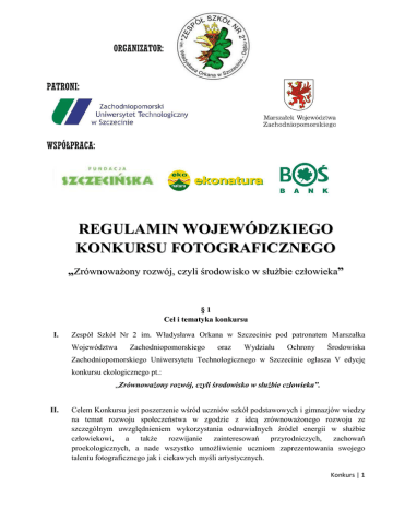 ORGANIZATOR: PATRONI: WSPÓŁPRACA: REGULAMIN WOJEWÓDZKIEGO KONKURSU FOTOGRAFICZNEGO „Zrównoważony rozwój, czyli środowisko w służbie człowieka” §1 Cel i tematyka konkursu I. Zespół Szkół Nr 2 im. Władysława Orkana w Szczecinie pod patronatem Marszałka Województwa Zachodniopomorskiego oraz Wydziału Ochrony Środowiska Zachodniopomorskiego Uniwersytetu Technologicznego w Szczecinie ogłasza V edycję konkursu ekologicznego pt.: „Zrównoważony rozwój, czyli środowisko w służbie człowieka”. II. Celem Konkursu jest poszerzenie wśród uczniów szkół podstawowych i gimnazjów wiedzy na temat rozwoju społeczeństwa w zgodzie z ideą zrównoważonego rozwoju ze szczególnym uwzględnieniem wykorzystania odnawialnych źródeł energii w służbie człowiekowi, a także rozwijanie zainteresowań przyrodniczych, zachowań proekologicznych, a nade wszystko umożliwienie uczniom zaprezentowania swojego talentu fotograficznego jak i ciekawych myśli artystycznych. Konkurs | 1 §2 Zasady konkursu I. Konkurs skierowany jest do uczniów szkół podstawowych i gimnazjalnych województwa zachodniopomorskiego, II. Do konkursu mogą zostać zgłoszone jedynie te fotografie, które nie zostały uprzednio zgłoszone do innego konkursu, nie były nigdzie publikowane ani nagrodzone, III. Udział w konkursie jest bezpłatny i dobrowolny, IV. Jury zastrzega sobie prawo do zdyskwalifikowania prac, które będą sprzeczne z niniejszym regulaminem. §3 Uczestnictwo Jeden uczestnik może zgłosić do konkursu nie więcej niż 6 zdjęć w formacie 20/30 cm wraz z wersją elektroniczną zapisaną na nośniku CD, I. II. Zgłoszenie do konkursu polega na: - wypełnieniu elektronicznego formularza zgłoszeniowego dostępnego pod adresem: http://zs2.szczecin.pl/konkurs-wojewodzki/ - dołączeniu podpisanej imieniem i nazwiskiem płyty CD z nagranymi zdjęciami w formacie JPG, zgłaszanymi na konkurs (rozdzielczość min. 3,2 Mpix, zalecana 5 Mpix), - dołączeniu odbitek na papierze fotograficznym w formacie 20x30cm i opatrzonych imieniem i nazwiskiem uczestnika, tytułem pracy oraz podaniem grupy wiekowej, Prace konkursowe należy przesłać lub dostarczyć osobiście do sekretariatu szkoły w nieprzekraczalnym terminie do dnia 22.02.2013r. III. Adres: Zespół Szkół Nr 2 im. Władysława Orkana, ul. Portowa 21, 70-833 Szczecin (decyduje data stempla pocztowego), z dopiskiem: „Konkurs fotograficzny – „Zrównoważony rozwój, czyli środowisko w służbie człowieka” IV. Przy obróbce zdjęć konkursowych dopuszcza się zastosowanie korekty tonacji, kontrastu, konwersje do czerni-bieli, kadrowanie oraz drobny retusz. V. Uczestnik przystępując do Konkursu oświadcza, że jest autorem nadesłanych zdjęć oraz posiada do nich całość praw autorskich majątkowych i osobistych. VI. Uczestnik przystępując do Konkursu zawiera umowę nieodpłatnego przekazania całości praw autorskich majątkowych na rzecz organizatora Konkursu, Konkurs | 2 VII. Uczestnik zachowuje prawa autorskie osobiste do utworów zgłaszanych na Konkurs, VIII. Organizator nie zwraca prac biorących udział w konkursie, prac zdyskwalifikowanych, wyłączonych z niego i dostarczonych po terminie. Nadesłane prace stają się własnością organizatora, IX. Uczestnicy nieletni, którzy nie ukończyli 18 roku życia, mogą brać udział w Konkursie pod warunkiem uzyskania odpowiedniej zgody od swych opiekunów prawnych i wypełnienia załącznika nr 1 do niniejszego regulaminu. X. Zgłoszenie prac do Konkursu jest jednoznaczne z wyrażeniem zgody na publikowanie danych osobowych zgodnie z ustawą z dnia 29.08.1997 roku o ochronie danych osobowych (Dz. U. Nr 133 poz. 883). XI. W konkursie zostały ustalone dwie grupy wiekowe: pierwsza grupa wiekowa – uczniowie szkół podstawowych druga grupa wiekowa – uczniowie szkół gimnazjalnych §4 Nagrody I. II. Miejsca I, II, III, o których mowa wyżej, nie mogą być łączone ani przyznane ex aequo. Lista nagrodzonych autorów zdjęć zostanie opublikowana na stronie internetowej ZS Nr 2 do dnia 5 marca 2013r. III. Decyzja Komisji w sprawie przyznania nagród jest ostateczna i nie podlega odwołaniu. IV. Spośród uczestników Konkursu jury wybierze laureatów oraz wytypuje prace wyróżnione. V. Fotografie wykonane przez laureatów i wyróżnionych w konkursie zostaną opublikowane z podaniem ich danych osobowych. Autorzy tych prac otrzymają pamiątkowe dyplomy. VI. Wyniki zostaną ogłoszone po zakończeniu Konkursu na stronie internetowej Zespołu Szkół Nr 2 – www.zs2.szczecin.pl VII. Ponadto laureaci i osoby wyróżnione zostaną powiadomieni drogą e-mailową lub telefonicznie o wyniku konkursu. VIII. Nagrody i dyplomy wręczone będą podczas uroczystości, która odbędzie się w Zespole Szkół Nr 2 przy ul. Portowej 21 w Szczecinie-Dąbiu. Uczestnicy na podsumowanie konkursu przyjeżdżają na koszt własny. Konkurs | 3 §5 Dodatkowe informacje I. Dodatkowe informacje na temat Konkursu można otrzymać kierując zapytanie do Koordynatorów: mgr Mariusz Dubojski – [email protected] mgr inż. Katarzyna Wakuła – [email protected] Konkurs | 4 Załącznik 1 OŚWIADCZENIE § 1 Wyrażam zgodę na udział mojego podopiecznego / dziecka Imię i nazwisko: ............................................................................................................................... wiek: ......................................................... w konkursie fotograficznym „Zrównoważony rozwój, czyli środowisko w służbie człowieka” organizowanym przez Zespół Szkół Nr 2 im. Władysława Orkana w Szczecinie, zwanego dalej ZS 2. § 2 Oświadczam, że mój podopieczny/ dziecko jest autorem dostarczonego zdjęcia/ zdjęć. § 3 Wyrażam zgodę na nieodpłatne wykorzystywanie przez ZS 2 nadesłanych zdjęć w dowolnym czasie i formie dla celów promocji Konkursu oraz podanie imion i nazwisk autorów. Jednocześnie wyrażam zgodę na nieodpłatne prz