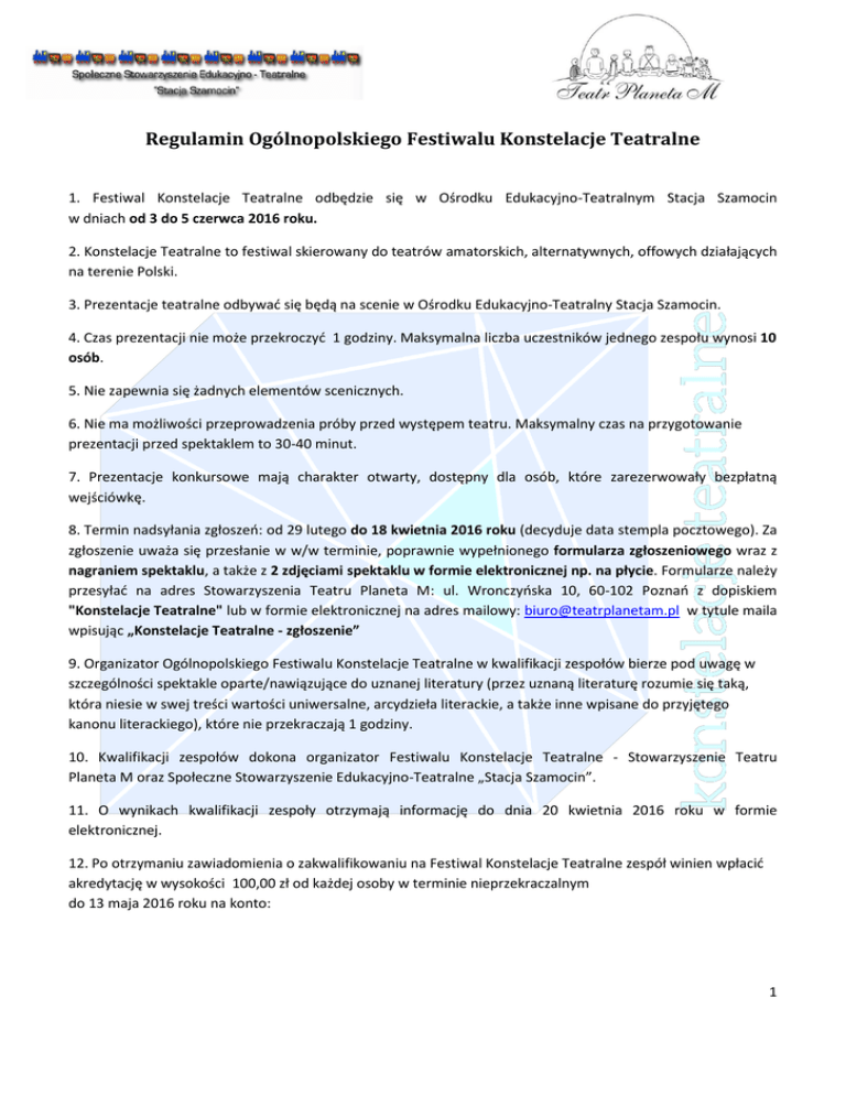 Regulamin Ogólnopolskiego Festiwalu Konstelacje Teatralne 1. Festiwal Konstelacje Teatralne odbędzie się w Ośrodku Edukacyjno-Teatralnym Stacja Szamocin w dniach od 3 do 5 czerwca 2016 roku. 2. Konstelacje Teatralne to festiwal skierowany do teatrów amatorskich, alternatywnych, offowych działających na terenie Polski. 3. Prezentacje teatralne odbywać się będą na scenie w Ośrodku Edukacyjno-Teatralny Stacja Szamocin. 4. Czas prezentacji nie może przekroczyć 1 godziny. Maksymalna liczba uczestników jednego zespołu wynosi 10 osób. 5. Nie zapewnia się żadnych elementów scenicznych. 6. Nie ma możliwości przeprowadzenia próby przed występem teatru. Maksymalny czas na przygotowanie prezentacji przed spektaklem to 30-40 minut. 7. Prezentacje konkursowe mają charakter otwarty, dostępny dla osób, które zarezerwowały bezpłatną wejściówkę. 8. Termin nadsyłania zgłoszeń: od 29 lutego do 18 kwietnia 2016 roku (decyduje data stempla pocztowego). Za zgłoszenie uważa się przesłanie w w/w terminie, poprawnie wypełnionego formularza zgłoszeniowego wraz z nagraniem spektaklu, a także z 2 zdjęciami spektaklu w formie elektronicznej np. na płycie. Formularze należy przesyłać na adres Stowarzyszenia Teatru Planeta M: ul. Wronczyńska 10, 60-102 Poznań z dopiskiem "Konstelacje Teatralne" lub w formie elektronicznej na adres mailowy: [email protected] w tytule maila wpisując „Konstelacje Teatralne - zgłoszenie” 9. Organizator Ogólnopolskiego Festiwalu Konstelacje Teatralne w kwalifikacji zespołów bierze pod uwagę w szczególności spektakle oparte/nawiązujące do uznanej literatury (przez uznaną literaturę rozumie się taką, która niesie w swej treści wartości uniwersalne, arcydzieła literackie, a także inne wpisane do przyjętego kanonu literackiego), które nie przekraczają 1 godziny. 10. Kwalifikacji zespołów dokona organizator Festiwalu Konstelacje Teatralne - Stowarzyszenie Teatru Planeta M oraz Społeczne Stowarzyszenie Edukacyjno-Teatralne „Stacja Szamocin”. 11. O wynikach kwalifikacji zespoły otrzymają informację do dnia 20 kwietnia 2016 roku w formie elektronicznej. 12. Po otrzymaniu zawiadomienia o zakwalifikowaniu na Festiwal Konstelacje Teatralne zespół winien wpłacić akredytację w wysokości 100,00 zł od każdej osoby w terminie nieprzekraczalnym do 13 maja 2016 roku na konto: 1 Bank Zachodni WBK 39 1090 2734 0000 0001 1933 6354 z dopiskiem „Festiwal Konstelacje Teatralne – akredytacja-nazwa teatru” 13. Jest możliwość uczestniczenia w festiwalu jako obserwator. Termin zgłoszenia do 20 maja 2016 r. Do 25 maja 2016r. należy uiścić opłatę akredytacyjną w wysokości 200,00 zł na konto podane w pkt. 11 regulaminu. Ilość obserwatorów ograniczona. W kwocie akredytacji jest nocleg, wyżywienie, a także dostęp do wszystkich prezentacji konkursowych oraz imprez towarzyszących. 14. Organizatorzy Festiwalu Konstelacje Teatralne przewidują nagrody pieniężne, rzeczowe w wysokości 2000,00 zł dla zwycięzców konkursu, a także statuetki Konstelacji Teatralnych dla pierwszych trzech miejsc, nagrodę publiczności oraz nagrody specjalne. 15. Nagrody zostaną wręczone podczas uroczystej gali ostatniego dnia festiwalu. Obecność wszystkich uczestników obowiązkowa. 16. Organizator zapewnia uczestnikom Konstelacji Teatralnych: - noclegi (2), - wyżywienie [śniadania (2), obiadokolacje (3)], - udział w omówieniach i konsultacjach prowadzonych przez członków Jury, - udział we wszystkich spektaklach konkursowych, - udział w spektaklach gościnnych i imprezach towarzyszących, - materiały informacyjno-promocyjne. 17. Na festiwal będą przyjmowane zespoły składające się z uczestników, którzy mają ukończone przynajmniej 13 lat. Uczestnicy poniżej 18-stego roku życia zobowiązani są do otrzymania pisemnej zgody od rodzica/prawnego opiekuna na udział w festiwalu. Formularz zgody do pobrania ze strony internetowej www.teatrplanetam.pl 18. Organizatorzy nie zwracają uczestnikom kosztów podróży. 19. Każdy uczestnik powinien zabrać ze sobą na festiwal starą książkę na wymianę z innym uczestnikiem. 20. W sprawach nie ujętych w niniejszym regulaminie decydują Organizatorzy, mając na uwadze pełne zaspokojenie potrzeb uczestników Konstelacji Teatralnych (w miarę posiadania możliwości technicznych i organizacyjnych). 21. Biuro Organizacyjne: Stowarzyszenie Teatru Planeta M ul. Wronczyńska 10 60-102 Poznań tel. 725-690-601 e-mail: [email protected] 2