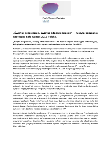 „Świętuj bezpiecznie, świętuj odpowiedzialnie” – ruszyła kampania społeczna Safe Games 2012 Polska. „Świętuj bezpiecznie, świętuj odpowiedzialnie” – to hasło kampanii edukacyjno- informacyjnej, którą Społeczny Komitet ds. AIDS będzie realizował w trakcie turnieju Euro 2012. Kampania, adresowana zarówno do kibiców jak i społeczności lokalnej, ma na celu informowanie oraz uwrażliwianie na konsekwencje, jakie mogą nieść z sobą ryzykowne zachowania podejmowane w trakcie mistrzostw (przypadkowy sex, alkohol i narkotyki). „Po raz pierwszy w Polsce mamy do czynienia z projektem międzysektorowym na taką skalę. Trzy agendy rządowe (Krajowe Centrum ds. AIDS, Krajowe Biuro ds. Przeciwdziałania Narkomanii oraz Główny Inspektorat Sanitarny) i ponad dwudziestu wspaniałych partnerów ze środowiska organizacji pozarządowych przyłączyło się do nas by wspólnie realizować cele kampanii” – mówi Tomasz Małkuszewski, przewodniczący Społecznego Komitetu ds. AIDS inaugurując kampanię. Kampania zwraca uwagę na polską politykę narkotykową – wciąż wyjątkowo restrykcyjną jak na europejskie standardy. „Safe Games jest dla nas ważnym projektem, ponieważ jasno pokazuje, jak różne są nasze regulacje prawne, wobec osób używających narkotyków, od regulacji w innych częściach Europy. Kibice, którzy przyjadą do nas się bawić, mogą nie być świadomi faktu, że to, co jest akceptowane w ich kraju, w Polsce traktowane będzie jako poważne przestępstwo. (…) Safe Games pokazuje, jak bawić się mądrze, bezpiecznie i z głową” - podkreśla Kasia Malinowska-Sempruch, dyrektor Międzynarodowego Programu Polityki Narkotykowej. „Bezpieczeństwo podczas mistrzostw to niezwykle istotna kwestia, dlatego bardzo ważne jest mówienie o zagrożeniach, jakie mogą wynikać z podejmowania przypadkowych kontaktów seksualnych. Włączyłem się w kampanię Safe Games, ponieważ zdaję sobie sprawę, jak ważną rolę odgrywa edukacja. Trzeba mówić wprost, jakie mogą być konsekwencje pójścia z kimś do łóżka bez zabezpieczenia” – apeluje piłkarz Piotr Świerczewski. W 2002 roku piłkarz razem z pięćdziesięcioma innymi sławami footballu wziął udział w realizacji teledysku do piosenki Live for Love United, która symbolizowała działania na rzecz zapobiegania zakażeniom HIV. Kampania będzie działać kompleksowo. „W przygotowanych przez Krajowe Biuro ds. Przeciwdziałania Narkomanii materiałach edukacyjnych mówimy o pigułce gwałtu oraz innych substancjach psychoaktywnych, które mogą być używane przy przestępstwach seksualnych lub podczas zwykłej, ordynarnej kradzieży. Uruchomiliśmy specjalny telefon alarmowy, również dla obcokrajowców. Dzwoniąc pod specjalny numer będzie można uzyskać kompleksowe wsparcie” – tłumaczy dyrektor Piotr Jabłoński. W ramach kampanii Safe Games wolontariusze będą rozdawać prezerwatywy oraz ulotki informacyjne. Będą one zawierały adresy i ważne numery kontaktowe, takie jak informacja turystyczna, telefon zaufania HIV/AIDS, narkotykowy telefon interwencyjny, policja, pogotowie, straż pożarna. Działania wolontariuszy obejmą swym zasięgiem pięć polskich miast: Gdańsk, Kraków, Poznań, Warszawę i Wrocław. Maciej Nazarewicz Społeczny Komitet ds. AIDS [email protected] +48 507 46 51 52 PARTNERZY PROJEKTU: Krajowe Biuro ds. Przeciwdziałania Narkomanii Krajowe Centrum ds. AIDS Główny Inspektorat Sanitarny Astra Youth Centrum Profilaktyki i Edukacji Społecznej Parasol Global Drug Policy program, Open Society Foundations Stowarzyszenie Wolontariuszy Wobec AIDS „Bądź z nami" Stowarzyszenie Pacjentów Substytucyjnych JUMP'93 Krytyka Polityczna Kampania Przeciw Homofobii Stowarzyszenie Lambda Warszawa Fundacja La Strada Stowarzyszenie „Mały Książę" Stowarzyszenie „Podwale Siedem” Polska Sieć Polityki Narkotykowej Fundacja Pomorski Dom Nadziei Grupa Edukatorów Seksualnych „Ponton” Stowarzyszenie „SIEĆ PLUS” Stowarzyszenie SPADOCHRON Stowarzyszenie Program STACJA W konferencji prasowej (6.06.2012) inaugurującej kampanię Safe Games 2012 Polska udział wzięli: Kasia Malinowska- Sempruch – dyrektor Międzynarodowego Programu Polityki Narkotykowej Tomasz Małkuszewski – przewodniczący Społecznego Komitetu ds. AIDS Piotr Jabłoński – dyrektor Krajowego Biura ds. Przeciwdziałania Narkomanii oraz gość specjalny - Piotr Świerczewski