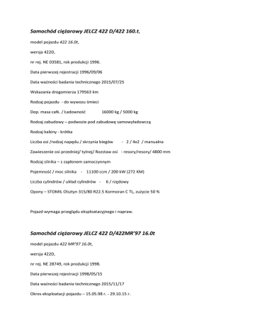 Samochód ciężarowy JELCZ 422 D/422 160.t, model pojazdu 422 16.0t, wersja 422D, nr rej. NE 03581, rok produkcji 1996. Data pierwszej rejestracji 1996/09/06 Data ważności badania technicznego 2015/07/25 Wskazania drogomierza 179563 km Rodzaj pojazdu - do wywozu śmieci Dop. masa całk. / Ładowność 16000 kg / 5000 kg Rodzaj zabudowy – podwozie pod zabudowę samowyładowczą Rodzaj kabiny - krótka Liczba osi /rodzaj napędu / skrzynia biegów - 2 / 4x2 / manualna Zawieszenie osi przedniej/ tylnej/ Rozstaw osi - resory/resory/ 4800 mm Rodzaj silnika – z zapłonem samoczynnym Pojemność / moc silnika - 11100 ccm / 200 kW (272 KM) Liczba cylindrów / układ cylindrów - 6 / rzędowy Opony – STOMIL Olsztyn 315/80 R22.5 Kormoran C TL, zużycie 50 % Pojazd wymaga przeglądu eksploatacyjnego i napraw. Samochód ciężarowy JELCZ 422 D/422MR’97 16.0t model pojazdu 422 MR’97 16.0t, wersja 422D, nr rej. NE 28749, rok produkcji 1998. Data pierwszej rejestracji 1998/05/15 Data ważności badania technicznego 2015/11/17 Okres eksploatacji pojazdu – 15.05.98 r. - 29.10.15 r. Rodzaj pojazdu - do wywozu śmieci Dop. masa całk. 16000 kg Rodzaj zabudowy – podwozie pod zabudowę samowyładowczą Rodzaj kabiny - długi Liczba osi /rodzaj napędu / skrzynia biegów - 2 / 4x2 / manualna Zawieszenie osi przedniej/ tylnej/ Rozstaw osi - resory/resory/ 4800 mm Rodzaj silnika – z zapłonem samoczynnym Pojemność / moc silnika - 11100 ccm / 191 kW (260 KM) Doładowanie - Turbosp. z chłod. powietrza Liczba cylindrów / układ cylindrów - 6 / rzędowy Opony – STOMIL Olsztyn 315/80 R22.5 Kormoran C TL, zużycie 50 % Pojazd wymaga przeglądu eksploatacyjnego i napraw.