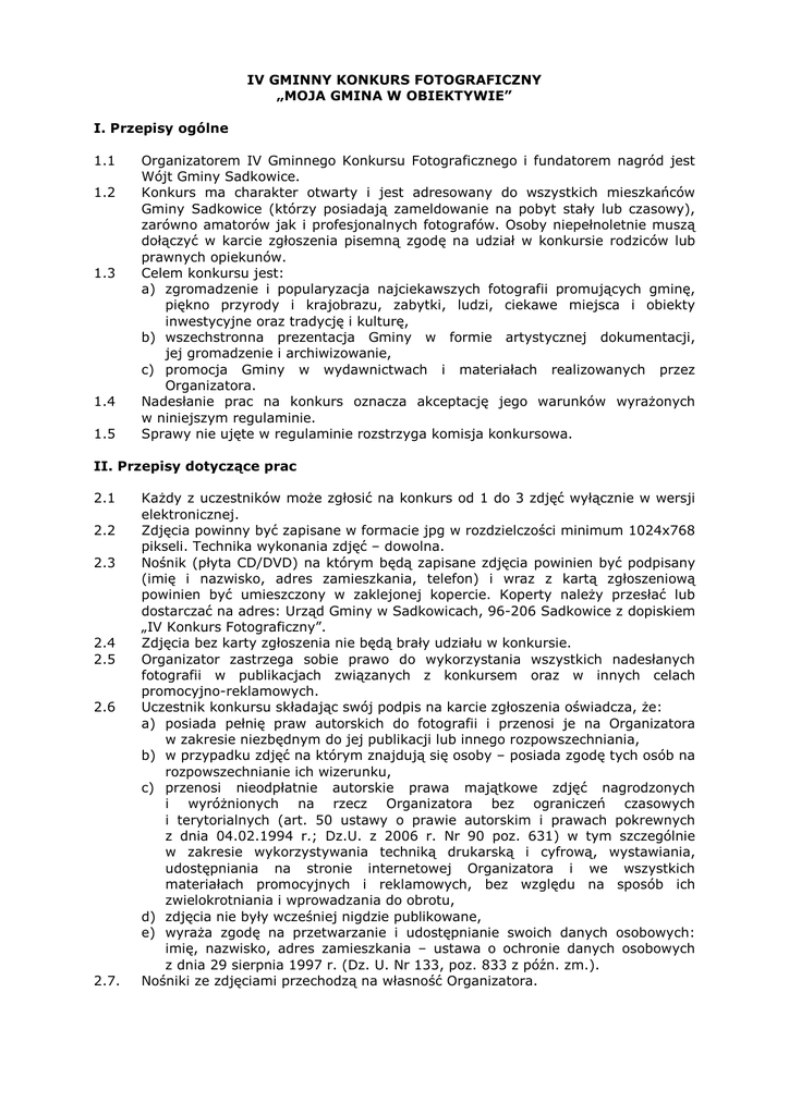 IV GMINNY KONKURS FOTOGRAFICZNY „MOJA GMINA W OBIEKTYWIE” I. Przepisy ogólne 1.1 1.2 1.3 1.4 1.5 Organizatorem IV Gminnego Konkursu Fotograficznego i fundatorem nagród jest Wójt Gminy Sadkowice. Konkurs ma charakter otwarty i jest adresowany do wszystkich mieszkańców Gminy Sadkowice (którzy posiadają zameldowanie na pobyt stały lub czasowy), zarówno amatorów jak i profesjonalnych fotografów. Osoby niepełnoletnie muszą dołączyć w karcie zgłoszenia pisemną zgodę na udział w konkursie rodziców lub prawnych opiekunów. Celem konkursu jest: a) zgromadzenie i popularyzacja najciekawszych fotografii promujących gminę, piękno przyrody i krajobrazu, zabytki, ludzi, ciekawe miejsca i obiekty inwestycyjne oraz tradycję i kulturę, b) wszechstronna prezentacja Gminy w formie artystycznej dokumentacji, jej gromadzenie i archiwizowanie, c) promocja Gminy w wydawnictwach i materiałach realizowanych przez Organizatora. Nadesłanie prac na konkurs oznacza akceptację jego warunków wyrażonych w niniejszym regulaminie. Sprawy nie ujęte w regulaminie rozstrzyga komisja konkursowa. II. Przepisy dotyczące prac 2.1 2.2 2.3 2.4 2.5 2.6 2.7. Każdy z uczestników może zgłosić na konkurs od 1 do 3 zdjęć wyłącznie w wersji elektronicznej. Zdjęcia powinny być zapisane w formacie jpg w rozdzielczości minimum 1024x768 pikseli. Technika wykonania zdjęć – dowolna. Nośnik (płyta CD/DVD) na którym będą zapisane zdjęcia powinien być podpisany (imię i nazwisko, adres zamieszkania, telefon) i wraz z kartą zgłoszeniową powinien być umieszczony w zaklejonej kopercie. Koperty należy przesłać lub dostarczać na adres: Urząd Gminy w Sadkowicach, 96-206 Sadkowice z dopiskiem „IV Konkurs Fotograficzny”. Zdjęcia bez karty zgłoszenia nie będą brały udziału w konkursie. Organizator zastrzega sobie prawo do wykorzystania wszystkich nadesłanych fotografii w publikacjach związanych z konkursem oraz w innych celach promocyjno-reklamowych. Uczestnik konkursu składając swój podpis na karcie zgłoszenia oświadcza, że: a) posiada pełnię praw autorskich do fotografii i przenosi je na Organizatora w zakresie niezbędnym do jej publikacji lub innego rozpowszechniania, b) w przypadku zdjęć na którym znajdują się osoby – posiada zgodę tych osób na rozpowszechnianie ich wizerunku, c) przenosi nieodpłatnie autorskie prawa majątkowe zdjęć nagrodzonych i wyróżnionych na rzecz Organizatora bez ograniczeń czasowych i terytorialnych (art. 50 ustawy o prawie autorskim i prawach pokrewnych z dnia 04.02.1994 r.; Dz.U. z 2006 r. Nr 90 poz. 631) w tym szczególnie w zakresie wykorzystywania techniką drukarską i cyfrową, wystawiania, udostępniania na stronie internetowej Organizatora i we wszystkich materiałach promocyjnych i reklamowych, bez względu na sposób ich zwielokrotniania i wprowadzania do obrotu, d) zdjęcia nie były wcześniej nigdzie publikowane, e) wyraża zgodę na przetwarzanie i udostępnianie swoich danych osobowych: imię, nazwisko, adres zamieszkania – ustawa o ochronie danych osobowych z dnia 29 sierpnia 1997 r. (Dz. U. Nr 133, poz. 833 z późn. zm.). Nośniki ze zdjęciami przechodzą na własność Organizatora. III. Terminarz 3.1. 3.2. 3.3. 3.4. 3.5. 3.6. Termin nadsyłania prac upływa dnia 4.11.2011 r. (decyduje data złożenia w siedzibie Organizatora – Urząd Gminy w Sadkowicach, pok. nr 1, sekretariat). Prace nadesłane po terminie nie będą brały udziału w konkursie. Oceny zdjęć i wyboru nagrodzonych i wyróżnionych dokona powołana przez Organizatora komisja konkursowa. Ocena prac odbędzie się do dnia 25.11.2011 r. Decyzja komisji jest ostateczna i nie podlega weryfikacji. O wynikach konkursu laureaci zostaną powiadomieni do dnia 2.12.2011 r. Wyniki konkursu zostaną również zamieszczone na stronie internetowej Gminy Sadkowice www.gminasadkowice.pl oraz gazetce lokalnej. IV. Nagrody i wyróżnienia 4.1. 4.2. 4.3. Organizator przewiduje przyznanie nagród rzeczowych dla: - I miejsca – Kamera cyfrowa firmy JVC - II miejsca – Aparat cyfrowy firmy Canon - III miejsca – Ramka cyfrowa firmy Intenso Organizator przewiduje również przyznanie wyróżnień w postaci rzeczowej. Wyróżnienie otrzyma również autor zdjęcia, które zdobędzie najwięcej głosów internautów. Głosowanie odbędzie się w terminie od 8.11.2011 r. do 22.11.2011 roku do godz. 1000 na stronie internetowej www.gminasadkowice.pl. Organizator zastrzega sobie prawo nie przyznania, którejś z nagród w konkursie. KONTAKT: 1. Regulamin i karty zgłoszeń można odbierać w Urzędzie Gminy w Sadkowicach pok. nr 5 oraz pobierać ze strony internetowej www.gminasadkowice.pl 2. Szczegółowych informacji można uzyskać pod numerem telefonu: 46 8156191 email: [email protected] 3. Załączniki: karta zgłoszenia. KARTA ZGŁOSZENIA do IV GMINNEGO KONKURSU FOTOGRAFICZNEGO „MOJA GMINA W OBIEKTYWIE” organizowanego przez Gminę Sadkowice ................................................. Imię i nazwisko ............................. telefon ............................................................ adres zamieszkania/korespondencji ...................................... adres e-mail .................................................. data urodzenia ............................................ miejsce wykonania zdjęcia nr 1 .................................... co przedstawia .................................... data wykonania ............................................ miejsce wykonania zdjęcia nr 2 .................................... co przedstawia .................................... data wykonania ............................................ miejsce wykonania zdjęcia nr 3 .................................... co przedstawia .................................... data wykonania OŚWIADCZENIE Ja, niżej podpisana(y), oświadczam, że jestem autorem i wyłącznym właścicielem, dostarczonych zdjęć. Gminie Sadkowice przekazuję prawa autor