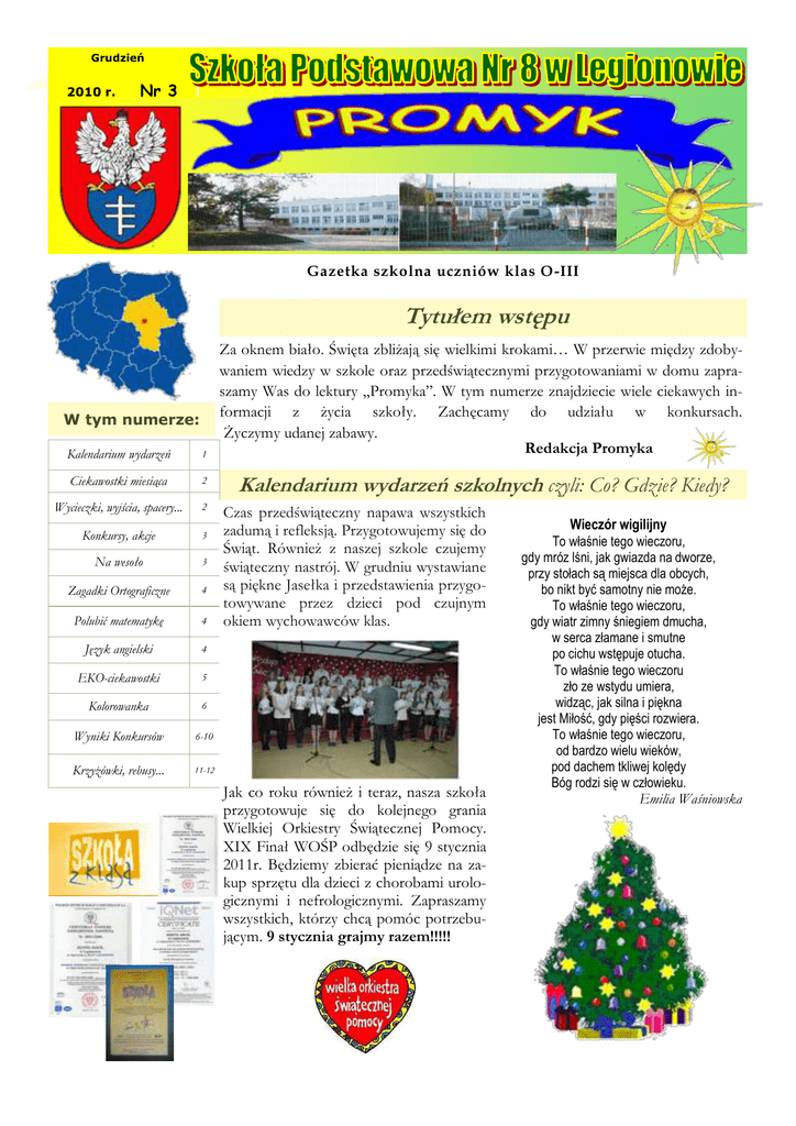 Grudzień 2010 r. Nr 3 Gazetka szkolna uczniów klas O-III Tytułem wstępu W tym numerze: Kalendarium wydarzeń 1 Ciekawostki miesiąca 2 Wycieczki, wyjścia, spacery... 2 Konkursy, akcje 3 Na wesoło 3 Zagadki Ortograficzne 4 Polubić matematykę 4 Język angielski 4 EKO-ciekawostki 5 Kolorowanka 6 Wyniki Konkursów 6-10 Krzyżówki, rebusy... 11-12 Za oknem biało. Święta zbliżają się wielkimi krokami… W przerwie między zdobywaniem wiedzy w szkole oraz przedświątecznymi przygotowaniami w domu zapraszamy Was do lektury „Promyka”. W tym numerze znajdziecie wiele ciekawych informacji z życia szkoły. Zachęcamy do udziału w konkursach. Życzymy udanej zabawy. Redakcja Promyka Kalendarium wydarzeń szkolnych czyli: Co? Gdzie? Kiedy? Czas przedświąteczny napawa wszystkich zadumą i refleksją. Przygotowujemy się do Świąt. Również z naszej szkole czujemy świąteczny nastrój. W grudniu wystawiane są piękne Jasełka i przedstawienia przygotowywane przez dzieci pod czujnym okiem wychowawców klas. Jak co roku również i teraz, nasza szkoła przygotowuje się do kolejnego grania Wielkiej Orkiestry Świątecznej Pomocy. XIX Finał WOŚP odbędzie się 9 stycznia 2011r. Będziemy zbierać pieniądze na zakup sprzętu dla dzieci z chorobami urologicznymi i nefrologicznymi. Zapraszamy wszystkich, którzy chcą pomóc potrzebującym. 9 stycznia grajmy razem!!!!! Wieczór wigilijny To właśnie tego wieczoru, gdy mróz lśni, jak gwiazda na dworze, przy stołach są miejsca dla obcych, bo nikt być samotny nie może. To właśnie tego wieczoru, gdy wiatr zimny śniegiem dmucha, w serca złamane i smutne po cichu wstępuje otucha. To właśnie tego wieczoru zło ze wstydu umiera, widząc, jak silna i piękna jest Miłość, gdy pięści rozwiera. To właśnie tego wieczoru, od bardzo wielu wieków, pod dachem tkliwej kolędy Bóg rodzi się w człowieku. Emilia Waśniowska Str. 2 Promyk Ciekawostki miesiąca 25 grudnia – dzień Bożego Narodzenia, jedno z największych świąt chrześcijańskich, po staropolsku nazywane często Godami. Wigilia Bożego Narodzenia jest dniem niezwykłym i przeżywanym w sposób szczególny. Ludzie wierzą, że dzień ten trzeba przeżyć w zgodzie i harmonii, bez kłótni i płaczu, bo jak spędzisz dzień wigilijny, taki będzie cały następny rok. Tego dnia trzeba wstać wcześnie, aby zachować zdrowie i formę. Nie wolno m.in. pożyczać komuś jakiejś rzeczy, zwłaszcza sąsiadce, aby nie narazić się na biedę. Nie wolno też kłaść się w ciągu dnia – aby nie chorować. Do wieczerzy wigilijnej stół przykrywamy białym obrusem, pod niego wkładamy trochę siana na pamiątkę narodzin Jezusa, okrytego w żłóbku siankiem. Na Wigilię przyrządzamy 12 dań, bo tyle jest miesięcy w roku. Często u sufitu wieszamy zielona jemiołę, która – jak twierdzą niektórzy – odpędza złe duchy, a składane pod nią życzenia zawsze się spełniają. Pięknie przystrajamy choinkę, oczekujemy pierwszej gwiazdki na niebie. Dodatkowe nakrycie na stole przeznaczone jest dla niespodziewanego gościa. Każdy, kto w Wigilię podzieli się opłatkiem przez cały rok nie zazna głodu. Po wieczerzy gospodarz opłatkiem dzieli się ze zwierzętami. Tego dnia o północy, zwierzęta poczęstowane opłatkiem mówią ludzkim głosem. A najbardziej gadatliwy jest pies. W wieczór wigilijny wręczamy sobie prezenty, śpiewamy kolędy. Na ten moment niecierpliwie czekają dzieci. Wigilię i dzień Bożego Narodzenia świętujemy w gronie rodziny, przyjaciół. Uczestniczymy w uroczystej mszy – pasterce, kolędujemy. Polskie zwyczaje bożonarodzeniowe są bardzo bogate. Jednym z najpiękniejszych jest krakowski konkurs szopek, który można oglądać w Muzeum Historycznym tego miasta. Na południu Polski do tej pory zachował się zwyczaj kolędowania. Kolędnicy odwiedzają domy, aby zaśpiewać pastorałkę i złożyć życzenia. Sylwestra obchodzimy hucznie i wesoło. Niektórzy wierzą, że 31 grudnia, gdy zapadnie zmierzch, trzeba włożyć na siebie coś nowego i nosić to do północy – na pewno przyniesie to szczęście. Tego dnia nie należy zaczynać żadnej ważnej pracy, ponieważ można jej nigdy nie skończyć. Na balach, prywatkach i zabawach świętujemy nadejście nowego roku. Składamy sobie życzenia i bawimy się do rana. Wycieczki, wyjścia, spacery… -17 listopada 2010r. klasa I a i d były na wycieczce w Muzeum Etnograficznym w Warszawie. Uczniowie poznali tradycje andrzejkowe, mikołajkowe, adwentowe oraz obejrzeli wystawę szopek bożonarodzeniowych. - 13 grudnia 2010 r. dzieci z klasy IIIb zwiedzały Zamek Królewski. Tematem lekcji muzealnej była: Opowieść królewskiego majstra, czyli jak ozdabiano zamkowe komnaty . -10 grudnia 2010r. klasa 0a i 1c także odwiedziły tę sama wystawę w Muzeum Etnograficznym. Dzieciom najbardziej podobały się ozdoby choinkowe ręcznie wykonane przez artystki ludowe oraz „podróż do Afryki”. Tamtejsze zwyczaje i stroje przypadły wszystkim do gustu. - 15 grudnia 2010r. Kl. 3a i 3d odwiedziły krainę św. Mikołaja w Kołacinku. Dzieci wysłuchały przepowiedni Dziadka Mroza, spotkały się z Mikołajem, który wręczył im kolorowe prezenciki, obejrzały filmy o Bożym Narodzeniu, wykonały kartkę świąteczną. Podczas spaceru odwiedziły Krainę Bajek i wysłuchały opowiadań elfa. Atrakcją było spotkanie z prawdziwymi reniferami. Promyk Str. 3 KONKURSY, AKCJE Konkursy: Przedstawiciele zerówki i pierwszaków brali udział w następujących konkursach: Portret Św. Mikołaja – plastyczny Opowiadanie o wróżce – literacki Dzieci z klas II i III: - Pisały listy do św. Mikołaja oraz tworzyły dalszą część opowieści o tęczowej wróżce. - Trzecioklasiści brali udział w Szkolnym Konkursie Ortograficznym. - Dominik Dziura zdobył nagrodę w konkursie na kartkę świąteczną. - Pamiętajcie o „Wierszach na 4 pory roku”. Do 10 stycznia czekamy na Wasze 