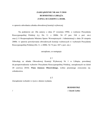 ZARZĄDZENIE NR 444 /V/2010 BURMISTRZA LIBIĄŻA Z DNIA 18 CZERWCA 2010R. w sprawie odwołania członka obwodowej komisji wyborczej Na podstawie art. 20a ustawy z dnia 27 września 1990r. o wyborze Prezydenta Rzeczypospolitej Polskiej (t.j. Dz. U. z 2000r. Nr 47 poz. 544 z poź. zm.) oraz § 11 Rozporządzenia Ministra Spraw Wewnętrznych i Administracji z dnia 28 sierpnia 2000r. w sprawie powoływania obwodowych komisji wyborczych w wyborach Prezydenta Rzeczypospolitej Polskiej (Dz. U. z 2000r. Nr 72 poz. 847 z poź. zm.) zarządzam, co następuje: §1 Odwołuję ze składu Obwodowej Komisji Wyborczej Nr 1 w Libiążu, powołanej do przeprowadzenia wyborów Prezydenta Rzeczypospolitej Polskiej, zarządzonych na dzień 20 czerwca 2010r. Pana Janusza Olszewskiego, wobec pisemnego zrzeczenia się członkostwa. §2 Zarządzenie wchodzi w życie z dniem wydania. BURMISTRZ / -/ Jacek Latko