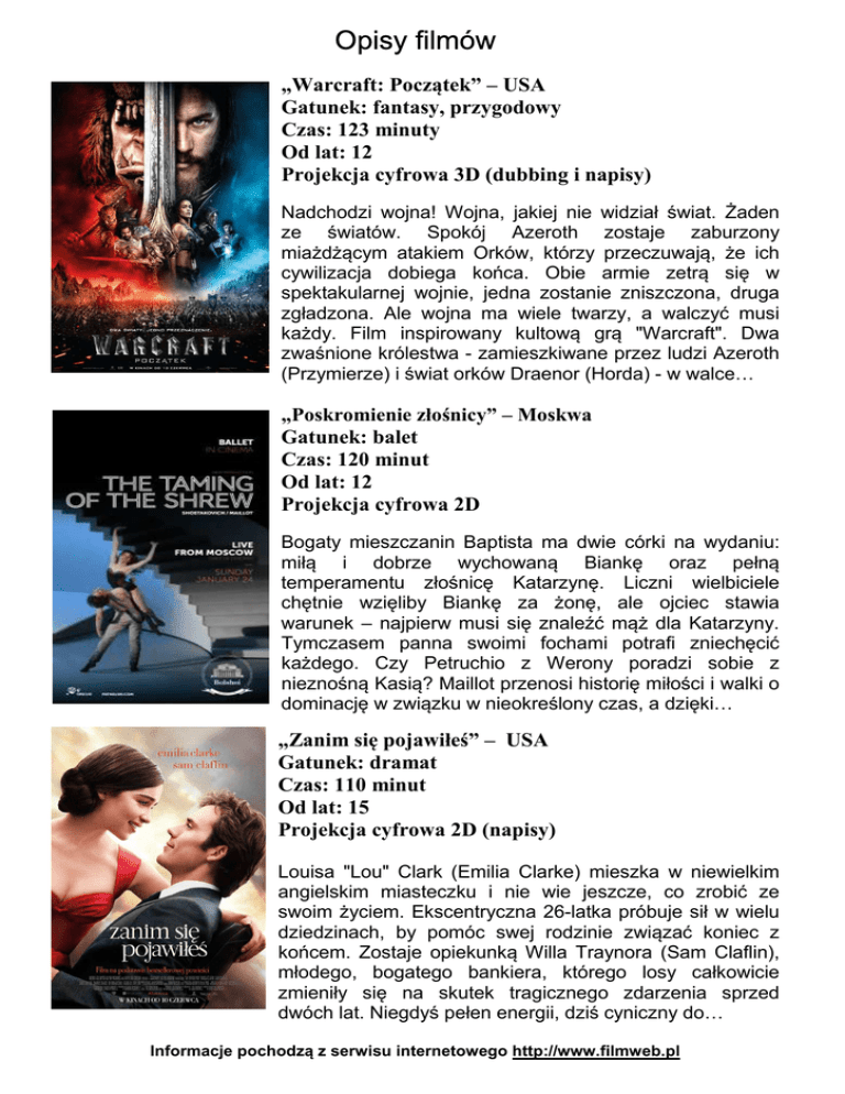 Opisy filmów „Warcraft: Początek” – USA Gatunek: fantasy, przygodowy Czas: 123 minuty Od lat: 12 Projekcja cyfrowa 3D (dubbing i napisy) Nadchodzi wojna! Wojna, jakiej nie widział świat. Żaden ze światów. Spokój Azeroth zostaje zaburzony miażdżącym atakiem Orków, którzy przeczuwają, że ich cywilizacja dobiega końca. Obie armie zetrą się w spektakularnej wojnie, jedna zostanie zniszczona, druga zgładzona. Ale wojna ma wiele twarzy, a walczyć musi każdy. Film inspirowany kultową grą "Warcraft". Dwa zwaśnione królestwa - zamieszkiwane przez ludzi Azeroth (Przymierze) i świat orków Draenor (Horda) - w walce… „Poskromienie złośnicy” – Moskwa Gatunek: balet Czas: 120 minut Od lat: 12 Projekcja cyfrowa 2D Bogaty mieszczanin Baptista ma dwie córki na wydaniu: miłą i dobrze wychowaną Biankę oraz pełną temperamentu złośnicę Katarzynę. Liczni wielbiciele chętnie wzięliby Biankę za żonę, ale ojciec stawia warunek – najpierw musi się znaleźć mąż dla Katarzyny. Tymczasem panna swoimi fochami potrafi zniechęcić każdego. Czy Petruchio z Werony poradzi sobie z nieznośną Kasią? Maillot przenosi historię miłości i walki o dominację w związku w nieokreślony czas, a dzięki… „Zanim się pojawiłeś” – USA Gatunek: dramat Czas: 110 minut Od lat: 15 Projekcja cyfrowa 2D (napisy) Louisa "Lou" Clark (Emilia Clarke) mieszka w niewielkim angielskim miasteczku i nie wie jeszcze, co zrobić ze swoim życiem. Ekscentryczna 26-latka próbuje sił w wielu dziedzinach, by pomóc swej rodzinie związać koniec z końcem. Zostaje opiekunką Willa Traynora (Sam Claflin), młodego, bogatego bankiera, którego losy całkowicie zmieniły się na skutek tragicznego zdarzenia sprzed dwóch lat. Niegdyś pełen energii, dziś cyniczny do… Informacje pochodzą z serwisu internetowego http://www.filmweb.pl Opisy filmów „Tini: Nowe życie Violetty” – Włochy Gatunek: familijny, muzyczny Czas: 100 minut Od lat: 7 Projekcja cyfrowa 2D (dubbing) Scenariusz filmu, odzwierciedlając wątki z pozaekranowego życia Tini, opowiada o tym, jak opuszcza ona świat "Violetty" i samotnie wyrusza po nieznane dotąd doświadczenia. To, co wydarzy się podczas zaledwie jednego lata, odmieni Violettę zarówno jako osobę, jak i artystkę. „Tarzan: Legenda” – USA Gatunek: przygodowy Czas: 109 minut Od lat: 12 Projekcja cyfrowa 3D (dubbing) Mijają lata, od kiedy Tarzan (Skarsgård), opuścił afrykańską dżunglę na rzecz cywilizowanego życia w Londynie. Jako John Clayton III, Lord Greystoke decyduje się wrócić do Konga, gdzie ma pełnić funkcję emisariusza rządu z misją handlową. Nie zdaje sobie jednak sprawy z tego, że jest pionkiem w śmiertelnie niebezpiecznej grze targanego wolą zemsty, chciwego kapitana Leona Roma z Belgii (Waltz). Okazuje się, że osoby stojące … „Dzień Niepodległości: Odrodzenie” – USA Gatunek: akcja, sci-fi Czas: 120 minut Od lat: 12 Projekcja cyfrowa 2D (napisy) Kontynuacja jednego z największych przebojów światowego kina ostatnich lat. Widowiskowa opowieść o inwazji przedstawicieli obcej cywilizacji na naszą planetę. Po najeździe przedstawicieli obcej cywilizacji na Ziemię ludzie wykorzystali pozostawione przez nich zdobycze techniki do budowy supernowoczesnego i skutecznego systemu obronnego dla całej naszej planety. Nic jednak nie mogło przygotować nas na ponowny atak obcych… Informacje pochodzą z serwisu internetowego http://www.filmweb.pl