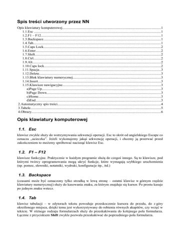 Spis treści utworzony przez NN Opis klawiatury komputerowej............................................................................................................1 1.1.Esc ............................................................................................................................................1 1.2.F1 – F12....................................................................................................................................1 1.3.Backspace.................................................................................................................................1 1.4.Tab............................................................................................................................................1 1.5.Caps Lock.................................................................................................................................2 1.6.Enter..........................................................................................................................................2 1.7.Shift...........................................................................................................................................2 1.8.Ctrl............................................................................................................................................2 1.9.Alt.............................................................................................................................................2 1.10.Caps lock.................................................................................................................................2 1.11.Spacja......................................................................................................................................3 1.12.Delete......................................................................................................................................3 1.13.Blok klawiatury numerycznej.................................................................................................3 1.14.Insert.......................................................................................................................................3 1.15.Klawisze nawigacyjne............................................................................................................3 a)Page Up...................................................................................................................................3 b)Page Down..............................................................................................................................3 c)Home.......................................................................................................................................3 d)End..........................................................................................................................................3 2.Automatyczny spis treści..................................................................................................................4 3.Tabele................................................................................................................................................5 4.Obrazy..............................................................................................................................................6 Opis klawiatury komputerowej 1.1. Esc klawisz zwykle służy do wstrzymywania sekwencji operacji. Esc to skrót od angielskiego Escape co oznacza „ucieczka”. Jeżeli wykonujemy jakąś sekwencję operacji, i chcemy ją przerwać przed zakończeniem to możemy spróbować nacisnąć klawisz Esc. 1.2. F1 – F12 klawisze funkcyjne. Praktycznie w każdym programie służą do czegoś innego. Są to klawisze, pod którymi twórcy oprogramowania mogą ukryć funkcje, które wymagają szybkiego uruchomienia (np. pomoc, słowniki, notatniki, wydruki, konfiguracje itp., itd.) 1.3. Backspace (czasami może być oznaczony tylko strzałką w lewą stronę – ostatni klawisz w górnym rzędzie klawiatury numerycznej) służy do kasowania znaku, za którym znajduje się kursor. Po prostu kasuje po jednym znaku wstecz. 1.4. Tab klawisz tabulacji – w edytorach tekstu powoduje przeskoczenie kursora do przodu, do z góry określonego miejsca, dzięki temu jest wykorzystywany do robienia równych akapitów, czy wcięć w tekście. W różnego rodzaju formularzach służy do przeskakiwania do kolejnego pola formularza. Łącznie z przyciskiem Shift zwykle pozwala przeskakiwać do poprzedniego pola formularza. 1.5. Caps Lock po naciśnięciu tego klawisza zapala się na klawiaturze dioda. Po ponownym wciśnięciu dioda gaśnie. Gdy dioda jest zapalona wszystkie litery pisane są dużymi znakami. Gdy podczas pisania liter wciśnięty będzie Shift wówczas zamiast dużych będziemy pisali małymi znakami. Caps Lock odnosi skutek tylko do liter. Klawisze z wydrukowanymi podwójnymi znakami (jak cyfry) nadal działają jak dawniej tzn. dolny znak jest drukowany po wciśnięciu klawisza, a górny, gdy równocześnie był wciśnięty Shift. Należy zwrócić uwagę podczas wpisywania hasła, czy dioda Caps Lock jest zgaszona, gdyż dla komputera małe i duże litery to całkowicie różne znaki. Wpisując hasło nie widzimy jakich liter używamy. 1.6. Enter (po angielsku – WEJŚCIE) – klawisz służy do zatwierdzania wszelkich operacji. W edytorach tekstu powoduje natychmiastowe przejście kursora do nowej linii. 1.7. Shift klawisz służący do zmiany działania klawiatury. Samo wciskanie Shift nie daje żadnych rezultatów. Dlatego można go spokojnie nacisnąć i trzymać jad długo się nam podoba. Podczas gdy ten klawisz jest wciśnięty zmienia się znaczenie innych klawiszy – litery zmieniają wielkość, pisane są znaki wydrukowane na górze klawiszy. Są dwa klawisze Shift prawy i lewy. Oba mają takie samo działanie. 1.8. Ctrl (Control) klawisz mający za zadanie zmodyfikować d