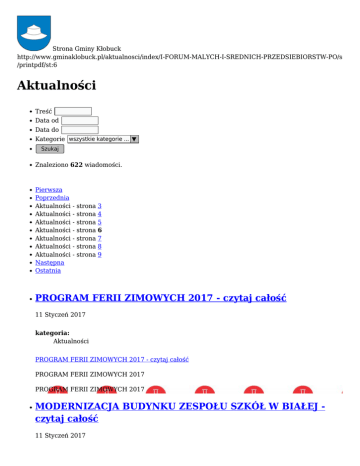 Strona Gminy Kłobuck http://www.gminaklobuck.pl/aktualnosci/index/I-FORUM-MALYCH-I-SREDNICH-PRZEDSIEBIORSTW-PO/s /printpdf/st:6 Aktualności Treść Data od Data do Kategorie wszystkie kategorie ... ▼ Szukaj Znaleziono 622 wiadomości. Pierwsza Poprzednia Aktualności - strona 3 Aktualności - strona 4 Aktualności - strona 5 Aktualności - strona 6 Aktualności - strona 7 Aktualności - strona 8 Aktualności - strona 9 Następna Ostatnia PROGRAM FERII ZIMOWYCH 2017 - czytaj całość 11 Styczeń 2017 kategoria: Aktualności PROGRAM FERII ZIMOWYCH 2017 - czytaj całość PROGRAM FERII ZIMOWYCH 2017 PROGRAM FERII ZIMOWYCH 2017 MODERNIZACJA BUDYNKU ZESPOŁU SZKÓŁ W BIAŁEJ czytaj całość 11 Styczeń 2017 kategoria: Aktualności MODERNIZACJA BUDYNKU ZESPOŁU SZKÓŁ W BIAŁEJ - czytaj całość MODERNIZACJA BUDYNKU ZESPOŁU SZKÓŁ W BIAŁEJ MODERNIZACJA BUDYNKU ZESPOŁU SZKÓŁ W BIAŁEJ KOLĘDOWANIE Z ANTKIEM SMYKIEWICZEM - czytaj całość 10 Styczeń 2017 kategoria: Aktualności KOLĘDOWANIE Z ANTKIEM SMYKIEWICZEM - czytaj całość KOLĘDOWANIE Z ANTKIEM SMYKIEWICZEM KOLĘDOWANIE Z ANTKIEM SMYKIEWICZEM SPOTKANIE ŚWIĄTECZNE W BIAŁEJ - czytaj całość 10 Styczeń 2017 kategoria: Aktualności SPOTKANIE ŚWIĄTECZNE W BIAŁEJ - czytaj całość SPOTKANIE ŚWIĄTECZNE W BIAŁEJ SPOTKANIE ŚWIĄTECZNE W BIAŁEJ APEL DO HODOWCÓW DROBIU - czytaj całość 09 Styczeń 2017 kategoria: Aktualności APEL DO HODOWCÓW DROBIU - czytaj całość APEL DO HODOWCÓW DROBIU APEL DO HODOWCÓW DROBIU ANKIETER MOŻE ZAPUKAĆ DO DRZWI... - czytaj całość 09 Styczeń 2017 kategoria: Aktualności ANKIETER MOŻE ZAPUKAĆ DO DRZWI... - czytaj całość ANKIETER MOŻE ZAPUKAĆ DO DRZWI... ANKIETER MOŻE ZAPUKAĆ DO DRZWI... I KŁOBUCKI ORSZAK TRZECH KRÓLI - czytaj całość 09 Styczeń 2017 kategoria: Aktualności I KŁOBUCKI ORSZAK TRZECH KRÓLI - czytaj całość I KŁOBUCKI ORSZAK TRZECH KRÓLI I KŁOBUCKI ORSZAK TRZECH KRÓLI KONFERENCJA DLA TRENERÓW I SPORTOWCÓW - czytaj całość 05 Styczeń 2017 kategoria: Aktualności KONFERENCJA DLA TRENERÓW I SPORTOWCÓW - czytaj całość KONFERENCJA DLA TRENERÓW I SPORTOWCÓW KONFERENCJA DLA TRENERÓW I SPORTOWCÓW INFORMACJA - czytaj całość 05 Styczeń 2017 kategoria: Aktualności INFORMACJA - czytaj całość INFORMACJA INFORMACJA ZAGROŻENIA ZIMOWE - czytaj całość 04 Styczeń 2017 kategoria: Aktualności ZAGROŻENIA ZIMOWE - czytaj całość ZAGROŻENIA ZIMOWE ZAGROŻENIA ZIMOWE Pierwsza Poprzednia Aktualności - strona 3 Aktualności - strona 4 Aktualności - strona 5 Aktualności - strona 6 Aktualności - strona 7 Aktualności - strona 8 Aktualności - strona 9 Następna Ostatnia