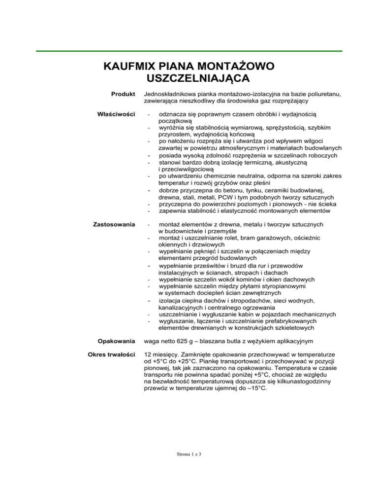 KAUFMIX PIANA MONTAŻOWO USZCZELNIAJĄCA Produkt Właściwości Jednoskładnikowa pianka montażowo-izolacyjna na bazie poliuretanu, zawierająca nieszkodliwy dla środowiska gaz rozprężający - - Zastosowania - - Opakowania Okres trwałości odznacza się poprawnym czasem obróbki i wydajnością początkową wyróżnia się stabilnością wymiarową, sprężystością, szybkim przyrostem, wydajnością końcową po nałożeniu rozpręża się i utwardza pod wpływem wilgoci zawartej w powietrzu atmosferycznym i materiałach budowlanych posiada wysoką zdolność rozprężenia w szczelinach roboczych stanowi bardzo dobrą izolację termiczną, akustyczną i przeciwwilgociową po utwardzeniu chemicznie neutralna, odporna na szeroki zakres temperatur i rozwój grzybów oraz pleśni dobrze przyczepna do betonu, tynku, ceramiki budowlanej, drewna, stali, metali, PCW i tym podobnych tworzy sztucznych przyczepna do powierzchni poziomych i pionowych - nie ścieka zapewnia stabilność i elastyczność montowanych elementów montaż elementów z drewna, metalu i tworzyw sztucznych w budownictwie i przemyśle montaż i uszczelnianie rolet, bram garażowych, ościeżnic okiennych i drzwiowych wypełnianie pęknięć i szczelin w połączeniach między elementami przegród budowlanych wypełnianie prześwitów i bruzd dla rur i przewodów instalacyjnych w ścianach, stropach i dachach wypełnianie szczelin wokół kominów i okien dachowych wypełnianie szczelin między płytami styropianowymi w systemach dociepleń ścian zewnętrznych izolacja cieplna dachów i stropodachów, sieci wodnych, kanalizacyjnych i centralnego ogrzewania uszczelnianie i wygłuszanie kabin w pojazdach mechanicznych wygłuszanie, łączenie i uszczelnianie prefabrykowanych elementów drewnianych w konstrukcjach szkieletowych waga netto 625 g – blaszana butla z wężykiem aplikacyjnym 12 miesięcy. Zamknięte opakowanie przechowywać w temperaturze od +5°C do +25°C. Piankę transportować i przechowywać w pozycji pionowej, tak jak zaznaczono na opakowaniu. Temperatura w czasie transportu nie powinna spadać poniżej +5°C, chociaż ze względu na bezwładność temperaturową dopuszcza się kilkunastogodzinny przewóz w temperaturze ujemnej do –15°C. Strona 1 z 3 DANE TECHNICZNE Ciężar właściwy po utwardzeniu Baza Wydajność Pyłosuchość Czas obróbki Czas utwardzania Odporność na promienie UV Struktura komórek Odporność termiczna po utwardzeniu Rozprężalność Wytrzymałość na rozciąganie Odporność na wyginanie Wytrzymałość na ścinanie Stabilność wymiarowa Izolacyjność Klasa palności Opór elektryczny właściwy ok. 16-24 g/l * wg ISO 7390: 25-35 kg/m³ * poliuretan do 40 l - w zależności od temperatury i wilgotności powietrza: * 10-15 minut * 60-100 minut * 5-24h (pełna obciążalność mechaniczna) * Konieczny jest swobodny dostęp powietrza. Nie należy stosować pianki w pomieszczeniach szczelnie zamkniętych. słaba W zastosowaniach zewnętrznych powierzchnię pianki należy chronić przed promieniowaniem UV. ok. 70% wyrównanych, równomiernie zamkniętych komórek od –40°C do +90°C (któtkookresowo do +140°C) od 100 do 150% w ciągu 30-45 minut po nałożeniu * wg normy DIN 53456: 0,14 Mpa wg normy DIN 53423: 0,28 Mpa wg normy DIN 53422: 0,48 Mpa - 5% * 30-35 mW/mK wg normy DIN 4102-1: B3 5*1015 Ω/m (*) – silna zależność od temperatury otoczenia, wilgotności powietrza oraz podłoża, temperatury puszki, sposobu zastosowania, przekroju nałożonej warstwy, zwilżenia podłoża itp. ROZMIARY SPOIN Minimalna szerokość Maksymalna szerokość Zalecane proporcje 6 mm 40 mm Szerokość spoiny w mm: 10 20 30 40 Głębokość spoiny w mm: 80 60 40 30 W celu uzyskania żądanej głębokości spoiny stosować profile dylatacyjne. PODŁOŻA Rodzaje powierzchni Przygotowanie Stan podłoża Większość spotykanych w budownictwie materiałów, w tym: drewno, beton, cegła, żelazo, aluminium i inne metale, tworzywa sztuczne (twarde PCW, Styropor, PU, poliester itp.). Brak przyczepności do polietylenu, silikonu i teflonu. Dla zwiększenia przyczepności, przyspieszenia utwardzania i poprawy struktury, podłoże zaleca się wstępnie zwilżyć wodą za pomocą rozpylacza. Powierzchnia musi być czysta, wolna od kurzu, tłuszczu, smaru i innych zanieczyszczeń. Strona 2 z 3 SPOSÓB UŻYCIA Temperatura podłoża od +2°C do +35°C Temperatura otoczenia od +5°C do +35°C Optymalna temperatura puszki Zalecenia +20°C Butlę należy przed użyciem silnie wstrząsnąć kilkanaście razy (zimą 20-30 razy) celem odpowiedniego wymieszania składników pianki w butli. Butlę przed użyciem przechowywać w temperaturze pokojowej. Pianka wężykowa to pianka jednorazowego użytku, więc należy ją całkowicie zużyć. W przeciwnym wypadku piana zacznie utwardzać się w wężyku i zaworze, co uniemożliwi wydobycie z butli reszty piany. Jeżeli przerwa w pracy trwała ponad 5 minut, butlę z pianą należy przed użyciem ponownie wstrząsnąć. Zdjąć nakrętkę. Nakręcić plastikowy wężyk na zawór. Uruchomić zawór przez naciśnięcie spustu. W czasie pracy butlę trzymać dnem do góry. W ciągu 60-100 minut pianka zwiększy swoją objętość o minimum kilkadziesiąt procent w stosunku do objętości początkowej oraz ok. 45 razy w stosunku do pojemności butli, zatem zaleca się wypełniać szczelinę roboczą w ok. 40% (50% w przypadku większych szczelin). Spoiny szersze niż 4 cm i głębsze niż 5 cm powinny być wypełniane warstwowo. Przed nałożeniem kolejnej warstwy odczekać 15-25 minut i ponownie zwilżyć podłoże wodą. Nie stosować w miejscach pozbawionych dostępu powietrza, narażonych na ciągłe oddziaływanie wody i bezpośredni wpływ promieni słonecznych (osłonić powierzchnię pianki). Podczas pracy z pianką zaleca się nosić odzież ochronną, rękawice i okulary. Podłogi, ściany i meble powinny być zabezpieczone folią plastikową lub papie