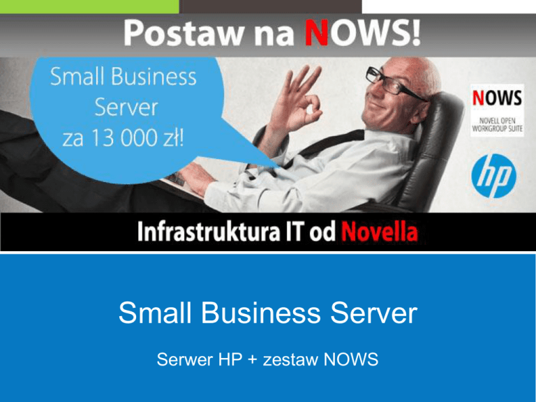 Small Business Server Serwer HP + zestaw NOWS Co to jest NOWS? Novell Open Workgroup Suite (NOWS) to: • zestaw 10 rozwiązań w 1 pakiecie • narzędzia do budowy infrastruktury IT całej firmy • produkty dla użytkowników i dla działu IT • rozwiązania kompatybilne z MS Windows, Linux i MacOS Wolność i zgodność z NOWS! Zgodność z różnymi systemami Otwartość na inne rozwiązania Wbudowana wirtualizacja NOWS – zawartość pakietu Systemy operacyjne SUSE Linux Enterprise Server - profesjonalny system Linux na serwery Novell Open Enterprise Server - system serwerowy z usługami sieciowymi Zarządzanie punktami końcowymi Novell ZENworks Configuration Management - zarządzanie sprzętem i oprogramowaniem ZENworks Endpoint Security Management - bezpieczeństwo punktów końcowych Novell Service Desk – Help Desk, obsługa zgłoszeń pomocy technicznej Współpraca grupowa i projektowa Novell GroupWise - bezpieczna i niezawodna poczta oraz praca grupowa Novell Vibe - narzędzie do pracy projektowej, obszary robocze, repozytorium plików GroupWise Mobility Service – synchronizowanie poczty, kalendarzy i zadań Dodatkowe oprogramowanie Domain Services for Windows – usługa katalogowa, symuluje MS Active Directory * Novell FILr – udostępnianie i synchronizacja plików dla urządzeń mobilnych * Novell iPrint Appliance – serwer wydruku, drukowanie bez ingerencji działu IT * Dostępne z aktywnym maintenance Serwer HP ProLiant ML350e Gen8 v2 E5-2407v2, 4 GB-U B120i, zasilacz 460 W/GO (741774-425) • • • Procesor Intel® Xeon® E5-2407 v2 (4 rdzenie, 2,4 GHz) 32 GB (4x8 GB) pamięci w modułach RDIMM 3 dyski LFF 1TB SATA • • • • Napęd SATA DWD-RW JackBlack Zasilacz 460W Karta sieciowa Ethernet 1 Gb 361i, 2 porty na kontroler Kontroler Dynamic Smart Array B120i/512 MB FBWC Standardowa wersja serwera została powiększona o 24GB RAM i 2 dyski o pojemności 1TB) Propozycja rozwiązania Cena 13000zł dotyczy rozwiązania obejmującego serwer HP i 20 licencji NOWS Do promocji dobrano serwer, na którym można uruchomić 4 wybrane rozwiązania na platformie witalizacyjnej XEN, np.: 1. Poczta i praca grupowa – Novell GroupWise 2. Zarzadzanie środowiskiem IT – Novell ZENworks 3. Usługa katalogowa – eDirectory i Domain Services for Windows 4. System operacyjny SUSE Linux Enterprise Server Systemy serwerowe Poczta i praca grupowa Zarządzanie komputerami i serwerami Usługa katalogowa Praca projektowa Aplikacje WEB Help-Desk Udostępnianie plików i serwer wydruku Wirtualizacja oparta o SUSE Linux i XEN Uwaga! Jest to tylko propozycja rozwiązań. Pozostałe opcje z pakietu NOWS są również do wykorzystania. Ilość licencji NOWS można zwiększyć wykupując kolejne 5-paki NOWS po 1250zł. Pomoc techniczna NOWS 24x7 PL Lokalna pomoc techniczna w języku polskim! W Polsce znajduje się dział obsługi technicznej Novell. Zgłoszenia są obsługiwane lokalnie w języku polskim. Obsługa techniczna w wersji „Priority 24x7”, obejmuje: nieograniczoną pomoc techniczną świadczoną drogą mailową przez 24 godziny na dobę przez 7 dni w tygodniu (dostępna codziennie przez całą dobę, czas reakcji 4 godziny oraz 1 godzina w przypadku zatrzymania serwera) NOWS – jeden zakup, a tyle możliwości Licencjonowanie Zestaw NOWS SBS jest sprzedawany w paczkach po 5 licencji Licencje NOWS for Small Business można kupić: na użytkownika na urządzenie • Dla firm do maksymalnie 200 licencji • Sprzedawany w paczkach po 5 licencji • Ograniczenie do 5 serwerów fizycznych • Brak ograniczenia co do ilości systemów wirtualnych • Nie licencjonujemy urządzeń sieciowych! Ceny Pierwszy zakup – 1250zł za 5 licencj !!! Cena obejmuje licencję wieczystą na oprogramowanie i usługi utrzymania na rok (wsparcie i dostęp do najnowszych wersji oprogramowania) Kolejny rok utrzymania – 350zł / 5lic (w przypadku zakupu z nową licencją) Zakup usług utrzymania nie jest obowiązkowy Standardowe odnowienie po roku 700zł za 5 licencji NOWS Porównanie składników Zagadnienie System operacyjny serwerowy Serwer poczty i pracy grupowej Praca projektowa-zespołowa, intranet, wiki, repozytorium dokumentów Zarządzanie stacjami i serwerami, konfiguracją, dystrybucja oprogramowania, zdalny pulpit, obrazy systemów Bezpieczeństwo stacji, firewall, kontrola sieci, portów i aplikacji, szyfrowanie urządzeń USB, polityki bezpieczeństwa Obsługa zgłoszeń technicznych, Help-Desk Kontrolowany dostęp do firmowych plików i synchronizacja danych pomiędzy urządzeniami mobilnymi Usługa katalogowa Produkt w NOWS SUSE Linux Enterprise Server 11, Open Enterprise Server 11 GroupWise VIBE ZENworks Configuration Management Przykłady konkurencji Microsoft Windows Server 2012, Redhat, Debian, CentOS, Ubuntoo Microsoft Exchange, IBM Lotus Domino, Zarafa, Zimbra, PostFix Microsoft Sharepoint, IBM Lotus Domino i Notes Microsoft System Center, IBM Tivoli, LanDesk, Symantec Altiris, Axence, Microsoft System Center, IBM Tivoli, ZENworks LanDesk, Symantec Altiris, Axence, Endpoint Security Management eAuditor, Service Desk for Incident Management Wszelkie produkty Service Desk Novell FILr DropBox, Google Drive, SkyDrive, OwnCloud, Citrix ShareFile eDirectory Microsoft ActiveDirectory 250zł za 1 licencję i 10 rozwiązań Novell TESTUJ https://download.novell.com PISZ [email protected] DZWOŃ: GSM: 601 50 66 65 www.nows.pl