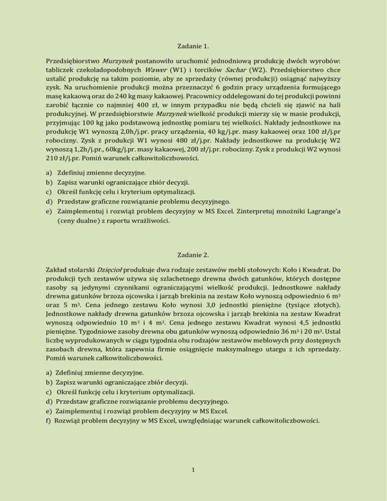 Zadanie 1. Przedsiębiorstwo Murzynek postanowiło uruchomić jednodniową produkcję dwóch wyrobów: tabliczek czekoladopodobnych Wawer (W1) i torcików Sachar (W2). Przedsiębiorstwo chce ustalić produkcję na takim poziomie, aby ze sprzedaży (równej produkcji) osiągnąć najwyższy zysk. Na uruchomienie produkcji można przeznaczyć 6 godzin pracy urządzenia formującego masę kakaową oraz do 240 kg masy kakaowej. Pracownicy oddelegowani do tej produkcji powinni zarobić łącznie co najmniej 400 zł, w innym przypadku nie będą chcieli się zjawić na hali produkcyjnej. W przedsiębiorstwie Murzynek wielkość produkcji mierzy się w masie produkcji, przyjmując 100 kg jako podstawową jednostkę pomiaru tej wielkości. Nakłady jednostkowe na produkcję W1 wynoszą 2,0h/j.pr. pracy urządzenia, 40 kg/j.pr. masy kakaowej oraz 100 zł/j.pr robocizny. Zysk z produkcji W1 wynosi 480 zł/j.pr. Nakłady jednostkowe na produkcję W2 wynoszą 1,2h/j.pr., 60kg/j.pr. masy kakaowej, 200 zł/j.pr. robocizny. Zysk z produkcji W2 wynosi 210 zł/j.pr. Pomiń warunek całkowitoliczbowości. a) b) c) d) e) Zdefiniuj zmienne decyzyjne. Zapisz warunki ograniczające zbiór decyzji. Określ funkcję celu i kryterium optymalizacji. Przedstaw graficzne rozwiązanie problemu decyzyjnego. Zaimplementuj i rozwiąż problem decyzyjny w MS Excel. Zinterpretuj mnożniki Lagrange’a (ceny dualne) z raportu wrażliwości. Zadanie 2. Zakład stolarski Dzięcioł produkuje dwa rodzaje zestawów mebli stołowych: Koło i Kwadrat. Do produkcji tych zestawów używa się szlachetnego drewna dwóch gatunków, których dostępne zasoby są jedynymi czynnikami ograniczającymi wielkość produkcji. Jednostkowe nakłady drewna gatunków brzoza ojcowska i jarząb brekinia na zestaw Koło wynoszą odpowiednio 6 m 3 oraz 5 m3. Cena jednego zestawu Koło wynosi 3,0 jednostki pieniężne (tysiące złotych). Jednostkowe nakłady drewna gatunków brzoza ojcowska i jarząb brekinia na zestaw Kwadrat wynoszą odpowiednio 10 m3 i 4 m3. Cena jednego zestawu Kwadrat wynosi 4,5 jednostki pieniężne. Tygodniowe zasoby drewna obu gatunków wynoszą odpowiednio 36 m3 i 20 m3. Ustal liczbę wyprodukowanych w ciągu tygodnia obu rodzajów zestawów meblowych przy dostępnych zasobach drewna, która zapewnia firmie osiągnięcie maksymalnego utargu z ich sprzedaży. Pomiń warunek całkowitoliczbowości. a) Zdefiniuj zmienne decyzyjne. b) Zapisz warunki ograniczające zbiór decyzji. c) Określ funkcję celu i kryterium optymalizacji. d) Przedstaw graficzne rozwiązanie problemu decyzyjnego. e) Zaimplementuj i rozwiąż problem decyzyjny w MS Excel. f) Rozwiąż problem decyzyjny w MS Excel, uwzględniając warunek całkowitoliczbowości. 1 Zadanie 3. Nowo otwarte przedsiębiorstwo kosmetyczne Zioja planuje rozpocząć produkcję szamponu do włosów normalnych. Podstawowymi składnikami szamponu będą olej arganowy jako substancja witalna (dalej: x1) oraz laurylosiarczan sodu (SLS, dalej: x2) jako substancja myjąca. Przedsiębiorstwo planuje wyprodukować na początek 15 hektolitrów szamponu. Technolodzy przedsiębiorstwa poinformowali zarząd, iż najlepszą kombinacją obu składników dla przebadanych próbek włosów normalnych będzie proporcja 1 jednostki SLS względem 4 jednostek oleju, przy czym im wyższa będzie zawartość obu składników, tym lepiej dla struktury włosów. f1(x1, x2) = 4x1 + 1x2 → maks. [1] SLS wykazuje silne właściwości pieniące, co bardzo cenią konsumenci, marketingowcy przedsiębiorstwa twierdzą, iż najlepszą kombinacją obu składników pod względem pierwszego wrażenia konsumenta będzie proporcja prawie 2 jednostek SLS względem 1 jednostki oleju, przy czym im wyższa będzie zawartość obu składników, tym lepiej: f2(x1, x2) = 4x1 + 7,5x2 → maks. [2] Z racji na możliwości techniczne magazynowania obu substancji należy spełnić ograniczenie, które podyktowane jest m.in. właściwościami żrącymi siarczanu (stąd współczynnik dla x2 jest wyższy): 1x1 + 2x2 ≤ 12 Aby spełnić wymagania Państwowego Zakładu Higieny (PZH) nie wolno przekroczyć zawartości 4 jednostek SLS w planowanej produkcji. W ocenie PZH jest to substancja w większych ilościach negatywnie wpływająca na strukturę lipidową skóry głowy: x2 ≤ 4 Olej arganowy jest importowany na rynek polski tylko z Maroka, możliwości jego zakupu w krótkim okresie są ograniczone: x1 ≤ 6 Obie zmienne muszą również spełniać warunek nieujemności. a) Rozwiąż rzeczony problem decyzyjny. Wybierz, czy będziesz kierować się wskazaniami technologów czy marketingowców. b) Na podstawie wygenerowanego raportu wrażliwości określ, czy zmiana funkcji celu (z proponowanej przez marketingowców na tą promowaną przez technologów albo na odwrót) spowoduje zmianę optymalności rozwiązania. c) Określ, które z warunków są napięte, a które luźne. 2
