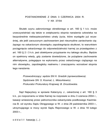 POSTANOWIENIE Z DNIA 3 CZERWCA 2004 R. V KK 37/04 Skutek czynu zabronionego określonego w art. 160 § 1 k.k. może urzeczywistniać się także w zwiększeniu stopnia narażenia człowieka na bezpośrednie niebezpieczeństwo utraty życia, które wystąpiło już wcześniej, ale jeśli zarzuconym zachowaniem jest nieumyślne zaniechanie ciążącego na oskarżonym obowiązku zapobiegnięcia skutkowi, to warunkiem pociągnięcia oskarżonego do odpowiedzialności karnej za przestępstwo z art. 160 § 2 i 3 k.k. jest obiektywne przypisanie mu takiego skutku. Będzie on spełniony wtedy, gdy zostanie dowiedzione, że pożądane zachowanie alternatywne, polegające na wykonaniu przez oskarżonego ciążącego na nim obowiązku, zapobiegłoby realnemu i znaczącemu wzrostowi stopnia tego narażenia. Przewodniczący: sędzia SN H. Gradzik (sprawozdawca). Sędziowie SN: S. Kosmal, L. Misiurkiewicz. Prokurator Prokuratury Krajowej: B. Drozdowska. Sąd Najwyższy w sprawie Katarzyny J., oskarżonej z art. 160 § 3 k.k., po rozpoznaniu w Izbie Karnej na rozprawie w dniu 3 czerwca 2004 r., kasacji wniesionej przez pełnomocnika oskarżyciela posiłkowego Kazimierza B. od wyroku Sądu Okręgowego w W. z dnia 29 października 2003 r., utrzymującego w mocy wyrok Sądu Rejonowego w W. z dnia 18 lutego 2003 r., o d d a l i ł kasację; (...) 2 Z uzasadnienia: Prokurator Rejonowy w W. oskarżył Katarzynę J. o to, że w dniu 31 października 1996 r. w W., działając nieumyślnie jako lekarz Oddziału Wewnętrznego Szpitala Zakładu Karnego, z racji pełnionej funkcji mając obowiązek opieki nad pacjentem Romanem B., uzyskując około godz. 1200 informację o prawdopodobnej przyczynie dolegliwości chorego – zatruciu glikolem i będąc, zgodnie z zasadami wiedzy lekarskiej, zobowiązaną do udzielenia mu pomocy medycznej, zaniechała: niezwłocznego wykonania badań równowagi kwasowo-zasadowej krwi w celu potwierdzenia postawionej diagnozy, podania środka detoksykacyjnego w postaci alkoholu etylowego oraz niezwłocznego przekazania pacjenta do specjalistycznej placówki służby zdrowia, ograniczając się do zlecenia długotrwałych badań krwi na obecność glikolu, przez co naraziła Romana B. na bezpośrednie niebezpieczeństwo utraty życia albo ciężkiego uszczerbku na zdrowiu – tj. o czyn z art. 160 § 3 k.k. Po rozpoznaniu sprawy Sąd Rejonowy w W. wyrokiem z dnia 18 lutego 2003 r. uniewinnił oskarżoną od popełnienia zarzuconego jej czynu. Wyrok ten zaskarżyli Prokurator Rejonowy i pełnomocnik oskarżyciela posiłkowego Kazimierza B. (...) Po rozpoznaniu wniesionych apelacji Sąd Okręgowy w W. wyrokiem z dnia 29 października 2003 r. utrzymał w mocy zaskarżony wyrok. Pełnomocnik oskarżyciela posiłkowego wniósł kasację od prawomocnego wyroku uniewinniającego oskarżoną. (...) Sąd Najwyższy zważył, co następuje: Bezzasadny w stopniu oczywistym jest pierwszy z podniesionych w kasacji zarzutów, wskazujący na naruszenie przepisów art. 160 § 2 i 3 k.k. Metodologicznie wadliwe jest stawianie w środku odwoławczym, czy też 3 nadzwyczajnym środku zaskarżenia, zarzutu obrazy prawa materialnego, gdy skarżący kwestionuje zarazem ustalenia faktyczne przyjęte za podstawę orzeczenia. Taką właśnie niepoprawnością obarczony jest, zamieszczony w kasacji zarzut obrazy prawa materialnego. Z treści drugiego zarzutu kasacji wynika przecież, że skarga kasacyjna wymierzona jest przede wszystkim w podstawę faktyczną rozstrzygnięcia merytorycznego. Podnosi się bowiem, że na skutek rażącego naruszenia prawa procesowego nie ustalono, iż oskarżona, na której ciążył obowiązek opieki lekarskiej nad Romanem B., doprowadziła do pogłębienia grożącego mu bezpośrednio niebezpieczeństwa utraty życia. Skoro jednak skarżący przyjmuje, że w prawomocnym wyroku nie poczyniono takich ustaleń, to stawianie w kasacji zarzutu obrazy wymienionych przepisów prawa materialnego przez ich błędną wykładnię, jawi się jako rażąco nietrafne i wręcz niezrozumiałe. Brak takich ustaleń wykluczał przecież uznanie, że oskarżona popełniła czyn zabroniony, określony w art. 160 § 2 i 3 k.k. Szerszego omówienia wymaga drugi zarzut kasacji. Rozpocząć trzeba od konstatacji ogólnej, że sąd odwoławczy aprobował stanowisko sądu pierwszej instancji, iż oskarżona nie doprowadziła do istotnego zwiększenia niebezpieczeństwa utraty życia Romana B., które istniało już w chwili, gdy przejęła nad nim opiekę medyczną. Sąd drugiej instancji uznał przy tym, że Sąd Rejonowy ustalając, iż oskarżona nie dopuściła się zaniedbań, które zmniejszyły szanse przeżycia pacjenta, nie naruszył granic swobodnej oceny dowodów (art. 7 k.p.k.). W kasacji pełnomocnik oskarżyciela posiłkowego po raz kolejny zmierzał do zakwestionowania podstawy faktycznej rozstrzygnięcia merytorycznego. Taki kierunek podważania zgodności z prawem prawomocnego wyroku nie dyskwalifikuje kasacji z tego już powodu, że błąd w ustaleniach faktycznych nie należy do uchybień stanowiących rażące naruszenie prawa. Skarżący nie podniósł bowiem zarzutu błędnych ustaleń, lecz zarzut 4 rażącego naruszenia w wyroku sądu odwoławczego prawa procesowego, które w jego przekonaniu wywarło istotny wpływ na rezultat instancyjnej kontroli ustaleń faktycznych. To zaś jest w kasacji dopuszczalne (por. wyrok SN z dnia 25 czerwca 2003 r., V KK 93/03, OSNKW 2003, z. 7-8, poz. 72). Przed bliższym odniesieniem się do zarzutu obrazy przepisów prawa procesowego nieodzowne staje się przypomnienie następujących bezspornych faktów. W dniu 31 października 1996 r. o godz. 700 Roman B. został przyjęty do oddziału chirurgicznego szpitala w Zakładzie Karnym. Ostre objawy patologiczne wskazywały na potrzebę przeprowadzenia operacji połączonej z otwarciem jamy brzusznej. Po dokonaniu stosownych badań lekarze wykluczyli jednak celowość wykonania takiego zabiegu. Po w