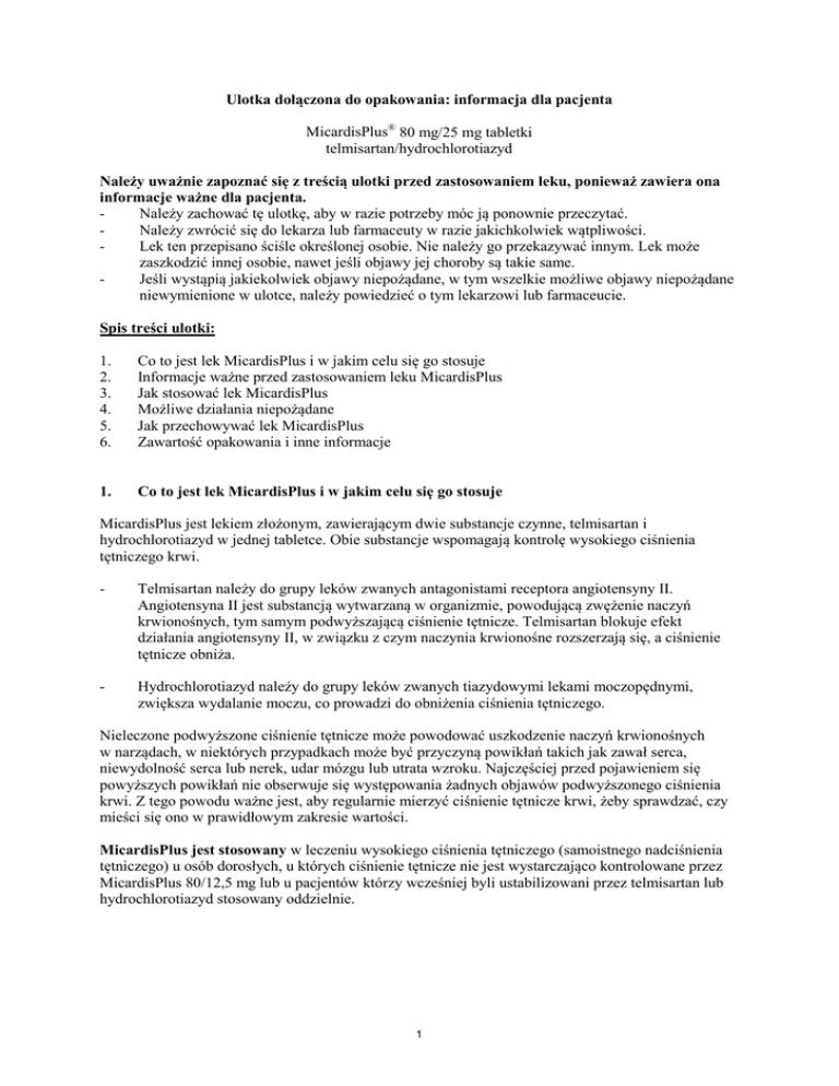 Ulotka dołączona do opakowania: informacja dla pacjenta MicardisPlus® 80 mg/25 mg tabletki telmisartan/hydrochlorotiazyd Należy uważnie zapoznać się z treścią ulotki przed zastosowaniem leku, ponieważ zawiera ona informacje ważne dla pacjenta. Należy zachować tę ulotkę, aby w razie potrzeby móc ją ponownie przeczytać. Należy zwrócić się do lekarza lub farmaceuty w razie jakichkolwiek wątpliwości. Lek ten przepisano ściśle określonej osobie. Nie należy go przekazywać innym. Lek może zaszkodzić innej osobie, nawet jeśli objawy jej choroby są takie same. Jeśli wystąpią jakiekolwiek objawy niepożądane, w tym wszelkie możliwe objawy niepożądane niewymienione w ulotce, należy powiedzieć o tym lekarzowi lub farmaceucie. Spis treści ulotki: 1. 2. 3. 4. 5. 6. Co to jest lek MicardisPlus i w jakim celu się go stosuje Informacje ważne przed zastosowaniem leku MicardisPlus Jak stosować lek MicardisPlus Możliwe działania niepożądane Jak przechowywać lek MicardisPlus Zawartość opakowania i inne informacje 1. Co to jest lek MicardisPlus i w jakim celu się go stosuje MicardisPlus jest lekiem złożonym, zawierającym dwie substancje czynne, telmisartan i hydrochlorotiazyd w jednej tabletce. Obie substancje wspomagają kontrolę wysokiego ciśnienia tętniczego krwi. - Telmisartan należy do grupy leków zwanych antagonistami receptora angiotensyny II. Angiotensyna II jest substancją wytwarzaną w organizmie, powodującą zwężenie naczyń krwionośnych, tym samym podwyższającą ciśnienie tętnicze. Telmisartan blokuje efekt działania angiotensyny II, w związku z czym naczynia krwionośne rozszerzają się, a ciśnienie tętnicze obniża. - Hydrochlorotiazyd należy do grupy leków zwanych tiazydowymi lekami moczopędnymi, zwiększa wydalanie moczu, co prowadzi do obniżenia ciśnienia tętniczego. Nieleczone podwyższone ciśnienie tętnicze może powodować uszkodzenie naczyń krwionośnych w narządach, w niektórych przypadkach może być przyczyną powikłań takich jak zawał serca, niewydolność serca lub nerek, udar mózgu lub utrata wzroku. Najczęściej przed pojawieniem się powyższych powikłań nie obserwuje się występowania żadnych objawów podwyższonego ciśnienia krwi. Z tego powodu ważne jest, aby regularnie mierzyć ciśnienie tętnicze krwi, żeby sprawdzać, czy mieści się ono w prawidłowym zakresie wartości. MicardisPlus jest stosowany w leczeniu wysokiego ciśnienia tętniczego (samoistnego nadciśnienia tętniczego) u osób dorosłych, u których ciśnienie tętnicze nie jest wystarczająco kontrolowane przez MicardisPlus 80/12,5 mg lub u pacjentów którzy wcześniej byli ustabilizowani przez telmisartan lub hydrochlorotiazyd stosowany oddzielnie. 1 2. Informacje ważne przed zastosowaniem leku MicardisPlus Kiedy nie stosować leku MicardisPlus • jeśli pacjent ma uczulenie na telmisartan lub którykolwiek z pozostałych składników tego leku (wymienione w punkcie 6); • jeśli pacjent ma uczulenie na hydrochlorotiazyd lub pochodne sulfonamidów; • po trzecim miesiącu ciąży. (Również należy unikać stosowania leku MicardisPlus we wczesnym okresie ciąży – patrz punkt „Ciąża”); • jeśli u pacjenta występuje ciężka choroba wątroby, taka jak zastój żółci lub zwężenie dróg żółciowych (zaburzenia odpływu żółci z wątroby i pęcherzyka żółciowego) lub jakakolwiek inna ciężka choroba wątroby; • jeśli pacjent ma ciężką chorobę nerek; • jeśli lekarz stwierdzi występowanie małego stężenia potasu lub dużego stężenia wapnia we krwi, które nie ulegają poprawie na skutek leczenia; • jeśli pacjent ma cukrzycę lub zaburzenia czynności nerek i jest leczony lekiem obniżającym ciśnienie krwi zawierającym aliskiren. Jeżeli którakolwiek powyższa sytuacja dotyczy pacjenta, należy poinformować lekarza lub farmaceutę, przed zażyciem leku MicardisPlus. Ostrzeżenia i środki ostrożności Należy poinformować lekarza, jeśli u pacjenta występują lub występowały którekolwiek z poniższych stanów lub chorób: - - niskie ciśnienie tętnicze krwi (niedociśnienie), którego prawdopodobieństwo wystąpienia jest większe, jeśli pacjent jest odwodniony (nadmierna utrata wody z organizmu) lub ma niedobór soli, z powodu stosowania leków moczopędnych (tabletek odwadniających), diety ubogosolnej, biegunki, wymiotów lub hemodializy; choroba nerek lub przeszczep nerki; zwężenie tętnicy nerkowej (zwężenie naczyń krwionośnych jednej nerki lub obu nerek); choroba wątroby; choroba serca; cukrzyca; dna moczanowa; zwiększone stężenie aldosteronu (zatrzymanie wody i soli w organizmie łącznie z zaburzeniem równowagi elektrolitowej); toczeń rumieniowaty układowy (zwany również „toczniem” lub „SLE”), choroba, w przebiegu której układ odpornościowy atakuje własny organizm; substancja czynna hydrochlorotiazyd może powodować rzadkie reakcje powodujące ograniczenie widzenia i ból oczu. Mogą to być objawy zwiększonego ciśnienia w gałce ocznej, które mogą się pojawić w ciągu kilku godzin do kilku tygodni od przyjęcia leku MicardisPlus. Nieleczone mogą prowadzić do trwałego zaburzenia wzroku. Przed rozpoczęciem stosowania leku MicardisPlus należy omówic to z lekarzem: • jeśli pacjent przyjmuje którykolwiek z poniższych leków stosowanych w leczeniu wysokiego ciśnienia krwi: - inhibitor konwertazy angiotensyny (ACE) (ang. Angiotensin Converting Enzyme Inhibitors, ACEI) (na przykład enalapryl, lizynopryl, ramipryl), w szczególności jeśli pacjent ma zaburzenia czynności nerek związane z cukrzycą. - aliskiren. 2 • Lekarz prowadzący może monitorować czynność nerek, ciśnienie krwi oraz stężenie elektrolitów (np. potasu) we krwi w regularnych odstępach czasu. Patrz także informacje pod nagłówkiem „Kiedy nie stosować leku MicardisPlus”. jeśli pacjent przyjmuje digoksynę. Należy poinformowa