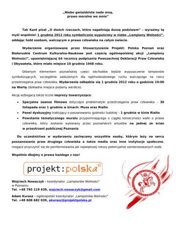 „Niebo gwiaździste nade mną, prawo moralne we mnie” Tak Kant pisał „O dwóch rzeczach, które napełniają duszę podziwem” – wyraźmy tę myśl wspólnie! 1 grudnia 2012 roku symbolicznie wypuścimy w niebo „Lampiony Wolności”, oddając hołd osobom, walczącym o prawa człowieka na całym świecie. Wydarzenie organizowane przez Stowarzyszenie Projekt: Polska Poznań oraz Białoruskie Centrum Kulturalno-Naukowe jest częścią ogólnopolskiej akcji „Lampiony Wolności”, upamiętniającej 64 rocznicę podpisania Powszechnej Deklaracji Praw Człowieka i Obywatela, które miało miejsce 10 grudnia 1948 roku. Głównym elementem poznańskiej części obchodów będzie wypuszczenie lampionów symbolizujących, szczególnie zasłużonych dla ogólnoświatowego ruchu walczącego na rzecz przestrzegania praw człowieka. Wydarzenie odbędzie się 1 grudnia 2012 roku o godzinie 19:00 na Wartą (dokładne miejsce podamy wkrótce). Akcję wzbogacą także liczne imprezy towarzyszące: Specjalne seanse filmowe dotyczące problematyki przestrzegania praw człowieka – 30 listopada oraz 1 grudnia w kinach: Muza oraz Rialto Panel dyskusyjny traktujący o poszanowaniu godności ludzkiej – 1 grudnia w kinie Rialto Powstanie tematycznego muralu przypominającego o ciągłej konieczności walki o prawa człowieka, który zostanie wykonany przez poznańskich artystów na jednej ze ścian w przestrzeni publicznej Poznania Do uczestnictwa w wydarzeniu zachęcamy wszystkie osoby, którym leży na sercu poszanowanie praw drugiego człowieka a także media oraz inne instytucje społeczne, mogące przyczynić się do poinformowania jak największej rzeszy potencjalnie zainteresowanych osób. Wspólnie dbajmy o prawa każdego z nas! Wojciech Nowaczyk - koordynator „Lampionów Wolności” w Poznaniu Tel. +48 795 119 439, [email protected] Adam Kurasz - ogólnopolski koordynator „Lampionów Wolności” Tel. +48 608 682 039, [email protected]