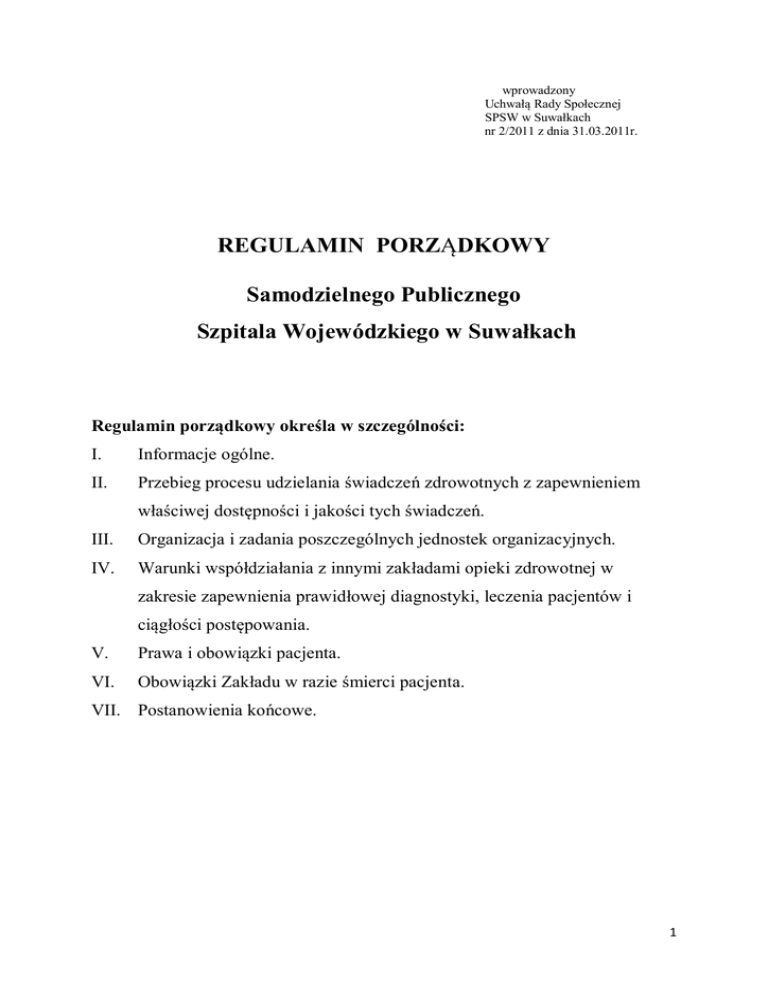 wprowadzony Uchwałą Rady Społecznej SPSW w Suwałkach nr 2/2011 z dnia 31.03.2011r. REGULAMIN PORZĄDKOWY Samodzielnego Publicznego Szpitala Wojewódzkiego w Suwałkach Regulamin porządkowy określa w szczególności: I. Informacje ogólne. II. Przebieg procesu udzielania świadczeń zdrowotnych z zapewnieniem właściwej dostępności i jakości tych świadczeń. III. Organizacja i zadania poszczególnych jednostek organizacyjnych. IV. Warunki współdziałania z innymi zakładami opieki zdrowotnej w zakresie zapewnienia prawidłowej diagnostyki, leczenia pacjentów i ciągłości postępowania. V. Prawa i obowiązki pacjenta. VI. Obowiązki Zakładu w razie śmierci pacjenta. VII. Postanowienia końcowe. 1 I. Informacje ogólne §1 1. Podstawy prawne funkcjonowania: 1) Ustawa z dnia 30.08.1991 r. o zakładach opieki zdrowotnej (Dz. U. z 2007r. Nr 14 poz. 89, z późn. zm.), 2) Ustawa z dnia 27.08.2004 r. o świadczeniach opieki zdrowotnej finansowanych ze środków publicznych (Dz. U. Z 2008r. Nr 164 poz. 1027), 3) Ustawa z dnia 29.09.1994 r. o rachunkowości (Dz. U. 2009 Nr 152 poz. 1223, z późn. zm.), 4) Ustawa z dnia 27.08.2009 r. o finansach publicznych (Dz. U. 2009 Nr 157 poz. 1240, z późn. zm.), 5) Statut Samodzielnego Publicznego Szpitala Wojewódzkiego w Suwałkach, 6) inne ustawy dotyczące ochrony zdrowia i przepisy wydane na ich podstawie. §2 1. Ilekroć w niniejszym Regulaminie jest mowa o: 1) Dyrektorze – należy przez to rozumieć powoływanego przez Zarząd Województwa Podlaskiego Dyrektora Samodzielnego Publicznego Szpitala Wojewódzkiego w Suwałkach 2) SPSW w Suwałkach - należy przez to rozumieć Samodzielny Publiczny Szpital Wojewódzki w Suwałkach 3) Statucie SPSW w Suwałkach - Zgodnie z art. 11 ustawy o zakładach opieki zdrowotnej z dnia 30 sierpnia 1991 r. (Dz. U. z 2007 r. Nr 14, poz. 89), uchwalony na mocy Uchwały Sejmiku Województwa Podlskiego 4) jednostce organizacyjnej – należy przez to rozumieć SPSW w Suwałkach 5) komórce organizacyjnej – wyodrębnioną w statucie część jednostki organizacyjnej, 6) kierowniku komórki organizacyjnej – należy przez to rozumieć kierownika wyodrębnionej w schemacie organizacyjnym komórki organizacyjnej SPSW w Suwałkach; 7) świadczeniu opieki zdrowotnej – należy przez to rozumieć świadczenie określone w przepisach dotyczących powszechnego ubezpieczenia zdrowotnego; 8) Regulaminie Porządkowym - oznacza niniejszy Regulamin, 9) akty normatywne wewnętrzne – uważa się: - zarządzenia – zarządzenia Dyrektora, regulują podstawowe problemy, wymagające trwałych ustaleń, w oparciu o jednolite zasady oraz problemy jednorazowe o zasadniczym znaczeniu - regulaminy- zbiory norm i przepisów szczegółowych dla SPSW w Suwałkach, opracowane w oparciu o przepisy nadrzędne dla zakładu pracy i wprowadzone jako obowiązujące w SPSW w Suwałkach. Należą do nich: a) Regulamin Porządkowy, b) Regulamin Organizacyjny, Wprowadzane przy współudziale zakładowych organizacji związkowych: c) Regulamin Pracy d) Regulamin Wynagradzania, e) Regulamin Zakładowego Funduszu Świadczeń Socjalnych SPSW w Suwałkach; - polecenia służbowe – mają charakter jednorazowy, ściśle adresowany, zabezpieczający wykonanie zadań dużej wagi, nie ustalają one trwałych zasad organizacyjnych; - procedury, instrukcje – będące przepisami ustalającymi w sposób trwały szczegółowe zasady i tryb postępowania. - pełnomocnictwo - ogólne - obejmuje umocowanie do czynności zwykłego zarządu; wymaga formy pisemnej pod sankcją nieważności, rodzajowe - dotyczy ono określonej kategorii czynności prawnych, do których umocowany będzie pełnomocnik; nie jest ono dopuszczalne w zakresie tych czynności, do których dokonania konieczne jest pełnomocnictwo szczególne, do poszczególnych czynności - dotyczy indywidualnie określonej czynności prawnej; 10) Stanowisko pracy - stanowisko pracy jest podstawową, niepodzielną częścią struktury jednostki organizacyjnej, której zakres wyznaczają potrzeby i możliwości optymalnego jego funkcjonowania. Stanowisko pracy może być zajmowane przez jednego lub większą ilośćpracowników (stanowiska wieloosobowe).Opis stanowiska pracy jest elementem struktury organizacji, dlatego nie dotyczy konkretnego pracownika. 11) Zakres czynności - Zakres czynności jest uszczegółowieniem opisu stanowiska pracy zajmowanego przez danego pracownika; Zakres czynności w sposób precyzyjny określa czynności przyporządkowane danemu pracownikowi. 12) zakaz palenia w pomieszczeniach SPSW w Suwałkach obowiązuje bezwzględny zakaz palenia wyrobów tytoniowych 3 II. Przebieg procesu udzielania świadczeń zdrowotnych z zapewnieniem właściwej dostępności i jakości tych świadczeń §3 Podstawa udzielania bezpłatnych świadczeń zdrowotnych 1. Aby skorzystać z bezpłatnych świadczeń zdrowotnych należy przedstawić dowód ubezpieczenia, którym jest każdy dokument potwierdzający uprawniania do świadczeń opieki zdrowotnej, w szczególności dokument potwierdzający opłacanie składek na ubezpieczenia zdrowotne (Art.240 ust. 1 ustawy z dnia 27 sierpnia 2004 r. o świadczeniach opieki zdrowotnej finansowanych ze środków publicznych). 2. Dokumentem potwierdzającym prawo do świadczeń zdrowotnych może być: 1) dla osoby zatrudnionej na podstawie umowy o pracę: a) druk ZUS RMUA wydawany przez pracodawcę, b) aktualne zaświadczenie z zakładu pracy, c) legitymacja ubezpieczeniowa wraz z aktualnym wpisem i pieczątką, 2) dla osoby prowadzącej działalność gospodarczą a) aktualny dowód wpłaty składki na ubezpieczenie zdrowotne, 3) dla osoby ubezpieczonej w KRUS a) legitymacja KRUS wraz z dowodem wpłaty ostatniej składki na ubezpieczenie społeczne, 4) Dla emerytów i rencistów a) legitymacja emeryta lub rencisty lub aktualny odcinek emerytury lub renty, 5) Dla osoby bezrobotnej a) aktualne zaświadczenie z Urzędu Pracy, b) legitymacja ubezpi