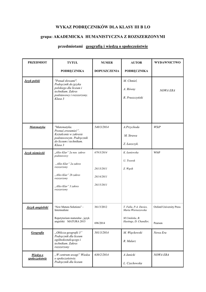 WYKAZ PODRĘCZNIKÓW DLA KLASY III B LO grupa: AKADEMICKA HUMANISTYCZNA Z ROZSZERZONYMI przedmiotami geografią i wiedzą o społeczeństwie PRZEDMIOT Język polski Matematyka Język niemiecki TYTUŁ NUMER AUTOR PODRĘCZNIKA DOPUSZCZENIA PODRĘCZNIKA "Ponad słowami". Podręcznik do języka polskiego dla liceum i technikum. Zakres podstawowy i rozszerzony. Klasa 3 WYDAWNICTWO M. Chmiel, A. Równy NOWA ERA R. Pruszczyński "Matematyka. Poznać,zrozumieć”. Kształcenie w zakresie podstawowym. Podręcznik do liceum i technikum. Klasa 3 540/3/2014 „Alles Klar” 2a neu zakres podstawowy 679/3/2014 A.Przychoda WSiP M. Strawa Z. Łaszczyk. K. Łuniewska WSiP U. Tworek „Alles Klar” 2a zakres rozszerzony „Alles Klar” 2b zakres rozszerzony Język angielski Wiedza o społeczeństwie Z. Wąsik 281/4/2011 „Alles Klar” 3 zakres rozszerzony 281/5/2011 ‘New Matura Solutions” Intermediate 361/3/2012 Repetytorium maturalne , język angielski MATURA 2015 Geografia 281/3/2011 696/2014 „Oblicza geografii 3” Podręcznik dla liceum ogólnokształcącego i technikum. Zakres rozszerzony 501/3/2014 „W centrum uwagi” Wiedza o społeczeństwie. Podręcznik dla liceum 630/2/2014 T. Falla, P.A. Davies, Maria Wieruszewska M.Umińska, B. Hastings, D. Chandler, M. Więckowski Oxford University Press Pearson Nowa Era R. Malarz A Janicki L. Czechowska NOWA ERA ogólnokształcącego i technikum. Część 2, zakres rozszerzony Historia i społeczeństwo K. Święcicki „Poznać przeszłość. Wojna i wojskowość.” Podręcznik do historii i społeczeństwa dla liceum ogólnokształcącego i technikum J. Centek NOWA ERA ks.J. Szpeta, ŚW. WOJCIECH POZNAŃ „Europa i świat” Podręcznik do historii i społeczeństwa dla liceum ogólnokształcącego i technikum Religia „Moje miejsce w rodzinie” AZ – 43 – 01/10 – PO – 1/14 D. Jackowiak WYKAZ PODRĘCZNIKÓW DLA KLASY III B LO grupa: AKADEMICKA HUMANISTYCZNA Z ROZSZERZONYMI przedmiotami historią i wiedzą o społeczeństwie PRZEDMIOT Język polski Matematyka Język niemiecki TYTUŁ NUMER AUTOR PODRĘCZNIKA DOPUSZCZENIA PODRĘCZNIKA "Ponad słowami". Podręcznik do języka polskiego dla liceum i technikum. Zakres podstawowy i rozszerzony. Klasa 3 WYDAWNICTWO M. Chmiel, A. Równy, NOWA ERA R. Pruszczyński "Matematyka. Poznać i zrozumieć”. Kształcenie w zakresie podstawowym. Podręcznik do liceum i technikum. Klasa 3 540/3/2014 „Alles Klar” 2a neu zakres podstawowy 679/3/2014 A. Przychoda WSiP Z. Łaszczyk. M. Strawa K. Łuniewska WSiP U. Tworek „Alles Klar” 2a zakres rozszerzony 281/3/2011 Z. Wąsik „Alles Klar” 2b zakres rozszerzony „Alles Klar” rozszerzony 3 zakres 281/4/2011 281/5/2011 Język angielski “New Matura Intermadiate Solutions” 361/3/2012 T. Falla,P.A. Davies, Maria Wieruszewska 696/2014 Historia Pearson Repetytorium maturalne , język angielski MATURA 2015 M. Umińska, B. Hastings, D. Chandler „Zrozumieć przeszłość. Czas wielkich przemian lata 18151939” Podręcznik dla liceum ogólnokształcącego i technikum. Zakres rozszerzony, część 3 P.Gawlik „Zrozumieć przeszłość. Dzieje najnowsze lata 19391989” Podręcznik dla liceum Oxford University Press NOWA ERA ogólnokształcącego i technikum.Zakresrozszerzony, część 4 Maturalne karty pracy do podręcznika Wiedza o społeczeństwie przyroda „W centrum uwagi” Wiedza o społeczeństwie. Podręcznik dla liceum ogólnokształcącego i technikum. Część 2, zakres rozszerzony 630/2/2014 „Przyroda. 658/1/e/2013 M. Galikowski 658/2/e/2013 R .Hassa, Podręcznik dla liceum ogólnokształcącego i technikum. Część 1 i część 2 A Janicki NOWA ERA L. Czechowska K. Święcicki Przyroda. Karty pracy ucznia – biologia , geografia. NOWA ERA M. Kaczmarczyk A. Mrzigod Przyroda. Karty fizyka, chemia. pracyJ. Mrzigod M. Więckowski Religia „Moje miejsce w rodzinie” AZ – 43 – 01/10 – PO – 1/14 ks.J. Szpeta, D. Jackowiak ŚW. WOJCIECH POZNAŃ WYKAZ PODRĘCZNIKÓW DLA KLASY III B LO grupa: AKADEMICKA MATEMATYCZNA Z ROZSZERZONYMI przedmiotami geografią i wiedzą o społeczeństwie PRZEDMIOT Język polski Matematyka Język niemiecki TYTUŁ NUMER AUTOR PODRĘCZNIKA DOPUSZCZENIA PODRĘCZNIKA "Ponad słowami". Podręcznik do języka polskiego dla liceum i technikum. Zakres podstawowy . Klasa 3 WYDAWNICTWO M. Chmiel, A. Równy, NOWA ERA R. Pruszczyński "Matematyka. Poznać i zrozumieć”. Kształcenie w zakresie podstawowym i rozszerzonym. Podręcznik do liceum i technikum. Klasa 3 540/3/2014 „Alles Klar” 2a neu zakres podstawowy 679/3/2014 A. Przychoda WSiP Z. Łaszczyk. M. Strawa K. Łuniewska WSiP U. Tworek „Alles Klar” 2a zakres rozszerzony „Alles Klar” 2b zakres rozszerzony Język angielski 281/3/2011 Z. Wąsik 281/4/2011 M. Zagórna „Alles Klar” 3 zakres rozszerzony 281/5/2011 “New Matura Solutions” 361/3/2012 Intermediate Geografia T. Falla,P.A. Davies Oxford University Press Maria Wieruszewska Repetytorium maturalne , język angielski MATURA 2015 696/2014 M. Umińska, B. Hastings, D. Chandler Pearson „Oblicza geografii 3” Podręcznik dla liceum ogólnokształcącego i technikum. Zakres rozszerzony 501/3/2014 M. Więckowski Nowa Era R. Malarz Wiedza o społeczeństwie Historia i społeczeństwo „W centrum uwagi” Wiedza o społeczeństwie. Podręcznik dla liceum ogólnokształcącego i technikum. Część 2, zakres rozszerzony 630/2/2014 A Janicki NOWA ERA L. Czechowska K. Święcicki Poznać przeszłość. Wojna i wojskowość.” Podręcznik do historii i społeczeństwa dla liceum ogólnokształcącego i technikum J. Centek NOWA ERA ks.J. Szpeta, ŚW. WOJCIECH POZNAŃ „Europa i świat” Podręcznik do historii i społeczeństwa dla liceum ogólnokształcącego i technikum Religia „Moje miejsce w rodzinie” AZ – 43 – 01/10 – PO – 1/14 D. Jackowiak WYKAZ PODRĘCZNIKÓW DLA KLASY III B LO grupa: AKADEMICKA MATEMATYCZNA Z ROZSZERZONYMI przedmiotami fizyką i biologią PRZEDMIOT J