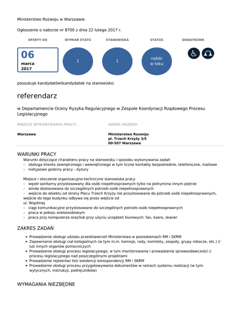 Ministerstwo Rozwoju w Warszawie Ogłoszenie o naborze nr 8700 z dnia 22 lutego 2017 r. OFERTY DO WYMIAR ETATU STANOWISKA STATUS 1 1 nabór w toku 06 marca 2017 DODATKOWE poszukuje kandydatów\kandydatek na stanowisko: referendarz w Departamencie Oceny Ryzyka Regulacyjnego w Zespole Koordynacji Rządowego Procesu Legislacyjnego MIEJSCE WYKONYWANIA PRACY: ADRES URZĘDU: Warszawa Ministerstwo Rozwoju pl. Trzech Krzyży 3/5 00-507 Warszawa WARUNKI PRACY Warunki dotyczące charakteru pracy na stanowisku i sposobu wykonywania zadań – obsługa klienta zewnętrznego i wewnętrznego w tym liczne kontakty bezpośrednie, telefoniczne, mailowe – nietypowe godziny pracy - dyżury Miejsce i otoczenie organizacyjno-techniczne stanowiska pracy – węzeł sanitarny przystosowany dla osób niepełnosprawnych tylko na jednym/na innym piętrze – winda dostosowana do szczególnych potrzeb osób niepełnosprawnych – wejście do obiektu od strony Placu Trzech Krzyży nie przystosowane do potrzeb osób niepełnosprawnych, wejście do tego budynku odbywa się przez wejście od ul. Wspólnej – ciągi komunikacyjne przystosowane do szczególnych potrzeb osób niepełnosprawnych – praca w pokoju wieloosobowym – praca przy komputerze oraz/lub przy użyciu urządzeń biurowych: fax, ksero, skaner ZAKRES ZADAŃ Prowadzenie obsługi udziału przedstawicieli Ministerstwa w posiedzeniach RM i SKRM Zapewnianie obsługi ciał kolegialnych (w tym m.in. komisje, rady, komitety, zespoły, grupy robocze, etc.) i/ lub innych organów pomocniczych Prowadzenie obsługi procesu legislacyjnego, w tym monitorowanie i prowadzenie sprawozdawczości z procesu legislacyjnego nad poszczególnymi projektami Prowadzenie rejestrów/ list/ ewidencji korespondencji RM i SKRM Prowadzenie obsługi procesu przygotowywania dokumentów w ramach systemu realizacji (w tym: wytycznych, instrukcji, podręczników) WYMAGANIA NIEZBĘDNE Wykształcenie: wyższe znajomość procesu legislacyjnego znajomość zadań i struktury organizacyjnej Ministerstwa Rozwoju rzetelność organizacja pracy i orientacja na osiąganie celów współpraca komunikacja myślenie analityczne Posiadanie obywatelstwa polskiego Korzystanie z pełni praw publicznych Nieskazanie prawomocnym wyrokiem za umyślne przestępstwo lub umyślne przestępstwo skarbowe DOKUMENTY I OŚWIADCZENIA NIEZBĘDNE Życiorys/CV i list motywacyjny Kopie dokumentów potwierdzających spełnienie wymagania niezbędnego w zakresie wykształcenia Oświadczenie o posiadaniu obywatelstwa polskiego albo kopia dokumentu potwierdzającego posiadanie polskiego obywatelstwa Oświadczenie o wyrażeniu zgody na przetwarzanie danych osobowych do celów naboru Oświadczenie o korzystaniu z pełni praw publicznych Oświadczenie o nieskazaniu prawomocnym wyrokiem za umyślne przestępstwo lub umyślne przestępstwo skarbowe DOKUMENTY I OŚWIADCZENIA DODATKOWE kopia dokumentu potwierdzającego niepełnosprawność - w przypadku kandydatek/kandydatów, zamierzających skorzystać z pierwszeństwa w zatrudnieniu w przypadku, gdy znajdą się w gronie najlepszych kandydatek/kandydatów TERMINY I MIEJSCE SKŁADANIA DOKUMENTÓW Dokumenty należy złożyć do: 06 marca 2017 r. Decyduje data: wpływu oferty do urzędu Miejsce składania dokumentów: Ministerstwo Rozwoju Biuro Zarządzania Zasobami Ludzkimi pl. Trzech Krzyży 3/5 00-507 Warszawa (Kancelaria czynna w godz. 8¹⁵-16¹⁵) z dopiskiem w liście motywacyjnym: DOR_40_z INNE INFORMACJE: W miesiącu poprzedzającym datę upublicznienia ogłoszenia wskaźnik zatrudnienia osób niepełnosprawnych w urzędzie, w rozumieniu przepisów o rehabilitacji zawodowej i społecznej oraz zatrudnianiu osób niepełnosprawnych, nie wynosi co najmniej 6%. Umowa na zastępstwo. Do udziału w naborze, zachęcamy również osoby niepełnosprawne, które spełniają wymagania określone w ogłoszeniu oraz po uwzględnieniu informacji dotyczących oferowanych warunków pracy. Metody/techniki, które będą stosowane podczas naboru: weryfikacja formalna ofert, sprawdzian wiedzy/umiejętności. Kandydaci proszeni są o podanie numeru telefonu i/lub adresu poczty elektronicznej. Oferty otrzymane po terminie nie będą rozpatrywane (liczy się data wpływu). Kandydaci zakwalifikowani zostaną poinformowani o kolejnych etapach naboru. Oferty odrzucone zostaną zniszczone komisyjnie. Dodatkowe informacje, dotyczące ogłoszenia do pracy w Ministerstwie, można znaleźć na stronie: http: //www.mr.gov.pl/ w zakładce Ministerstwo, lub uzyskać pod nr tel.(0-22) 693 59 26. Legenda Pierwszeństwo dla osób z niepełnosprawnościami Ogłoszenie z tym symbolem oznacza, że pierwszeństwo w zatrudnieniu mają osoby z niepełnosprawnościami, które spełniają wszystkie następujące warunki: • złożyły w terminie ofertę wraz z dokumentem potwierdzającym niepełnosprawność, • spełniają warunki wymienione w ogłoszeniu, • po rekrutacji znalazły się w gronie najlepszych kandydatów. Zastępstwo Ogłoszenie z tym symbolem oznacza, że urząd poszukuje kandydatów do pracy na czas przewidywanej nieobecności swojego pracownika. Jeśli w ogłoszeniu nie wskazano okresu zastępstwa, możesz o to spytać w urzędzie. Osoba zatrudniona na zastępstwo jest członkiem korpusu służby cywilnej. Nabór otwarty dla cudzoziemców Ogłoszenie z tym symbolem oznacza, że o stanowisko mogą starać się, poza polskimi obywatelami, również cudzoziemcy. Kandydaci muszą spełniać następujące warunki: • są obywatelami państwa Unii Europejskiej lub innego państwa, którego obywatelom na podstawie umów międzynarodowych lub przepisów prawa wspólnotowego przysługuje prawo podjęcia zatrudnienia na terytorium Polski, • ich znajomość języka polskiego jest potwierdzona jednym z dokumentów wskazanych w rozporządzeniu w sprawie rodzajów dokumentów potwierdzających znajomość języka polskiego przez osoby nieposiadające obywatelstwa polskiego, ubiegające się o zat