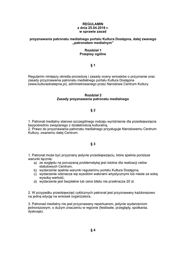 REGULAMIN z dnia 25.04.2016 r. w sprawie zasad przyznawania patronatu medialnego portalu Kultura Dostępna, dalej zwanego „patronatem medialnym” Rozdział 1 Przepisy ogólne §1 Regulamin niniejszy określa procedurę i zasady oceny wniosków o przyznanie oraz zasady przyznawania patronatu medialnego portalu Kultura Dostępna (www.kulturadostepna.pl), administrowanego przez Narodowe Centrum Kultury. Rozdział 2 Zasady przyznawania patronatu medialnego §2 1. Patronat medialny stanowi szczególnego rodzaju wyróżnienie dla przedsięwzięcia bezpośrednio związanego z działalnością kulturalną. 2. Prawo do przyznawania patronatu medialnego przysługuje Narodowemu Centrum Kultury, zwanemu dalej Centrum. §3 1. Patronat może być przyznany jedynie przedsięwzięciu, które spełnia poniższe warunki łącznie: a) ze względu na poruszaną problematykę jest istotne dla realizacji celów statutowych Centrum, b) wydarzenie spełnia warunki regulaminu portalu Kultura Dostępna, c) wydarzenie odznacza się wysokimi walorami artystycznymi lub niesie za sobą wysoką wartość, d) wydarzenie jest bezpłatne lub cena biletu nie przekracza 20 zł. 2. W przypadku przedsięwzięć cyklicznych patronat jest przyznawany każdorazowo na jedną edycję na wniosek organizatora. 3. Patronad medialny nie jest przyznawany repertuarom, jedynie wydarzeniom jednorazowym, o dużym znaczeniu w regionie (festiwale, przeglądy, spotkania, dyskusje). §4 Przyznanie przez Centrum patronatu medialnego Kultura Dostępna w żaden sposób nie oznacza deklaracji lub zobowiązania patrona medialnego do wsparcia finansowego lub organizacyjnego dla przedsięwzięcia objętego patronatem. Tym samym nie może stanowić podstawy dla jakichkolwiek roszczeń wobec Centrum, administrującego portalem Kultura Dostępna. §5 Informacja o przyznaniu przez Centrum patronatu medialnego portalu Kultura Dostępna jest zamieszczana na stronie internetowej Kultura Dostępna (www.kulturadostepna.pl) oraz według uznania Centrum na profilu Kultura Dostępna na portalu Facebook.com (https://www.facebook.com/KulturaDostepna). Rozdział 3 Procedura przyznawania patronatu medialnego §6 1. Wniosek o patronat medialny organizator składa do Centrum wybierając jeden z poniższych sposobów: a) poprzez internetowy formularz znajdujący się na portalu Kultura Dostępna w zakładce Patronaty, i. ii. w formularzu dodawania wydarzeń, b) poprzez przesłanie oficjalnego pisma do Centrum na adres Narodowe Centrum Kultury, Redakcja Kultury Dostępnej ul. Płocka 13, 01-231 Warszawa, c) poprzez złożenie oficjalnego pisma w recepcji Narodowego Centrum Kultury adresowanego do Redakcji Kultury Dostępnej. 2. Organizator jest zobowiązany podać we wniosku: a) nazwę Organizatora, b) cel przedsięwzięcia, c) regulamin i/lub harmonogram przedsięwzięcia, d) proponowane świadczenia na rzecz Centrum w związku z przyznaniem patronatu medialnego, e) termin rozpoczęcia i zakończenia przedsięwzięcia, f) osoby odpowiedzialne ze strony Organizatora do kontaktu, g) instytucje/osoby zaangażowane we współpracę przy przedsięwzięciu, h) media zaangażowane w przedsięwzięcie, i) przewidywaną/planowaną kampanię medialną. 3. Wniosek powinien zostać doręczony do Centrum nie później niż na 21 dni kalendarzowych przed dniem rozpoczęcia przedsięwzięcia lub wydarzenia. W przypadku przesłania pisma drogą pocztową liczy się data wpłynięcia pisma do Centrum. §7 1. Wniosek, który nie spełnia wymogów określonych w § 6 ust. 1 i 2 lub został doręczony po terminie nie będzie rozpatrywany, chyba, że Centrum zdecyduje inaczej. 2. Komórka organizacyjna Centrum opiniująca wniosek może zwrócić się do organizatora ubiegającego się o patronat medialnyo przekazanie dodatkowych informacji lub udzielenie wyjaśnień. §8 O przyznaniu albo odmowie przyznania patronatu medialnego portalu Kultura Dostępna Organizator powiadomiony jest przez Dział Komunikacji w formie elektronicznej za pośrednictwem poczty elektronicznej lub w formie pisemnej za pośrednictwem poczty tradycyjnej Rozdział 4 Warunki związane z realizacją patronatu medialnego §9 1. Organizator przedsięwzięcia, które Centrum objęło patronatem medialnym, informuje współorganizatorów oraz uczestników o przyznaniu patronatu. 2. W przypadku objęcia wydarzenia przez Centrum patronatem medialnym portalu Kultura Dostępna, Organizator umieszcza informacje o przyznanym patronacie medialnym we wszystkich materiałach promocyjnych i informacyjnych związanych z realizacją przedsięwzięcia wraz z logotypem Kultury Dostępnej. Logotyp Kultury Dostepnej musi zostać umieszczony zgodnie z księgą znaków Kultury Dostępnej. Każdorazowe wykorzystanie logotypu Kultury Dostępnej wymaga akceptacji przedstawiciela Centrum, od którego Organizator otrzymał decyzję o przyznaniu patronatu medialnego. 3. W przypadku objęcia przez Centrum patronatu medialnego portalu Kultura Dostępna, Organizator zobowiązany jest do przekazania dwóch bezpłatnych zaproszeń na wydarzenie objęte patronatem lub dwóch egzemplarzy wydawnictwa objętego patronatem. 4. W przypadku objęcia patronatem medialnym wydawnictwa (książkowego lub płytowego) oraz utworu filmowego Centrum zastrzega sobie prawo do zapoznania się z treścią wydawnictwa lub utworu przed jego publikacją i rozpowszechnianiem pierwszym. 5. Objęcie przedsięwzięcia patronatem medialnym wiąże się z obowiązkiem przesłania na adres mailowy [email protected] informacji prasowej dotyczącej przedsięwzięcia objętego patronatem, zawierającej materiał graficzny. Tytuł przesłanej wiadomości powinien zawierać dopisek "PATRONAT KULTURA DOSTĘPNA". Rozdział 5 Odebranie patronatu § 10 1. W szczególnie uzasadnionych przypadkach Dyrektor Centrum może odebrać przyznany Patronat medialny. 2. O odebraniu patronatu medialnego organizator jest informowany przez Dział Komunikacji Centrum w formie elektronicznej za pośr