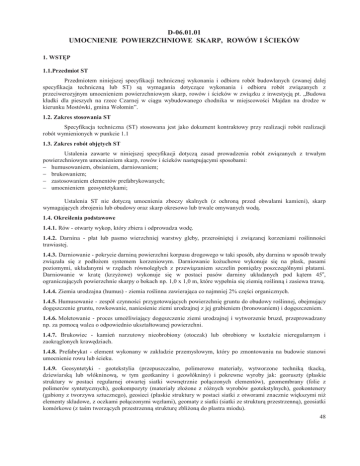 D-06.01.01 UMOCNIENIE POWIERZCHNIOWE SKARP, ROWÓW I ŚCIEKÓW 1. WSTĘP 1.1.Przedmiot ST Przedmiotem niniejszej specyfikacji technicznej wykonania i odbioru robót budowlanych (zwanej dalej specyfikacja techniczną lub ST) są wymagania dotyczące wykonania i odbioru robót związanych z przeciwerozyjnym umocnieniem powierzchniowym skarp, rowów i ścieków w związku z inwestycją pt. „Budowa kładki dla pieszych na rzece Czarnej w ciągu wybudowanego chodnika w miejscowości Majdan na drodze w kierunku Mostówki, gmina Wołomin”. 1.2. Zakres stosowania ST Specyfikacja techniczna (ST) stosowana jest jako dokument kontraktowy przy realizacji robót realizacji robót wymienionych w punkcie 1.1 1.3. Zakres robót objętych ST Ustalenia zawarte w niniejszej specyfikacji dotyczą zasad prowadzenia robót związanych z trwałym powierzchniowym umocnieniem skarp, rowów i ścieków następującymi sposobami: − humusowaniem, obsianiem, darniowaniem; − brukowaniem; − zastosowaniem elementów prefabrykowanych; − umocnieniem geosyntetykami; Ustalenia ST nie dotyczą umocnienia zboczy skalnych (z ochroną przed obwałami kamieni), skarp wymagających zbrojenia lub obudowy oraz skarp okresowo lub trwale omywanych wodą. 1.4. Określenia podstawowe 1.4.1. Rów - otwarty wykop, który zbiera i odprowadza wodę. 1.4.2. Darnina - płat lub pasmo wierzchniej warstwy gleby, przerośniętej i związanej korzeniami roślinności trawiastej. 1.4.3. Darniowanie - pokrycie darniną powierzchni korpusu drogowego w taki sposób, aby darnina w sposób trwały związała się z podłożem systemem korzeniowym. Darniowanie kożuchowe wykonuje się na płask, pasami poziomymi, układanymi w rzędach równoległych z przewiązaniem szczelin pomiędzy poszczególnymi płatami. Darniowanie w kratę (krzyżowe) wykonuje się w postaci pasów darniny układanych pod kątem 45o, ograniczających powierzchnie skarpy o bokach np. 1,0 x 1,0 m, które wypełnia się ziemią roślinną i zasiewa trawą. 1.4.4. Ziemia urodzajna (humus) - ziemia roślinna zawierająca co najmniej 2% części organicznych. 1.4.5. Humusowanie - zespół czynności przygotowujących powierzchnię gruntu do obudowy roślinnej, obejmujący dogęszczenie gruntu, rowkowanie, naniesienie ziemi urodzajnej z jej grabieniem (bronowaniem) i dogęszczeniem. 1.4.6. Moletowanie - proces umożliwiający dogęszczenie ziemi urodzajnej i wytworzenie bruzd, przeprowadzany np. za pomocą walca o odpowiednio ukształtowanej powierzchni. 1.4.7. Brukowiec - kamień narzutowy nieobrobiony (otoczak) lub obrobiony w kształcie nieregularnym i zaokrąglonych krawędziach. 1.4.8. Prefabrykat - element wykonany w zakładzie przemysłowym, który po zmontowaniu na budowie stanowi umocnienie rowu lub ścieku. 1.4.9. Geosyntetyki - geotekstylia (przepuszczalne, polimerowe materiały, wytworzone techniką tkacką, dziewiarską lub włókninową, w tym geotkaniny i geowłókniny) i pokrewne wyroby jak: georuszty (płaskie struktury w postaci regularnej otwartej siatki wewnętrznie połączonych elementów), geomembrany (folie z polimerów syntetycznych), geokompozyty (materiały złożone z różnych wyrobów geotekstylnych), geokontenery (gabiony z tworzywa sztucznego), geosieci (płaskie struktury w postaci siatki z otworami znacznie większymi niż elementy składowe, z oczkami połączonymi węzłami), geomaty z siatki (siatki ze strukturą przestrzenną), geosiatki komórkowe (z taśm tworzących przestrzenną strukturę zbliżoną do plastra miodu). 48 1.4.10. Tymczasowa warstwa przeciwerozyjna - warstwa na powierzchni skarp, wykonana z płynnych osadów ściekowych, emulsji bitumicznych lub lateksowych, biowłókniny i geosyntetyków, doraźnie zabezpieczająca przed erozją powierzchniową do czasu przejęcia tej funkcji przez okrywę roślinną. 1.4.11. Ramka Webera - ramka o boku 50 cm, podzielona drutem lub żyłką na 100 powierzchni 25 cm2, do określania procentowego udziału gatunków roślin, po obsianiu kwadratów, każdy o 1.4.12. Pozostałe określenia podstawowe są zgodne z obowiązującymi, odpowiednimi polskimi normami i z definicjami podanymi w ST D- 00.00.00 „Wymagania ogólne”. 1.5. Wymagania dotyczące robót Ogólne wymagania dotyczące robót podano w ST D-00.00.00 "Wymagania ogólne". 2. WYROBY BUDOWLANE 2.1. Ogólne wymagania dotyczące wyrobów budowlanych Ogólne wymagania, jakim powinny odpowiadać wyroby budowlane, sposób ich nabywania, przechowywania oraz transport podano w ST D-00.00.00 „Wymagania ogólne". 2.2. Wyroby budowlane do wykonania robót − − − − − − − − − − Wyrobami budowlanymi stosowanymi przy umacnianiu skarp, rowów i ścieków objętymi niniejszą ST są: darnina, ziemia urodzajna, nasiona traw oraz roślin motylkowatych, brukowiec, mech, szpilki, paliki i pale, kruszywo, cement, zaprawa cementowa, elementy prefabrykowane, geosyntetyki i materiały do ich przytwierdzania, W celu zabezpieczenia przed rozmyciem, na obwodzie umocnienia pod obiektem przy przyczółkach wykonać próg z krawężników i obrzeży betonowych o cechach zgodnych z PN-EN 1340 2004: - odporność na zamrażanie/rozmrażanie – klasa 3 ( D ) - wytrzymałość charakterystyczna na zginanie – klasa 2 ( T ) - nasiąkliwość – klasa 2 ( B ) - odporność na ścieranie – klasa 3 ( H ) - odporność na poślizg/poślizgnięcie – minimalna wartość deklarowana 2.3. Darnina Darninę należy wycinać z obszarów położonych najbliżej miejsca wbudowania. Cięcie należy przeprowadzać przy użyciu specjalnych pługów i krojów. Płaty lub pasma wyciętej darniny, w zależności od gruntu na jakim będą układane, powinny mieć szerokość od 25 do 50 cm i grubość od 6 do 10 cm. Wycięta darnina powinna być w krótkim czasie wbudowana. Darninę, jeżeli nie jest od razu wbudowana, należy układać warstwami w stosy, stroną porostu do siebie, na wysokość nie większą niż 1 m. Ułożone stosy winny być ut