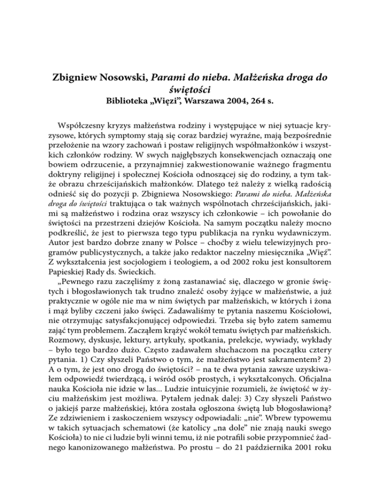 Zbigniew Nosowski, Parami do nieba. Małżeńska droga do świętości Biblioteka „Więzi”, Warszawa 2004, 264 s. Współczesny kryzys małżeństwa rodziny i występujące w niej sytuacje kryzysowe, których symptomy stają się coraz bardziej wyraźne, mają bezpośrednie przełożenie na wzory zachowań i postaw religijnych współmałżonków i wszystkich członków rodziny. W swych najgłębszych konsekwencjach oznaczają one bowiem odrzucenie, a przynajmniej zakwestionowanie ważnego fragmentu doktryny religijnej i społecznej Kościoła odnoszącej się do rodziny, a tym także obrazu chrześcijańskich małżonków. Dlatego też należy z wielką radością odnieść się do pozycji p. Zbigniewa Nosowskiego: Parami do nieba. Małżeńska droga do świętości traktująca o tak ważnych wspólnotach chrześcijańskich, jakimi są małżeństwo i rodzina oraz wszyscy ich członkowie – ich powołanie do świętości na przestrzeni dziejów Kościoła. Na samym początku należy mocno podkreślić, że jest to pierwsza tego typu publikacja na rynku wydawniczym. Autor jest bardzo dobrze znany w Polsce – choćby z wielu telewizyjnych programów publicystycznych, a także jako redaktor naczelny miesięcznika „Więź”. Z wykształcenia jest socjologiem i teologiem, a od 2002 roku jest konsultorem Papieskiej Rady ds. Świeckich. „Pewnego razu zaczęliśmy z żoną zastanawiać się, dlaczego w gronie świętych i błogosławionych tak trudno znaleźć osoby żyjące w małżeństwie, a już praktycznie w ogóle nie ma w nim świętych par małżeńskich, w których i żona i mąż byliby czczeni jako święci. Zadawaliśmy te pytania naszemu Kościołowi, nie otrzymując satysfakcjonującej odpowiedzi. Trzeba się było zatem samemu zająć tym problemem. Zacząłem krążyć wokół tematu świętych par małżeńskich. Rozmowy, dyskusje, lektury, artykuły, spotkania, prelekcje, wywiady, wykłady – było tego bardzo dużo. Często zadawałem słuchaczom na początku cztery pytania. 1) Czy słyszeli Państwo o tym, że małżeństwo jest sakramentem? 2) A o tym, że jest ono drogą do świętości? – na te dwa pytania zawsze uzyskiwałem odpowiedź twierdzącą, i wśród osób prostych, i wykształconych. Oficjalna nauka Kościoła nie idzie w las... Ludzie intuicyjnie rozumieli, że świętość w życiu małżeńskim jest możliwa. Pytałem jednak dalej: 3) Czy słyszeli Państwo o jakiejś parze małżeńskiej, która została ogłoszona świętą lub błogosławioną? Ze zdziwieniem i zaskoczeniem wszyscy odpowiadali: „nie”. Wbrew typowemu w takich sytuacjach schematowi (że katolicy „na dole” nie znają nauki swego Kościoła) to nie ci ludzie byli winni temu, iż nie potrafili sobie przypomnieć żadnego kanonizowanego małżeństwa. Po prostu – do 21 października 2001 roku Recenzje 223 – papieże nie wynieśli na ołtarze żadnej małżeńskiej wspólnoty. Przez wiele wieków katoliccy małżonkowie nie otrzymywali od swego Kościoła wzorów do naśladowania w postaci beatyfikowanych czy kanonizowanych par małżeńskich, a o istniejących świętych, którzy żyli w małżeństwie, wiadomo było bardzo niewiele. Równie ważna była odpowiedź na czwarte pytanie: 4) Czy znali Państwo jakieś małżeństwo, o którym można by powiedzieć, że wspólnie przeżyli swe życie w święty sposób? Po wahaniach i głębszym zastanowieniu zazwyczaj padała odpowiedź twierdząca... Nie było wcale trudne znalezienie znajomych, którzy przeżyli swoje małżeństwo tak sensownie i szczęśliwie, że można mówić, iż przeżyli je w sposób święty! Okazywało się zatem, że ów – zdawałoby się, niedościgły – ideał małżeńskiej świętości można było dotknąć, zobaczyć, naśladować, i to tuż obok siebie, w życiu bliskich sobie osób” (s. 7-8). Te słowa Autora ze Wstępu wydają się być ukazaniem swoistej drogi stawiania ważnych pytań i szukanie na nie odpowiedzi, a w konsekwencji wyjaśnieniem motywu powstania niniejszej książki o problemie świętych par małżeńskich, o tym jakie były święte małżeństwa, ale i o tym jakie będą oraz jakie powinny być święte w przyszłości małżeństwa. Recenzowana pozycja składa się ze Wstępu, czterech części oraz Aneksu. Wartym podkreślenia właśnie jest już sam aneks zawierający niejednokrotnie wiele ważnych, nie publikowanych nigdzie dotychczas zestawień: 1. Święte małżeństwa w historii Kościoła. Zestawienie chronologiczne; 2. Potrzeba świętych par małżeńskich. Apel Krajowej Rady Katolików Świeckich; 3. 26 grudnia – dniem Świętej Rodziny? Wystąpienie Zbigniewa Nosowskiego jako świeckiego audytora podczas Synodu Biskupów w Rzymie 10 października 2001 r.; 4. Modlitwa Jana Pawła II za rodziny; 5. Bibliografia; 6. Ventzislav Piriankov i jego malarstwo; 7. Spis reprodukcji; 8. Indeks. Rozpoczynając omawianie poszczególnych części niniejszej książki, najpierw jeszcze „Wyjaśnienia wymaga także kwestia terminologiczna. Aby uniknąć nieporozumień, usiłuję konsekwentnie rozróżniać trzy sytuacje: świętych małżonków (pojedyncze osoby kanonizowane, które żyły w małżeństwie), święte małżeństwa (związki, w których i żona, i mąż zostali – indywidualnie – beatyfikowani lub kanonizowani) oraz święte pary małżeńskie (które świadomie traktują małżeństwo jako wspólną drogę świętości). Ta książka opowiada zatem: po pierwsze, o tym, że udało mi się znaleźć wiele świętych małżeństw; po drugie zaś, że zaczyna się epoka świętych par małżeńskich” (s. 10-11). W pierwszej części książki Odnalezieni w przeszłości punktem wyjścia przemyśleń Autora stały się pary małżeńskie na przestrzeni dziejów historii Kościoła, począwszy od przykładów świętych par z Pisma Świętego; wśród męczenników; podejmujących ze względów religijnych decyzji o rezygnacji ze współżycia