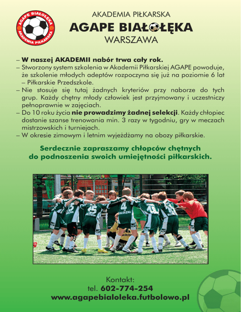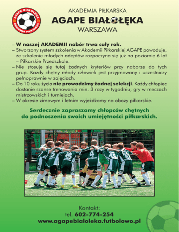 AKADEMIA PIŁKARSKA AGAPE BIAŁOŁ¢KA O WARSZAWA – W naszej AKADEMII nabór trwa cały rok. – Stworzony system szkolenia w Akademii Piłkarskiej AGAPE powoduje, ˝e szkolenie młodych adeptów rozpoczyna si´ ju˝ na poziomie 6 lat – Piłkarskie Przedszkole. – Nie stosuje si´ tutaj ˝adnych kryteriów przy naborze do tych grup. Ka˝dy ch´tny młody człowiek jest przyjmowany i uczestniczy pełnoprawnie w zaj´ciach. – Do 10 roku ˝ycia nie prowadzimy ˝adnej selekcji. Ka˝dy chłopiec dostanie szanse trenowania min. 3 razy w tygodniu, gry w meczach mistrzowskich i turniejach. – W okresie zimowym i letnim wyje˝d˝amy na obozy piłkarskie. Serdecznie zapraszamy chłopców ch´tnych do podnoszenia swoich umiej´tnoÊci piłkarskich. Kontakt: tel. 602-774-254 www.agapebialoleka.futbolowo.pl Nasze cele: – nauczanie w myÊl powiedzenia ˝e „zwyci´stwo” jest wa˝ne, ale nie wa˝niejsze ni˝ charakter i styl gry, – sprawienie aby piłka była przede wszystkim dobrà zabawà, – wychowanie, nauka i szkolenie na najwy˝szym poziomie w oparciu o wzorce najlepszych szkółek piłkarskich, – wychowywanie w duchu zdrowej rywalizacji i wpajanie zasad zdrowej konkurencji i dyscypliny, – rozwój umiej´tnoÊci zawodnika, jego kreatywnoÊci i pewnoÊci siebie na boisku, – nauka zasad fair play, – nauka przy u˝yciu nowoczesnych metod i technologii, – stworzenie profesjonalnych fundamentów rozwoju dla młodego piłkarza, – rekrutacja najzdolniejszych młodych piłkarzy. Trenerzy prowadzàcy zaj´cia w Akademii: PIOTR KNAP – trener II klasy, rocznik 1995, 1999 KAMIL WILK – trener II klasy, trener bramkarzy, rocznik 2001, 2002 RAFAŁ SZEWCZYK – trener II klasy, rocznik 1995, 2000 NORBERT KOWALSKI – trener II klasy, rocznik 2003, 2004 HUBERT BYRKE – trener II klasy, rocznik 2000, 2001 TELAKOWIEC ANDRZEJ – kierownik, koordynator