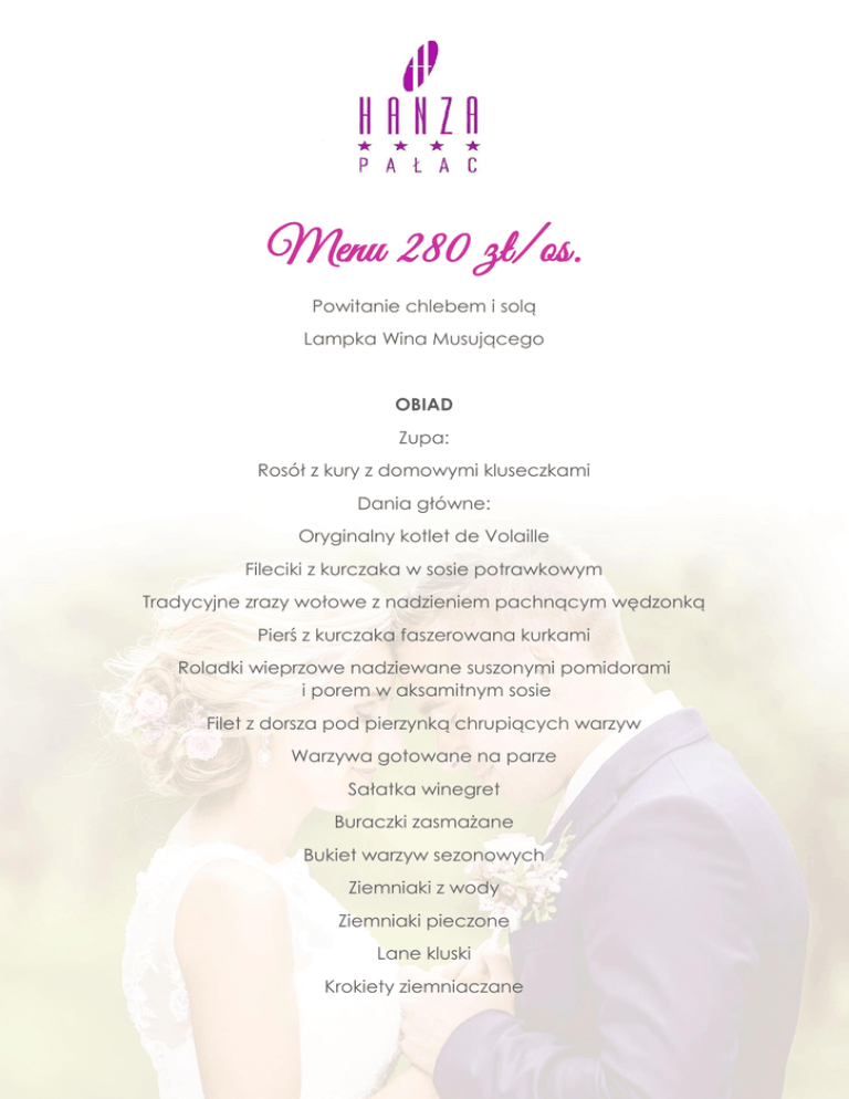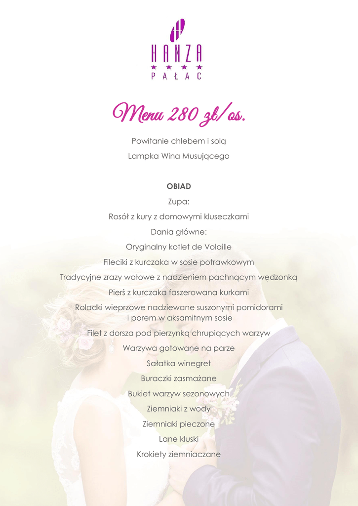 Menu 280 zł/os. Powitanie chlebem i solą Lampka Wina Musującego OBIAD Zupa: Rosół z kury z domowymi kluseczkami Dania główne: Oryginalny kotlet de Volaille Fileciki z kurczaka w sosie potrawkowym Tradycyjne zrazy wołowe z nadzieniem pachnącym wędzonką Pierś z kurczaka faszerowana kurkami Roladki wieprzowe nadziewane suszonymi pomidorami i porem w aksamitnym sosie Filet z dorsza pod pierzynką chrupiących warzyw Warzywa gotowane na parze Sałatka winegret Buraczki zasmażane Bukiet warzyw sezonowych Ziemniaki z wody Ziemniaki pieczone Lane kluski Krokiety ziemniaczane Deser serwowany: Lampone z lodami i gorącymi malinami BUFET DESEROWY Lustra z filetowanymi owocami Ciasta domowego wypieku Woda, soki, napoje gazowane (B/O) Kawa, herbata (B/O) ZAKĄSKI/KOLACJA Łosoś w galarecie Udka z kurczaka w wykwintnej maladze Dorsz na sposób grecki Galaretki drobiowe Deski mięs pieczonych, rolad i wędlin Deski ryb wędzonych Sałatka grecka Sałatka gyros Tartinki z pastą z ciecierzycy / Tartinki z pastą ze szpinaku i suszonych pomidorów Pieczywo, masło NA CIEPŁO PO PÓŁNOCY Goloneczki na kapuście Polędwiczki wieprzowe w sakiewkach ciasta francuskiego Pieczone udka z kurczaka w sosie sycylijskim Żurek z białą kiełbasą