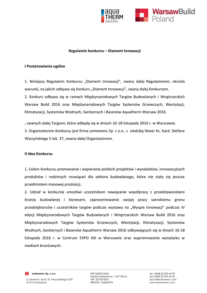 Regulamin konkursu – Diament Innowacji I Postanowienia ogólne 1. Niniejszy Regulamin Konkursu „Diament Innowacji”, zwany dalej Regulaminem, określa warunki, na jakich odbywa się Konkurs „Diament Innowacji”, zwany dalej Konkursem. 2. Konkurs odbywa się w ramach Międzynarodowych Targów Budowlanych i Wnętrzarskich Warsaw Build 2016 oraz Międzynarodowych Targów Systemów Grzewczych, Wentylacji, Klimatyzacji, Systemów Wodnych, Sanitarnych i Basenów Aquatherm Warsaw 2016. , zwanych dalej Targami, które odbędą się w dniach 16-18 listopada 2016 r. w Warszawie. 3. Organizatorem Konkursu jest firma Lentewenc Sp. z o.o., z siedzibą Skwer Ks. Kard. Stefana Wyszyńskiego 5 lok. 37, zwana dalej Organizatorem. II Idea Konkursu 1. Celem Konkursu promowanie i wspieranie polskich projektów i wynalazków, innowacyjnych produktów i rodzimych rozwiązań dla sektora budowlanego, które nie stały się jeszcze przedmiotem masowej produkcji. 2. Udział w konkursie umożliwi uczestnikom nawiązanie współpracy z przedstawicielami branży budowlanej i biznesem, zaprezentowanie swojej pracy szerokiemu gronu przedsiębiorców i uczestników targów podczas wystawy na „Wyspie Innowacji” podczas IV edycji Międzynarodowych Targów Budowlanych i Wnętrzarskich Warsaw Build 2016 oraz Międzynarodowych Targów Systemów Grzewczych, Wentylacji, Klimatyzacji, Systemów Wodnych, Sanitarnych i Basenów Aquatherm Warsaw 2016 odbywających się w dniach 16-18 listopada 2016 r. w Centrum EXPO XXI w Warszawie oraz wypromowanie wynalazku w mediach branżowych. Lentewenc Sp. z o.o. ul. Skwer Ks. Kard. St. Wyszyńskiego 5/37 01-015 Warszawa KRS 0000415363 kapitał zakładowy: 1 567 000 zł NIP: 5272675051 REGON: 146063993 tel.: 0048 22 395 66 99 fax: 0048 22 395 66 90 [email protected] www.lentewenc.com III Uczestnicy Konkursu 1. Konkurs jest kierowany do studentów i absolwentów uczelni technicznych, inżynierów oraz osób przygotowujących technologie dla sektora budowlanego i HVAC: pomysłowych, kreatywnych, niezależnych, których pasją jest tworzenie wynalazków, projektów i innowacyjnych produktów znajdujących zastosowanie w sektorze budowlanym. 2. Konkurs ma charakter otwarty, wziąć w nim udział mogą pełnoletnie osoby fizyczne lub firmy. 3. W Konkursie mogą wziąć udział zarówno projektanci i wykonawcy, działający już na rynku, jak i debiutanci. 4. W Konkursie mogą brać udział zespoły projektowe, które traktowane są jak jeden uczestnik. 5. Uczestnictwo w konkursie jest bezpłatne. IV Praca konkursowa 1. Pracą zgłoszoną na konkurs musi być autorski produkt lub projekt wynalazku, który może znaleźć zastosowanie w branży budowlanej i HVAC. 2. Zgłoszony produkt/wynalazek powinien charakteryzować się innowacyjnością, wykorzystaniem niestandardowych rozwiązań i materiałów oraz uwzględniać bieżące, a może i przyszłe potrzeby sektora budowlanego lub HVAC. 3. Gabaryty pracy konkursowej nie mogą uniemożliwiać przewiezienia jej na wystawę prac Laureatów konkursu odbywającą się podczas Międzynarodowych Targów Warsaw Build 2016 oraz Międzynarodowych Targów Systemów Grzewczych, Wentylacji, Klimatyzacji, Systemów Wodnych, Sanitarnych i Basenów Aquatherm Warsaw 2016 w Warszawie 16-18 listopada 2016 r. 4. Każdy Uczestnik przystępujący do Konkursu oświadcza, że przysługują mu autorskie prawa majątkowe do zgłoszonej pracy oraz że nie narusza ona w żaden sposób praw bądź dóbr osób trzecich. 5. Jeden autor lub zespół projektowy może zgłosić do Konkursu maksymalnie 3 prace. Każde zgłoszenie traktowane jest oddzielnie i musi zawierać wszystkie wymagane elementy. Lentewenc Sp. z o.o. ul. Skwer Ks. Kard. St. Wyszyńskiego 5/37 01-015 Warszawa KRS 0000415363 kapitał zakładowy: 1 567 000 zł NIP: 5272675051 REGON: 146063993 tel.: 0048 22 395 66 99 fax: 0048 22 395 66 90 [email protected] www.lentewenc.com 6. Wszystkie prace (gabaryty i forma prezentacji) muszą być potwierdzone z Organizatorem w celu umieszczenia ich na ekspozycji. V Zgłoszenie do Konkursu 1. Zgłoszenia pracy do Konkursu należy dokonać za pomocą wysłania wypełnionego Formularza zgłoszeniowego na adres mailowy: [email protected] w terminie do 18 września 2016r. Formularz zgłoszeniowy do pobrania dostępny jest na stronie internetowej pod adresem: http://warsawbuild.pl/Konkursy/Diamenty-Innowacji.aspx 2. Zgłoszenie przesłane drogą mailową musi zawierać: a) imię i nazwisko uczestnika/ nazwę zespołu projektowego b) dane kontaktowe uczestnika: adres; numer telefonu; adres e-mail c) nazwę pracy konkursowej d) krótki opis pracy konkursowej (do opublikowania na stronie konkursu) – max. 500 znaków ze spacjami w języku polskim i angielskim e) uzasadnienie innowacyjności produktu i cech które go wyróżniają (max. 500 znaków) f) max. 5 zdjęć lub wizualizacji pracy konkursowej w jakości do druku (300 DPI, CMYK) format .jpg lub .tiff. 3. Przesłanie zgłoszenia jest tożsame z akceptacją Regulaminu oraz zgłoszeniem udziału w Konkursie na wszystkich jego etapach i na warunkach określonych w niniejszym Regulaminie. 4. Uczestnik, zgłaszając produkt do Konkursu, wyraża zgodę na bezpłatną publikację, kopiowanie, utrwalanie i zwielokrotnianie przesłanych materiałów (zdjęcia i opisy) na materiałach promocyjnych Konkursu oraz wystawy finalistów podczas Targów, a następnie po jego zakończeniu w materiałach podsumowujących i ilustrujących wydarzenie. 5. Laureaci Konkursu wyrażają zgodę na podanie ich danych osobowych (imię, nazwisko, miejsce zamieszkania) do publicznej wiadomości w związku z ogłoszeniem wyników. 6. Organizator ma prawo odrzucić zgłoszenie, jeżeli nie spełnia ono wymogów niniejszego Regulaminu. 7. Wybrane prace finalistów, po weryfikacji zgłoszenia przez Organizatora, umieszczone zostaną na stronie www.warsawbuild.pl Lentewenc Sp. z o.o. ul. Skwer Ks. Kard. St. Wyszyńskiego 5/37 01-015 Warszawa KRS 