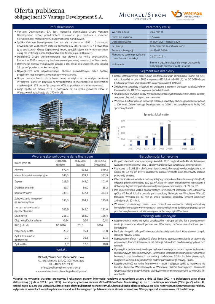 Oferta publiczna obligacji serii N Vantage Development S.A. Profil działalności Parametry emisji Vantage Development S.A. jest jednostką dominującą Grupy Vantage Development, której przedmiotem działalności jest budowa i sprzedaż nieruchomości mieszkalnych, biurowych oraz handlowych. Spółka Vantage Development S.A. została założona w 1991 r. Działalność deweloperską w obecnym kształcie rozpoczęła w 2007 r. Do 2012 r. prowadziła ją w strukturach Grupy Kapitałowej Impel, specjalizującej się w outsourcingu usług dla instytucji i przedsiębiorstw (kapitalizacja ok. 300 mln zł). Działalność Grupy skoncentrowana jest głównie na rynku wrocławskim. Emitent w 2016 r. rozpoczął budowę swojej pierwszej inwestycji w Warszawie. Dotychczas Spółka wybudowała ponad 1 100 lokali mieszkalnych oraz ponad 32 tys. m² powierzchni komercyjnej. Największym oraz najważniejszym obecnie prowadzonym przez Spółkę projektem jest inwestycja Promenady Wrocławskie. Grupa posiada bardzo duży bank ziemi, w większości w ścisłym centrum Wrocławia. Bank ten pozwala na wybudowanie nieruchomości o powierzchni użytkowej ok. 175 tys. m² (z czego ok. 60% to powierzchnia mieszkaniowa). Akcje Spółki od marca 2012 r. notowane są na rynku głównym GPW w Warszawie (kapitalizacja ok. 170 mln zł). Wartość emisji 10,5 mln zł Okres do wykupu 3,5 roku Oprocentowanie Cel emisji Termin subskrypcji Planowany termin przydziału i rozrachunek transakcji WIBOR 3M + marża 4,32% Cel emisji nie został określony do 19.07.2016 r. 22.07.2016 r. Emitent będzie ubiegał się o wprowadzenie obligacji do obrotu w ASO Catalyst Notowanie Segment mieszkaniowy Liczba sprzedawanych przez Grupę Emitenta mieszkań dynamicznie rośnie od 2012 roku. Sprzedaż w całym 2015 r. wyniosła 613 lokali (+140% r/r). W 1Q 2016 Grupa Emitenta sprzedała 250 lokali netto, co oznacza wzrost 169% r/r. Zwiększenie sprzedaży mieszkań jest związane z istotnym wzrostem wielkości oferty, która na koniec 1Q 2016 r. wyniosła ponad 450 lokali. Grupa planuje w 2016 r. dalszy wzrost liczby sprzedanych mieszkań m.in. dzięki bardziej znaczącej obecności na rynku warszawskim. W 2016 r. Emitent planuje rozpocząć realizację inwestycji obejmujących łącznie ponad 1 100 lokali. Celem Vantage Development na 2016 r. jest przekroczenie liczby 700 sprzedanych lokali. Sprzedaż lokali netto 800 700 Liczba lokali 613 600 400 200 157 181 2012 2013 255 250 93 31 0 2011 Wybrane skonsolidowane dane finansowe 31.03.2016 (badane) Bilans (mln zł) 31.12.2015 (badane) 2014 2015 2016P 1Q15 1Q16 Nieruchomości komercyjne 31.12.2014 (niebadane) Grupa Emitenta do końca pierwszego kwartału 2016 r. wybudowała 4 budynki biurowe (wszystkie we Wrocławiu) oraz 2 obiekty handlowe (we Wrocławiu i Zielonej Górze). Posiadane na 31.03.16 r. ukończone nieruchomości komercyjne o łącznej powierzchni najmu ok. 32 tys. m² były w znaczącym stopniu wynajęte oraz generowały stabilne przychody z najmu. Obecnie Spółka jest w trakcie budowy kolejnego etapu kompleksu biurowego Zita (D+A) o łącznej powierzchni najmu 10,2 tys. m². Etap ten razem z ukończonymi już etapami B i C tworzyć będzie kompleks biurowy o łącznej powierzchni najmu ok. 22 tys. m². Pod koniec kwietnia 2016 r. spółka Vantage Development sprzedała 100% udziałów w spółce VD Retail II, która posiada park handlowy Galaktyka we Wrocławiu. Wartość transakcji wyniosła ok. 33 mln zł. Dzięki transakcji sprzedaży Emitent zmniejszył zadłużenie ok. 20 mln zł. W ramach posiadanego banku ziemi Emitent ma możliwość dalszej rozbudowy kompleksu biurowego w Promenadach Wrocławskich oraz dodatkowo posiada grunt pod budowę biurowca zlokalizowanego w zachodniej części Wrocławia. Aktywa 672,4 632,1 549,2 Nieruchomości inwestycyjne 340,3 374,7 362,9 Zapasy 219,3 149,0 101,0 49,7 59,0 35,2 Kapitał Własny 339,1 337,4 323,4 Zobowiązania i rezerwy na zobowiązania 333,3 294,7 225,8 - w tym zobowiązania oprocentowane 265,9 242,0 191,6 Dług netto 216,1 183,0 156,4 Przewagi konkurencyjne 0,64 0,54 0,48 Rozpoznawalna marka na rynku wrocławskim – Grupa od kilku lat z powodzeniem realizuje inwestycje deweloperskie we Wrocławiu, zarówno mieszkaniowe jak i komercyjne. Bank ziemi – spółki z Grupy Emitenta posiadają duży bank ziemi, który stanowi bazę do dalszego rozwoju Grupy. Dopasowanie oferty – Większość oferty Emitenta stanowią mieszkania w segmencie popularnym, których średnia cena nie odbiega od średnich cen transakcyjnych na tych rynkach. Dywersyfikacja działalności – Grupa realizuje inwestycje w dwóch segmentach rynku: mieszkaniowym oraz komercyjnym. Ewentualna sprzedaż posiadanych nieruchomości biurowych oraz handlowych stanowiłaby dodatkowe źródło środków pieniężnych, mogących służyć redukcji zadłużenia bądź wsparciu dalszego rozwoju Spółki. Rozpoznawalność na rynku finansowym – akcje i obligacje spółki są notowane na Giełdzie Papierów Wartościowych w Warszawie. Wśród finansujących działalność Grupy są zarówno osoby fizyczne, jak i duzi inwestorzy instytucjonalni, w tym OFE, TFI oraz banki. Środki pieniężne Dług netto/Kapitał Własny RZiS (mln zł) Przychody netto 1Q 2016 2015 2014 23,2 95,4 61,8 Zysk z działalności operacyjnej 2,7 16,8 11,3 Zysk netto 1,7 12,0 10,0 Kontakt Michael / Ström Dom Maklerski Sp. z o.o. Al. Jerozolimskie 134, 02-305 Warszawa tel. +48 22 128 59 39 [email protected] www.michaelstrom.pl/vantagedevelopment Materiał ma wyłącznie charakter promocyjny i reklamowy, stanowi informację handlową w rozumieniu ustawy z dnia 18 lipca 2002 r. o świadczeniu usług drogą elektroniczną (t.j: dz. u. 2013 r. poz. 1422) i został sporządzony na zlecenie Michael/Ström Domu Maklerskiego sp. z o.o. z siedzibą w Warszawie ("Oferujący"), adres: Al. Jerozolimskie 134, 02-305 warszawa, adres e-mail: [email protected]. Oferta publiczna obligacji odbywa się tylko na