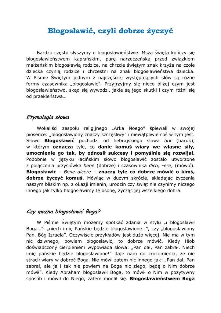 Błogosławić, czyli dobrze życzyć Bardzo często słyszymy o błogosławieństwie. Msza święta kończy się błogosławieństwem kapłańskim, parę narzeczeńską przed związkiem małżeńskim błogosławią rodzice, na chrzcie świętym znak krzyża na czole dziecka czynią rodzice i chrzestni na znak błogosławieństwa dziecka. W Piśmie Świętym jednym z najczęściej występujących słów są różne formy czasownika „błogosławić”. Przyjrzyjmy się nieco bliżej czym jest błogosławieństwo, skąd się wywodzi, jakie są jego skutki i czym różni się od przekleństwa… Etymologia słowa Wokaliści zespołu religijnego „Arka Noego” śpiewali w swojej piosence: „błogosławiony znaczy szczęśliwy” i niewątpliwie coś w tym jest. Słowo Błogosławić pochodzi od hebrajskiego słowa brk (baruk), w którym oznacza tyle, co danie komuś wiary we własne siły, umocnienie go tak, by odnosił sukcesy i pomyślnie się rozwijał. Podobnie w języku łacińskim słowo błogosławić zostało utworzone z połączenia przysłówka bene (dobrze) i czasownika dico, -ere, (mówić). Błogosławić – Bene dicere – znaczy tyle co dobrze mówić o kimś, dobrze życzyć komuś. Mówiąc w dużym skrócie, składając życzenia naszym bliskim np. z okazji imienin, urodzin czy świąt nie czynimy niczego innego jak tylko błogosławimy tę osobę, życząc jej wszelkiego dobra. Czy można błogosławić Boga? W Piśmie Świętym możemy spotkać zdania w stylu „i błogosławił Boga…”, „niech imię Pańskie będzie błogosławione…”, czy „błogosławiony Pan, Bóg Izraela”. Oczywiście przykładów jest dużo więcej. Nie ma w tym nic dziwnego, bowiem błogosławić, to dobrze mówić. Kiedy Hiob doświadczony cierpieniem wypowiada słowa: „Pan dał, Pan zabrał. Niech imię pańskie będzie błogosławione!” daje nam do zrozumienia, że nie stracił wiary w dobroć Boga. Nie mówi zatem nic innego jak: „Pan dał, Pan zabrał, ale ja i tak nie powiem na Boga nic złego, będę o Nim dobrze mówił”. Kiedy Abraham błogosławił Boga, to mówił o Nim w pozytywny sposób i mówił do Niego, zatem modlił się. Błogosławieństwem Boga jest dobre mówienie Bogu – modlitwa, i dobre mówienie o Bogu, czyli świadectwo wiary. Nic więc dziwnego, że Maryja w „Magnificat” woła: „błogosławić Go (Boga) będą wszystkie pokolenia”. Wielka moc, niewielkich słów… Nasze słowa mają wielką moc wtedy kiedy wypowiadamy je z głębi serca, dlatego Pismo Święte przestrzega nas często przed bezmyślnym korzystaniem z daru mowy. Niejednokrotnie nie jesteśmy świadomi jaką moc złożył Bóg w naszych słowach. Z naszych ust może wychodzić błogosławieństwo, albo przekleństwo. Od naszej woli zależy, czy będziemy orędownikami pokoju, czy niezgody. Niestety we współczesnym świecie ludzie rzadko błogosławią – nie chodzi mi tutaj o jasną formę błogosławieństwa, ale bardziej o dobre słowo skierowane do drugiej osoby, które może stać się błogosławieństwem. Bo czy nie jest błogosławieństwem wysłanie do bliskiej osoby smsa o treści: „dobrze, że jesteś”? Czy przyjacielskie „jestem z Tobą. Możesz na mnie liczyć” nie jest błogosławieństwem dla strapionego? Takie słowa potrafią przywrócić wiarę w siebie, uskrzydlić, pozwalają pokonywać własne możliwości i zdobywać szczyty! Ileż byłoby więcej radości we współczesnym świecie, gdyby mąż mówił swej żonie, że ta jest dla niego darem, że pięknie wygląda, że jest z nią szczęśliwy. A tymczasem w wielu przypadkach żona słyszy od męża, że zmarnowała mu życie, że nic nie potrafi, że gdyby nie on, to niczego by w życiu nie osiągnęła. Tak samo i żona, która wypomina mężowi, że nie potrafi znaleźć pracy i jest zwykłym „darmozjadem”, zamiast powiedzieć mu, że w jego ramionach mimo wszystko czuje się bezpiecznie. Dzieci, które zamiast usłyszeć od rodziców, że są dla nich darem, słyszą, że gdyby nie ta „wpadka” byliby dziś dużo szczęśliwsi… Lub zamiast pochwał słyszą tylko: „ty bekso”, „ty mamlasie”… Nie wspominając już o wielu młodych ludziach, którzy nie otrzymują błogosławieństwa od rodziców na ich wybory życiowe: małżeństwo, kapłaństwo, życie zakonne… A przecież słowa potrafią bardziej zranić niż niejedna kara fizyczna… Nie dziwcie się moim Przyjaciele, że nie latamy jak aniołowie, skoro sami sobie podcinamy skrzydła cierpkimi słowami i pozbawiamy się orzeźwiającego podmuchu błogosławieństwa. Nie dziwmy się, że ludzie młodzi szukają akceptacji, tam gdzie są rozumiani, że małe dzieci mają zniszczone dzieciństwo a potem dorośli są tylko małymi dziećmi opancerzonymi w dorosłe ciało… ANTY błogosławieństwo, czyli przekleństwo! Skoro nie błogosławimy, nie rozdajemy szczęścia, nie pragniemy szczęścia innych osób, to powoli zamykamy się w sobie. Zazdrość, zło i niepokój zaczynają gościć w naszych sercach. Stąd już blisko do przekleństwa. Oczywiście „przeklinanie” to nie jest używanie wulgaryzmów. Przeklinanie to składowa staropolskiego „PRE” (dziś: „PRZEZ”) i „KLĄTWA”. Przekleństwo oznacza zatem działanie „przez klątwę”. Stanowi rzucenie uroku, odwołanie się do sił magicznych lub po prostu pragnienie zła drugiej osoby. Wyrazem bliskoznacznym dla przekleństwa jest złorzeczenie, składające się z wyrazu „ZŁO” i „RZEKAĆ” (staropolskie „mówić”). O ile błogosławieństwo jest życzeniem dobra, o tyle przekleństwo jest życzeniem zła! Tak jak błogosławieństwo może uskrzydlić człowieka, tak samo przekleństwo może pozbawić go nadziei. Jeśli małżonkowie podczas kłótni wymieniając poglądy będą sobie ubliżać słowami „jesteś głupi”, „nic nie jesteś warta”, „niech cię szlag trafi”… To nie dziwmy się, że w takiej rodzinie ni