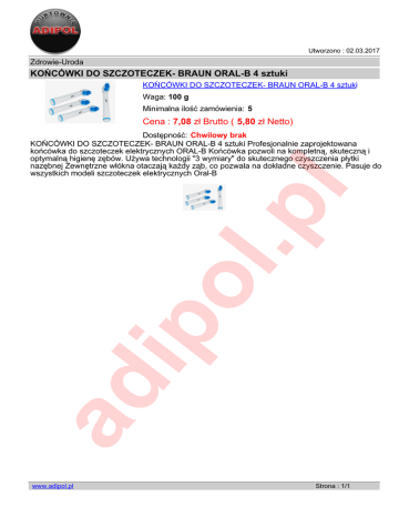 Utworzono : 02.03.2017 Zdrowie-Uroda KOŃCÓWKI DO SZCZOTECZEK- BRAUN ORAL-B 4 sztuki KOŃCÓWKI DO SZCZOTECZEK- BRAUN ORAL-B 4 sztuki Waga: 100 g Minimalna ilość zamówienia: 5 Cena : 7,08 zł Brutto ( 5,80 zł Netto) ad ip ol .p l Dostępność: Chwilowy brak KOŃCÓWKI DO SZCZOTECZEK- BRAUN ORAL-B 4 sztuki Profesjonalnie zaprojektowana końcówka do szczoteczek elektrycznych ORAL-B Końcówka pozwoli na kompletną, skuteczną i optymalną higienę zębów. Używa technologii "3 wymiary" do skutecznego czyszczenia płytki nazębnej Zewnętrzne włókna otaczają każdy ząb, co pozwala na dokładne czyszczenie. Pasuje do wszystkich modeli szczoteczek elektrycznych Oral-B www.adipol.pl Powered by TCPDF (www.tcpdf.org) Strona : 1/1