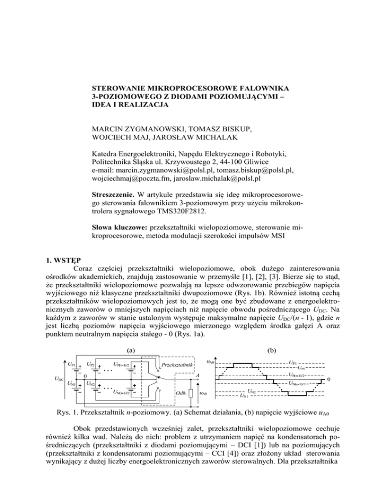 STEROWANIE MIKROPROCESOROWE FALOWNIKA 3-POZIOMOWEGO Z DIODAMI POZIOMUJĄCYMI – IDEA I REALIZACJA MARCIN ZYGMANOWSKI, TOMASZ BISKUP, WOJCIECH MAJ, JAROSŁAW MICHALAK Katedra Energoelektroniki, Napędu Elektrycznego i Robotyki, Politechnika Śląska ul. Krzywoustego 2, 44-100 Gliwice e-mail: [email protected], [email protected], [email protected], [email protected] Streszczenie. W artykule przedstawia się ideę mikroprocesorowego sterowania falownikiem 3-poziomowym przy użyciu mikrokontrolera sygnałowego TMS320F2812. Słowa kluczowe: przekształtniki wielopoziomowe, sterowanie mikroprocesorowe, metoda modulacji szerokości impulsów MSI 1. WSTĘP Coraz częściej przekształtniki wielopoziomowe, obok dużego zainteresowania ośrodków akademickich, znajdują zastosowanie w przemyśle [1], [2], [3]. Bierze się to stąd, że przekształtniki wielopoziomowe pozwalają na lepsze odwzorowanie przebiegów napięcia wyjściowego niż klasyczne przekształtniki dwupoziomowe (Rys. 1b). Również istotną cechą przekształtników wielopoziomowych jest to, że mogą one być zbudowane z energoelektronicznych zaworów o mniejszych napięciach niż napięcie obwodu pośredniczącego UDC. Na każdym z zaworów w stanie ustalonym występuje maksymalne napięcie UDC/(n - 1), gdzie n jest liczbą poziomów napięcia wyjściowego mierzonego względem środka gałęzi A oraz punktem neutralnym napięcia stałego - 0 (Rys. 1a). Rys. 1. Przekształtnik n-poziomowy. (a) Schemat działania, (b) napięcie wyjściowe uA0 Obok przedstawionych wcześniej zalet, przekształtniki wielopoziomowe cechuje również kilka wad. Należą do nich: problem z utrzymaniem napięć na kondensatorach pośredniczących (przekształtniki z diodami poziomującymi – DCI [1]) lub na poziomujących (przekształtniki z kondensatorami poziomującymi – CCI [4]) oraz złożony układ sterowania wynikający z dużej liczby energoelektronicznych zaworów sterowalnych. Dla przekształtnika 3-fazowego n-poziomowego potrzebnych jest 6·(n - 1) sygnałów sterujących. W niniejszym artykule omawia się metodę modulacji szerokości impulsów (MSI) z sygnałem nośnym dla falownika 3-poziomowego (n = 3) z diodami poziomującymi [5] (Rys. 2). Metoda sterowania jest zrealizowana w oparciu o mikrokontroler sygnałowy TMS320F2812 firmy Texas Instruments. Rys. 2. Trójfazowy falownik 3-poziomowy 2. STEROWANIE FALOWNIKIEM 3-POZIOMOWYM Z DIODAMI POZIOMUJĄCYMI 2.1 Podstawy Falowniki wielopoziomowe mogą być sterowane przy użyciu kilku metod [1], [6]: a) metody wektora przestrzennego, b) metody eliminacji poszczególnych harmonicznych, c) metody MSI z sygnałem nośnym i d) metody wektora przestrzennego MSI. Dwie pierwsze metody są metodami o niskiej częstotliwości przełączania (najczęściej równej częstotliwości podstawowej harmonicznej) i nadają się do sterowania falownikami wielopoziomowymi o n > 7 [6]. Metody wymienione w podpunktach c) i d) są metodami o częstotliwości przełączania wielokrotnie większej niż częstotliwość podstawowa napięć wyjściowych falownika. W przypadku falownika 3-poziomowego jedynie metody c) i d) dają pożądane przebiegi napięć wyjściowych. Na Rys. 3 przedstawiono schemat ideowy układu sterowania jednej fazy falownika 3-poziomowego wykorzystującego metodę z sygnałem nośnym Rys. 3. Układ sterowania jednej fazy falownika 3-poziomowego wykorzystujący metodę z trójkątnym sygnałem nośnym: a) schemat; przebiegi napięcia wyjściowego dla mf = 21 i gm = Am/period = 0,8: b) dla metody naturalnej, c) dla metody regularnej niesymetrycznej Na Rys 3b i 3c przedstawiono sposób wytwarzania napięcia wyjściowego uA0 dla metody naturalnej oraz regularnej niesymetrycznej. W obu przypadkach wykorzystuje się dwa sygnały nośne które porównywane są z sygnałem modulującym. Przy realizacji mikroprocesorowej ten sposób sterowania wymaga zastosowania dwóch komparatorów na każdą fazę falownika, co dla trójfazowego falownika 3-poziomowego powoduje, że potrzebnych jest 6 komparatorów. Dodatkowo każdy z komparatorów pracuje tylko przez połowe okresu sygnału modulującego – 1/fm. Innym bardziej efektywnym wykorzystaniem układów komparujących jest wytwarzanie sygnałów sterujących falownikiem przy wykorzystaniu jednego sygnału nośnego i dwóch sygnałów modulujących S1 i S2 tak jak przedstawiono na Rys. 4. Rys. 4. Zredukowanie dwóch sygnałów nośnych NS1, NS2 do jednego N Dla dodatnich wartości sygnału modulującego M komparator porównuje sygnał modulujący MS1 = M, podczas gdy sygnał MS2 = period. Dla ujemnych wartości sygnału M sygnał nośny N jest porównywany z sygnałem MS2 = M + period. W tym czasie sygnał MS1 równy jest zero. 2.2 Sterownik mikroprocesorowy z mikrokontrolerem TMS320F2812 Sterownik falownika 3-poziomowego zrealizowano za pomocą układu startowego – eZdspTM, który bazuje na mikrokontrolerze sygnałowym TMS320F2812 [8]. Program dla mikrokontrolera realizujący metodę regularną niesymetryczną napisano w języku C, a skompilowano używając oprogramowania Code Composer Studio. Procesor TMS320F2812 jest taktowany sygnałem zegarowym o częstotliwości fCLK = 150 MHz. Najważniejszymi częściami składowymi procesora użytymi do sterowania MSI są dwa bloki licznikowo-czasowe (Event Manager - EV) [9]. W skład każdego z nich wchodzą m.in.: trzy podwójnie buforowane 16-bitowe komparatory (Compare Unit), licznik 16-bitowy (GP Timer) realizujący sygnał nośny oraz sześć dowolnie konfigurowanych wyjść MSI przyporządkowanych parami do odpowiednich komparatorów. Licznik może być taktowany sygnałem zegarowym o częstotliwości fCLK/k (gdzie k = 1, 2, 4, ..., 128). Przedstawiona powyżej metoda z jednym sygnałem nośnym wymaga użycia tylko jednego układu EV, w którym trzy komparatory porównują sygnały dla każdej z faz osobno. Takie rozwiązanie oznacza rezygnację z generowania czasu martwego. Okazuje sie jednak, że dla