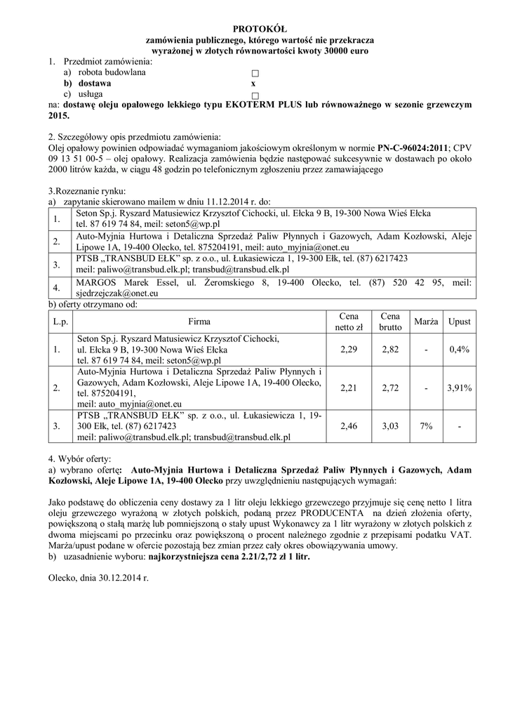 PROTOKÓŁ zamówienia publicznego, którego wartość nie przekracza wyrażonej w złotych równowartości kwoty 30000 euro 1. Przedmiot zamówienia: a) robota budowlana b) dostawa x c) usługa na: dostawę oleju opałowego lekkiego typu EKOTERM PLUS lub równoważnego w sezonie grzewczym 2015. 2. Szczegółowy opis przedmiotu zamówienia: Olej opałowy powinien odpowiadać wymaganiom jakościowym określonym w normie PN-C-96024:2011; CPV 09 13 51 00-5 – olej opałowy. Realizacja zamówienia będzie następować sukcesywnie w dostawach po około 2000 litrów każda, w ciągu 48 godzin po telefonicznym zgłoszeniu przez zamawiającego 3.Rozeznanie rynku: a) zapytanie skierowano mailem w dniu 11.12.2014 r. do: Seton Sp.j. Ryszard Matusiewicz Krzysztof Cichocki, ul. Ełcka 9 B, 19-300 Nowa Wieś Ełcka 1. tel. 87 619 74 84, meil: [email protected] Auto-Myjnia Hurtowa i Detaliczna Sprzedaż Paliw Płynnych i Gazowych, Adam Kozłowski, Aleje 2. Lipowe 1A, 19-400 Olecko, tel. 875204191, meil: [email protected] PTSB „TRANSBUD EŁK” sp. z o.o., ul. Łukasiewicza 1, 19-300 Ełk, tel. (87) 6217423 3. meil: [email protected]; [email protected] MARGOS Marek Essel, ul. Żeromskiego 8, 19-400 Olecko, tel. (87) 520 42 95, meil: 4. [email protected] b) oferty otrzymano od: Cena Cena L.p. Firma Marża Upust netto zł brutto Seton Sp.j. Ryszard Matusiewicz Krzysztof Cichocki, 1. 2,29 2,82 0,4% ul. Ełcka 9 B, 19-300 Nowa Wieś Ełcka tel. 87 619 74 84, meil: [email protected] Auto-Myjnia Hurtowa i Detaliczna Sprzedaż Paliw Płynnych i Gazowych, Adam Kozłowski, Aleje Lipowe 1A, 19-400 Olecko, 2. 2,21 2,72 3,91% tel. 875204191, meil: [email protected] PTSB „TRANSBUD EŁK” sp. z o.o., ul. Łukasiewicza 1, 193. 2,46 3,03 7% 300 Ełk, tel. (87) 6217423 meil: [email protected]; [email protected] 4. Wybór oferty: a) wybrano ofertę: Auto-Myjnia Hurtowa i Detaliczna Sprzedaż Paliw Płynnych i Gazowych, Adam Kozłowski, Aleje Lipowe 1A, 19-400 Olecko przy uwzględnieniu następujących wymagań: Jako podstawę do obliczenia ceny dostawy za 1 litr oleju lekkiego grzewczego przyjmuje się cenę netto 1 litra oleju grzewczego wyrażoną w złotych polskich, podaną przez PRODUCENTA na dzień złożenia oferty, powiększoną o stałą marżę lub pomniejszoną o stały upust Wykonawcy za 1 litr wyrażony w złotych polskich z dwoma miejscami po przecinku oraz powiększoną o procent należnego zgodnie z przepisami podatku VAT. Marża/upust podane w ofercie pozostają bez zmian przez cały okres obowiązywania umowy. b) uzasadnienie wyboru: najkorzystniejsza cena 2.21/2,72 zł 1 litr. Olecko, dnia 30.12.2014 r.