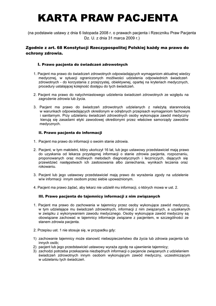 KARTA PRAW PACJENTA (na podstawie ustawy z dnia 6 listopada 2008 r. o prawach pacjenta i Rzeczniku Praw Pacjenta Dz. U. z dnia 31 marca 2009 r.) Zgodnie z art. 68 Konstytucji Rzeczypospolitej Polskiej każdy ma prawo do ochrony zdrowia. I. Prawo pacjenta do świadczeń zdrowotnych 1. Pacjent ma prawo do świadczeń zdrowotnych odpowiadających wymaganiom aktualnej wiedzy medycznej, w sytuacji ograniczonych możliwości udzielenia odpowiednich świadczeń zdrowotnych - do korzystania z przejrzystej, obiektywnej, opartej na kryteriach medycznych, procedury ustalającej kolejność dostępu do tych świadczeń. 2. Pacjent ma prawo do natychmiastowego udzielenia świadczeń zdrowotnych ze względu na zagrożenie zdrowia lub życia. 3. Pacjent ma prawo do świadczeń zdrowotnych udzielanych z należytą starannością w warunkach odpowiadających określonym w odrębnych przepisach wymaganiom fachowym i sanitarnym. Przy udzielaniu świadczeń zdrowotnych osoby wykonujące zawód medyczny kierują się zasadami etyki zawodowej określonymi przez właściwe samorządy zawodów medycznych. II. Prawo pacjenta do informacji 1. Pacjent ma prawo do informacji o swoim stanie zdrowia. 2. Pacjent, w tym małoletni, który ukończył 16 lat, lub jego ustawowy przedstawiciel mają prawo do uzyskania od lekarza przystępnej informacji o stanie zdrowia pacjenta, rozpoznaniu, proponowanych oraz możliwych metodach diagnostycznych i leczniczych, dających się przewidzieć następstwach ich zastosowania albo zaniechania, wynikach leczenia oraz rokowaniu. 3. Pacjent lub jego ustawowy przedstawiciel mają prawo do wyrażenia zgody na udzielenie w/w informacji innym osobom przez siebie upoważnionym. 4. Pacjent ma prawo żądać, aby lekarz nie udzielił mu informacji, o których mowa w ust. 2. III. Prawo pacjenta do tajemnicy informacji z nim związanych 1. Pacjent ma prawo do zachowania w tajemnicy przez osoby wykonujące zawód medyczny, w tym udzielające mu świadczeń zdrowotnych, informacji z nim związanych, a uzyskanych w związku z wykonywaniem zawodu medycznego. Osoby wykonujące zawód medyczny są obowiązane zachować w tajemnicy informacje związane z pacjentem, w szczególności ze stanem zdrowia pacjenta. 2. Przepisu ust. 1 nie stosuje się, w przypadku gdy: 1) zachowanie tajemnicy może stanowić niebezpieczeństwo dla życia lub zdrowia pacjenta lub innych osób; 2) pacjent lub jego przedstawiciel ustawowy wyraża zgodę na ujawnienie tajemnicy; 3) zachodzi potrzeba przekazania niezbędnych informacji o pacjencie związanych z udzielaniem świadczeń zdrowotnych innym osobom wykonującym zawód medyczny, uczestniczącym w udzielaniu tych świadczeń. IV. Prawo pacjenta do wyrażenia zgody na udzielenie świadczeń zdrowotnych 1. Pacjent ma prawo do wyrażenia zgody na udzielenie określonych świadczeń zdrowotnych lub odmowy takiej zgody, po uzyskaniu informacji o swoim stanie zdrowia. 2. Pacjent, w tym małoletni, który ukończył 16 lat, ma prawo do wyrażenia zgody lub sprzeciwu co do przeprowadzenia lub udzielenia innych świadczeń zdrowotnych przez lekarza. 3. W przypadku zabiegu operacyjnego albo zastosowania metody leczenia lub diagnostyki stwarzających podwyższone ryzyko dla pacjenta, zgodę wyraża się w formie pisemnej. V. Prawo do poszanowania intymności i godności pacjenta 1. Pacjent ma prawo do poszanowania intymności i godności, w szczególności w czasie udzielania mu świadczeń zdrowotnych. 2. Prawo do poszanowania godności obejmuje także prawo do umierania w spokoju i godności. Pacjent znajdujący się w stanie terminalnym ma prawo do świadczeń zdrowotnych zapewniających łagodzenie bólu i innych cierpień. 3. Przy udzielaniu świadczeń zdrowotnych może być obecna osoba bliska. 4. Osoba wykonująca zawód medyczny udzielająca świadczeń zdrowotnych pacjentowi może odmówić obecności osoby bliskiej przy udzielaniu świadczeń zdrowotnych, w przypadku istnienia prawdopodobieństwa wystąpienia zagrożenia epidemicznego lub ze względu na bezpieczeństwo zdrowotne pacjenta. Odmowę odnotowuje się w dokumentacji medycznej. VI. Prawo pacjenta do dokumentacji medycznej 1. Pacjent ma prawo do dostępu do dokumentacji medycznej dotyczącej jego stanu zdrowia oraz udzielonych mu świadczeń zdrowotnych. 2. Pacjent ma prawo do udostępnienia mu dokumentacji medycznej lub upoważnienia innej osoby, której dokumentacja ta może być udostępniona. 3. Za udostępnienie dokumentacji medycznej np. w formie kserokopii zakład opieki zdrowotnej udzielający świadczeń zdrowotnych może pobierać od pacjenta opłatę. Opłatę za udostępnienie dokumentacji medycznej ustala zakład opieki zdrowotnej udzielający świadczeń zdrowotnych w oparciu o ustawę. 4. Pacjent ma prawo do zapewnienia ochrony danych zawartych w dokumentacji medycznej dotyczącej jego osoby. 5. Po śmierci pacjenta, prawo wglądu w dokumentację medyczną ma osoba upoważniona przez pacjenta za życia. VII. Prawo pacjenta do zgłoszenia sprzeciwu wobec opinii albo orzeczenia lekarza 1. Pacjent lub jego przedstawiciel ustawowy mogą wnieść sprzeciw wobec opinii albo orzeczenia lekarza, jeżeli opinia albo orzeczenie ma wpływ na prawa lub obowiązki pacjenta wynikające z przepisów prawa. 2. Sprzeciw wnosi się do Komisji Lekarskiej działającej przy Rzeczniku Praw Pacjenta, za pośrednictwem Rzecznika Praw Pacjenta, w terminie 30 dni od dnia wydania opinii albo orzeczenia przez lekarza orzekającego o stanie zdrowia pacjenta. Sprzeciw wymaga uzasadnienia. 3. Pacjent ma prawo do wnioskowania do lekarza o zasięgnięcie przez niego opinii innego lekarza specjalisty lub zorganizowania konsylium lekarskiego. VIII. 1. Prawo pacjenta do poszanowania życia prywatnego i rodzinnego Pacjent w zakładzie opieki zdrowotnej przeznaczonym dla osób wymagających całodobowych lub całodziennych świadczeń zdrowotnych ma prawo do kontaktu osobistego, telefonicznego lub korespondencyjnego z innymi osoba
