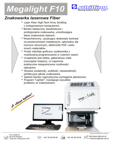 Megalight F10 Znakowarka laserowa Fiber * Laser Fiber High-Tech firmy Schilling z zintegrowanym komputerem. * Bardzo elastyczna, bezdotykowa i profesjonalna znakowarka, umożliwiająca łatwe znakowanie laserem. * Wszechstronny, uzyskujący doskonały kontrast na powierzchniach metalowych, optymalny dla tworzyw sztucznych, elektroniki PCB i wielu innych materiałów. * Prosty interfejs graficzny użytkownika z możliwością programowania w czterech osiach * Urządzenie jest lekkie, gabarytowo małe (oszczędza miejsce), co zapewnia praktycznie nieograniczone możliwości zabudowy. * Wysoka wydajność, szybkość, niezawodność, perfekcyjna jakość znakowania. * Spełnia bardzo rygorystyczne wymagania jakościowe. * Program “Lighter”, rozwiązuje wszystkie problemy ze znakowaniem. Technical modifications reserved! P.U.H.MILTA 80-018 Gdańsk Trakt Św. Wojciecha 253 +48 / 58 324-90-56 +48 / 58 324-90-56 http://www.milta.com.pl e-mail:[email protected] Megalight F10 CHARAKTERYSTYKA TECHNICZNA MODEL LASERA Źródło laserowe Długość fali Moc nominalna Impuls energii (max) Moc maksymalna Zakres częstotliwości Szerokość impulsu Gwarancja Laser mierniczy Długość kabli zasilających Głowica znakująca Obiektyw F-theta Odległość robocza Pole opisowe Prędkość znakowania MOF prędkość liniowa obiektu Komunikacja Układ chłodzenia Zużycie energii Zasilanie Rack 19”- obudowa z wbudowanym PC Głowica znakująca Laserowa kabina bezpieczeństwa Max. wielkość znakowanej części Rack 19”- obudowa z wbudowanym PC Głowica znakująca Megalight F10 Laser pulsacyjny FIBER 1060 - 1080 nm 10 W (realna moc na powierzchni przedmiotu znakowanego) 0,5 mJ 5 kW 20 - 100 kHz 100 ns 24 miesiące dla nowego systemu laserowego. Dla remontowanych laserów - 6 miesięcy. Czerwona dioda laserowa dla wyświetlenia rozmiaru i położenia, druga dioda to wskaźnik skupienia. 3 m (standard), 5 m i 7 m. (opcjonalnie) Różne długości ogniskowych 254S 160S _ 2 mm _ 2 mm 181 + 290 + S (small)O (małe = 47mm) Inne długości ogniskowych na życzenie 100 x 100 mm 140x140 mm 2000 mm / s, z obiektywem f = 160 Znakowanie w ruchu < 75 m/min/<3 szt./s prędkości linii (jeden ciąg linii, czcionka Roman-s RS 232, Ethernet, USB 2.0 Chłodzenie powietrzem (zintegrowany) Typowa 250W, max.300W 100 - 240 VAC, 50/60 Hz Wymiary całkowite (szer. x głęb. x wys., mm) 430 x 370 x 106 112 x 298 x 90 638 x 968 x 871 (inne wymiary na zamówienie) 465 x 255 x 315 ( f=160mm) Ciężar : 16 kg (35,3 Ibs) 2 kg (4,4 Ibs) Klasa ochrony IP 20 IP 54 I klasa bezpieczeństwa Rack 19”- obudowa z wbudowanym PC Głowica znakująca Laserowa kabina bezpieczeństwa Wibracje Przyspieszenie max. Zakres temperatur pracy Obsługiwana wysokość Hałas Wilgotność Zgodność z dyrektywami maszynowymi EU Zgodność z standardami EU Klasy lasera Warunki otoczenia Nie dozwolone 0,5 G + 5°C do 42°C (41° do 108° F) przy 100% mocy < 2000 m. (6,660 stóp) < 70dB < 80% bez kondesacji 2004/108/WE Dyrektywa “ Kompatybilność elektromagnetyczna” 2006/95/EEC Dyrektywa “ Niskonapięciowe wyroby elektryczne” EN 60204-1 Bezpieczeństwo maszyn EN 60825-1 Bezpieczeństwo urządzeń laserowych EN 61000-6-4 Urządzenia o częstotliwości radiowej EN 61000-6-2 Kompatybilność elektromagnetyczna Laser roboczy @ 1064nm: Klasa IV Laser pompowany @ 808nm: Klasa IV Laser mierniczy @ 635nm: Klasa 2;5mW Zastosowanie Ultra-kompaktowa głowica znakująca z najmniejszymi wymiarami, umożliwia swobodną instalację w liniach produkcyjnych lub wewnątrz maszyn, gdzie ograniczona przestrzeń jest kwestią kluczową. Doskonałe oraz dokładne wyniki znakowania. Najkrótszy czas znakowania. Doskonały kontrast na powierzchniach metalowych takich jak części stalowe pojazdów, narzędzi chirurgicznych , odlewów z żeliwa. Optymalna dla tworzyw sztucznych, elektroniki PCB i innych komponentów. Uwagi: Zastrzegamy możliwość wprowadzenia zmian technicznych bez uprzedzenia. P.U.H MILTA 80-018 Gdańsk Trakt Św. Wojciecha 253 Technical modifications reserved! +48 / 58 324-90-56 +48 / 58 324-90-56 http://www.milta.com.pl e-mail:[email protected]