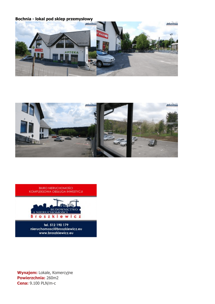 Bochnia - lokal pod sklep przemysłowy Wynajem: Lokale, Komercyjne Powierzchnia: 260m2 Cena: 9.100 PLN/m-c Dostępność: Dostępne Typ: Lokal Nr oferty: 236 Bochnia - lokal do wynajęcia z przeznaczeniem na sklep przemysłowy. Możliwość wynajmu lokali położonych na parterze lub piętrze, w budynku o łącznej powierzchni użytkowej 1200m2. Cena zawarta w tym ogłoszeniu dotyczy lokalu położonego na parterze, o powierzchni użytkowej 260m2 i zawiera opłatę za ogrzewanie. Możliwość wynajęcia dodatkowej powierzchni w atrakcyjnej cenie(dodatkowe 240m2 Budynek w którym mieszczą się lokale to nowo wybudowany obiekt o ładnej i ciekawej architekturze wykonany z wysokiej klasy materiałów, estetycznie wykończony, znajdują się w nim przestronne wysokie pomieszczenia(4m) i duże witryny. Na zewnątrz znajduje się duży, wygodny parking, o nawierzchni asfaltowej. Teren działki ogrodzony i zagospodarowany, zainstalowany monitoring zewnętrzny, szeroka brama wjazdowa, możliwość przejazdu dookoła budynku. Dostosowanie lokalu do wymagań klienta i pozostałe warunki wynajmu - do uzgodnienia. Łączna powierzchnia użytkowa objęta ofertą wynajmu może wynosić 500m2. Podana cena jest ceną netto. Cena do negocjacji. Obecnie w pozostałych lokalach w budynku prosperują - supermarket z małą gastronomią , apteka, lokale o przeznaczeniu biurowym. W ramach promocji oferta uwzględnia pierwszy miesiąc najmu bez pobierania opłat za czynsz. Dobra lokalizacja, przy głównej ulicy wjazdowej do Bochni. Zapraszamy!! Adres tego pliku: http://broszkiewicz.eu/pdf/offer/238 Adres oferty na stronie: http://broszkiewicz.eu/site/offers/show/238/bochnia-lokal-pod-sklep-przemyslowy.html