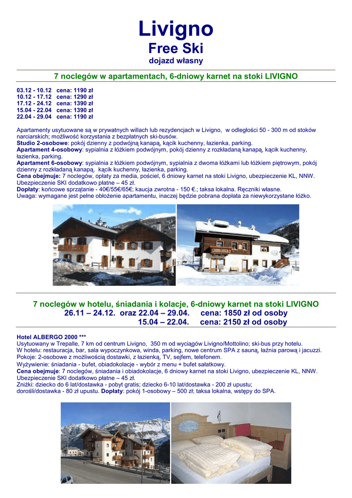 Livigno Free Ski dojazd własny 7 noclegów w apartamentach, 6-dniowy karnet na stoki LIVIGNO 03.12 - 10.12 10.12 - 17.12 17.12 - 24.12 15.04 - 22.04 22.04 - 29.04 cena: 1190 zł cena: 1290 zł cena: 1390 zł cena: 1390 zł cena: 1190 zł Apartamenty usytuowane są w prywatnych willach lub rezydencjach w Livigno, w odległości 50 - 300 m od stoków narciarskich; możliwość korzystania z bezpłatnych ski-busów. Studio 2-osobowe: pokój dzienny z podwójną kanapą, kącik kuchenny, łazienka, parking. Apartament 4-osobowy: sypialnia z łóżkiem podwójnym, pokój dzienny z rozkładaną kanapą, kącik kuchenny, łazienka, parking. Apartament 6-osobowy: sypialnia z łóżkiem podwójnym, sypialnia z dwoma łóżkami lub łóżkiem piętrowym, pokój dzienny z rozkładaną kanapą, kącik kuchenny, łazienka, parking. Cena obejmuje: 7 noclegów, opłaty za media, pościel, 6 dniowy karnet na stoki Livigno, ubezpieczenie KL, NNW. Ubezpieczenie SKI dodatkowo płatne – 45 zł. Dopłaty: końcowe sprzątanie - 40€/55€/65€; kaucja zwrotna - 150 €.; taksa lokalna. Ręczniki własne. Uwaga: wymagane jest pełne obłożenie apartamentu, inaczej będzie pobrana dopłata za niewykorzystane łóżko. 7 noclegów w hotelu, śniadania i kolacje, 6-dniowy karnet na stoki LIVIGNO 26.11 – 24.12. oraz 22.04 – 29.04. cena: 1850 zł od osoby 15.04 – 22.04. cena: 2150 zł od osoby Hotel ALBERGO 2000 *** Usytuowany w Trepalle, 7 km od centrum Livigno, 350 m od wyciągów Livigno/Mottolino; ski-bus przy hotelu. W hotelu: restauracja, bar, sala wypoczynkowa, winda, parking, nowe centrum SPA z sauną, łaźnia parową i jacuzzi. Pokoje: 2-osobowe z możliwością dostawki, z łazienką, TV, sejfem, telefonem. Wyżywienie: śniadania - bufet, obiadokolacje - wybór z menu + bufet sałatkowy. Cena obejmuje: 7 noclegów, śniadania i obiadokolacje, 6 dniowy karnet na stoki Livigno, ubezpieczenie KL, NNW. Ubezpieczenie SKI dodatkowo płatne – 45 zł. Zniżki: dziecko do 6 lat/dostawka - pobyt gratis; dziecko 6-10 lat/dostawka - 200 zł upustu; dorośli/dostawka - 80 zł upustu. Dopłaty: pokój 1-osobowy – 500 zł; taksa lokalna, wstępy do SPA.
