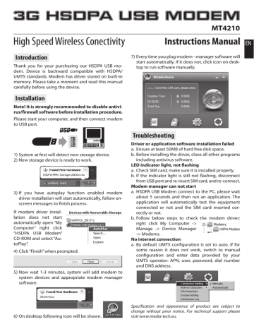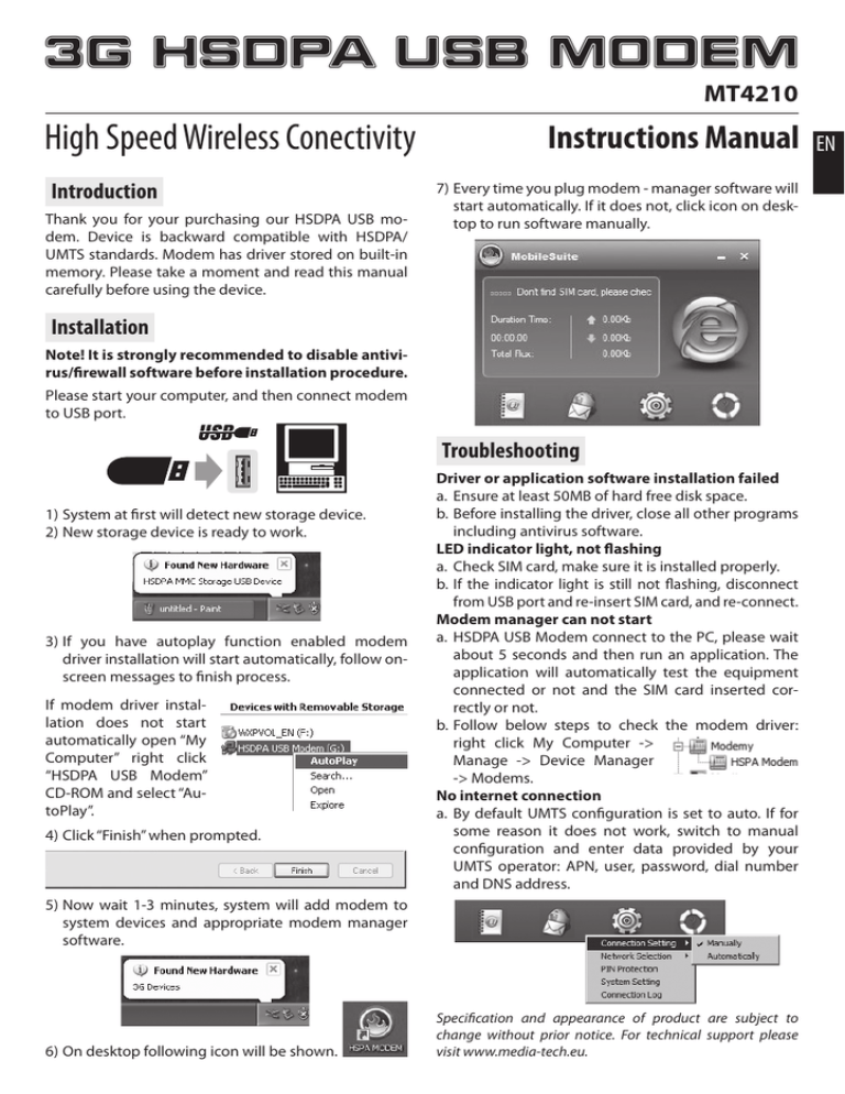 3G HSDPA USB MODEM MT4210 High Speed Wireless Conectivity Introduction Thank you for your purchasing our HSDPA USB modem. Device is backward compatible with HSDPA/ UMTS standards. Modem has driver stored on built-in memory. Please take a moment and read this manual carefully before using the device. Instructions Manual 7) Every time you plug modem - manager software will start automatically. If it does not, click icon on desktop to run software manually. Installation Note! It is strongly recommended to disable antivirus/firewall software before installation procedure. Please start your computer, and then connect modem to USB port. Troubleshooting 1) System at first will detect new storage device. 2) New storage device is ready to work. 3) If you have autoplay function enabled modem driver installation will start automatically, follow onscreen messages to finish process. If modem driver installation does not start automatically open “My Computer” right click “HSDPA USB Modem” CD-ROM and select “AutoPlay”. 4) Click “Finish” when prompted. Driver or application software installation failed a. Ensure at least 50MB of hard free disk space. b. Before installing the driver, close all other programs including antivirus software. LED indicator light, not flashing a. Check SIM card, make sure it is installed properly. b. If the indicator light is still not flashing, disconnect from USB port and re-insert SIM card, and re-connect. Modem manager can not start a. HSDPA USB Modem connect to the PC, please wait about 5 seconds and then run an application. The application will automatically test the equipment connected or not and the SIM card inserted correctly or not. b. Follow below steps to check the modem driver: right click My Computer -> Manage -> Device Manager -> Modems. No internet connection a. By default UMTS configuration is set to auto. If for some reason it does not work, switch to manual configuration and enter data provided by your UMTS operator: APN, user, password, dial number and DNS address. 5) Now wait 1-3 minutes, system will add modem to system devices and appropriate modem manager software. 6) On desktop following icon will be shown. Specification and appearance of product are subject to change without prior notice. For technical support please visit www.media-tech.eu. EN 3G HSDPA USB MODEM MT4210 High Speed Wireless Conectivity Instrukcja obsługi Wprowadzenie Dziękujemy za zakup modemu HSDPA. Urządzenie jest zgodne z wcześniejszymi standardami HSDPA/ UMTS. Modem posiada sterownik zapisany w pamięci wewnętrznej. Prosimy o zapoznanie się z niniejszą instrukcją przed rozpoczęciem korzystania z urządzenia. 7) Za każdym razem gdy podłączysz modem oprogramowanie do zarządzania modemem uruchomi się automatycznie. Jeżeli tak się nie stanie, kliknij ikonę na pulpicie aby uruchomić ręcznie. Instalacja Ważne! Zalecamy wyłączenie oprogramowania typu antywirus przed rozpoczęciem instalacji. Uruchom komputer, następnie podłącz modem do portu USB. Zanim oddasz do serwisu 1) System wykryje najpierw nowe urządzenie magazynujące. 2) Urządzenie magazynujące jest gotowe do pracy. 3) Jeżeli masz aktywną funkcję „autouruchom” w systemie instalator sterownika modemu uruchomi się automatycznie, postępuj wg komunikatów na ekranie aby dokończyć proces instalacji. Jeżeli instalator sterownika modemu nie uruchomi się samoczynnie, otwórz ikonę “My computer”, kliknij prawym klawiszem na napędzie CD “HSDPA USB Modem” i wybierz opcję “AutoPlay”. 4) Kliknij “Finish” 5) Odczekaj 1-3 minut, System doda modem do urządzeń systemowych oraz zainstaluje oprogramowanie do zarządzania modemem. 6) Na pulpicie pojawi się ikona: Instalacja sterownika lub oprogramowania nie powiodła się. a. Upewnij się, że masz co najmniej 50MB wolnego miejsca na dysku twardym. b. Zamknij wszystkie aplikacje (także oprogramowanie antywirusowe) przed uruchomieniem instalatora. Dioda LED nie świeci się. a. Upewnij się, że poprawnie zainstalowałeś kartę SIM. b. Jeżeli dioda nadal się nie świeci, odłącz modem, wyjmij i włóż kartę SIM, ponownie podłącz do portu USB. Oprogramowanie do zarządzania modemem nie uruchamia się. a. Podłącz modem do portu USB, odczekaj 5 sekund i uruchom aplikację. Aplikacja wykryje czy modem oraz kartę SIM są podłączone prawidłowo. b. Sprawdź czy modem w menedżerze urządzeń nie żadnych znaków zapytania. Kliknij ikonę „My Computer -> Manage -> Device Manager -> Modems”. Brak połączenia z siecią Internet a. Domyślnie aplikacja ma włączoną opcję autokonfiguracji. Jeżeli z jakiegoś powodu opcja ta nie działa prawidłowo wybierz konfigurację ręczną i wprowadź parametry połączenia dostarczone przez Twojego operatora UMTS: APN, user, password, dial number oraz adresy DNS. Specyfikacja oraz wygląd urządzenia może ulec zmianie bez wcześniejszego powiadomienia. Pomoc techniczna dostępna na: www.media-tech.eu. PL