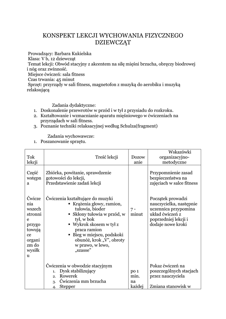 KONSPEKT LEKCJI WYCHOWANIA FIZYCZNEGO DZIEWCZĄT Prowadzący: Barbara Kukielska Klasa: V b, 12 dziewcząt Temat lekcji: Obwód stacyjny z akcentem na siłę mięśni brzucha, obręczy biodrowej i nóg oraz zwinność. Miejsce ćwiczeń: sala fitness Czas trwania: 45 minut Sprzęt: przyrządy w sali fitness, magnetofon z muzyką do aerobiku i muzyką relaksującą Zadania dydaktyczne: 1. Doskonalenie przewrotów w przód i w tył z przysiadu do rozkroku. 2. Kształtowanie i wzmacnianie aparatu mięśniowego w ćwiczeniach na przyrządach w sali fitness. 3. Poznanie techniki relaksacyjnej według Schulza(fragment) Zadania wychowawcze: 1. Poszanowanie sprzętu. Tok lekcji Część wstępn a Treść lekcji Dozow anie Zbiórka, powitanie, sprawdzenie gotowości do lekcji, Przedstawienie zadań lekcji Ćwicze Ćwiczenia kształtujące do muzyki nia Krążenia głowy, ramion, wszech tułowia, bioder stronni Skłony tułowia w przód, w e tył, w bok przygo Wykrok skosem w tył z towują praca ramion ce Bieg w miejscu, podskoki organi obunóż, krok „V”, obroty zm do w prawo, w lewo, wysiłk „szasse” u Ćwiczenia w obwodzie stacyjnym 1. Dysk stabilizujący 2. Rowerek 3. Ćwiczenia mm brzucha 4. Stepper Wskazówki organizacyjnometodyczne Przypomnienie zasad bezpieczeństwa na zajęciach w salce fitness 7minut po 1 min. na każdej Początek prowadzi nauczycielka, następnie uczennica przypomina układ ćwiczeń z poprzedniej lekcji i dodaje nowe kroki Pokaz ćwiczeń na poszczególnych stacjach przez nauczyciela Zmiana stanowisk w 5. 6. Część główna 7. 8. ( 25 min.) 9. 10. 11. 12. Hula-hop Uginanie ramion w klęku podpartym Orbitrek Ćwiczenie korekcyjne: w klęku podpartym wymach naprzemianstronny ręki i nogi Motylek Przewroty w przód i w tył Piłka gimnastyczna Ćwiczenia na mięśnie brzucha na przyrządzie (7 min. ) przeciwnym kierunku do ruchu wskazówek zegara. Należy przypomnieć o rozłożeniu siły i oddychaniu w czasie ćwiczeń Ćwiczenia rozciągające w parach. Obwód powtarzamy 2x Relaksacja wg Schulza stworzenie optymalnych warunków, tj.: wyłączenie światła, Leżenie swobodne na plecach Część końco wa stacji, przerw a 15 sek. „Przyjmijcie wygodną pozycję…zamknijcie oczy…i wykonajcie trzy głębokie oddechy…za chwilę zaczniemy relaksację…będę wypowiadała instrukcje w osobie pierwszej, tak jakby każdy z was wypowiadał te słowa przez siebie…starajcie się wczuwać w te instrukcje… zaczynamy… Leżę wygodnie…oddycham spokojnie…i rozluźniam wszystkie mięśnie…stopniowo całe ciało staje się przyjemnie ciężkie…zauważam to…odczuwam ręce…odczuwam moją prawą rękę…prawa ręka staje się ciężka… prawa ręka staje się ciężka…prawa ręka staje się coraz cięższa…prawa ręka staje się bardzo ciężka…odczuwam lewą rękę…lewa ręka staje się ciężka…lewa ręka staje się ciężka…lewa ręka staje się coraz cięższa…lewa ręka staje się bardzo ciężka…oddycham spokojnie…odczuwam nogi…odczuwam moją prawą nogę…prawa noga staje się ciężka…prawa noga staje się ciężka…prawa noga staje się coraz cięższa…prawa noga staje się bardzo przewietrz enie sali, włączenie muzyki relaksacyj nej, wypowiad anie poleceń spokojny mi łagodnym głosem Zadaniem prowadzącej jest nauczenie uczennic: 1. odpowiedniej pozycji ciała sprzyjającej odprężeniu fizycznemu i ciężka…odczuwam lewą nogę…lewa noga staje się ciężka…lewa noga staje się ciężka…lewa noga staje się coraz cięższa…lewa noga staje się bardzo ciężka…oddycham spokojnie i bez wysiłku…czuję serce, które pracuje równomiernie…rozluźniam mięśnie szyi i twarzy…głowa staje się ciężka…cała głowa staje się coraz cięższa…cała głowa staje się bardzo ciężka…rozluźniam plecy i cały tułów…staje się ciężki…całe ciało staje się przyjemnie…czuję spokój…czuję wewnętrzny spokój…odczuwam go…chciałabym, aby pozostał we mnie jak najdłużej po zakończeniu relaksacji… Stopniowo kończymy relaksację…ciężar i bezwład ciała powoli ustępuje…ciężar powoli oddala się…powraca energia i rześkość…odczuwasz lekkość i odprężenie…wracasz do swoich zajęć…otwierasz oczy…rozglądasz się i wolno wracasz do pozycji siedzącej. psychicznemu 2. świadomego odcięcia się od bodźców zewnętrznych 3. zauważanie reakcji płynących z własnego organizmu Dyskusja na temat wrażeń i odczuć w czasie odbywania relaksacji Wyłączenie muzyki Siad skrzyżny w półkolu Pożegnanie klasy.