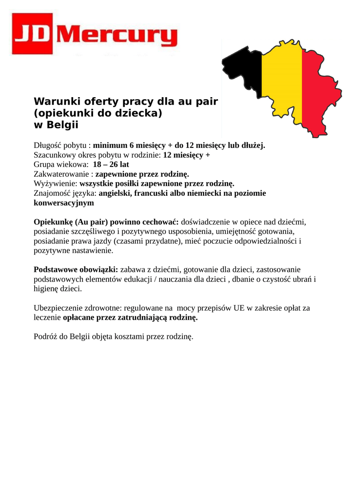 Warunki oferty pracy dla au pair (opiekunki do dziecka) w Belgii Długość pobytu : minimum 6 miesięcy + do 12 miesięcy lub dłużej. Szacunkowy okres pobytu w rodzinie: 12 miesięcy + Grupa wiekowa: 18 – 26 lat Zakwaterowanie : zapewnione przez rodzinę. Wyżywienie: wszystkie posiłki zapewnione przez rodzinę. Znajomość języka: angielski, francuski albo niemiecki na poziomie konwersacyjnym Opiekunkę (Au pair) powinno cechować: doświadczenie w opiece nad dziećmi, posiadanie szczęśliwego i pozytywnego usposobienia, umiejętność gotowania, posiadanie prawa jazdy (czasami przydatne), mieć poczucie odpowiedzialności i pozytywne nastawienie. Podstawowe obowiązki: zabawa z dziećmi, gotowanie dla dzieci, zastosowanie podstawowych elementów edukacji / nauczania dla dzieci , dbanie o czystość ubrań i higienę dzieci. Ubezpieczenie zdrowotne: regulowane na mocy przepisów UE w zakresie opłat za leczenie opłacane przez zatrudniającą rodzinę. Podróż do Belgii objęta kosztami przez rodzinę. Wymagane dokumenty: 1. Wniosek o pracę opiekunki do dziecka – wypełniany w biurze firmy J.D.Mercury w Warszawie, przy ul. Kalatówki 30 2. Zaświadczenie lekarskie, że osoba ubiegająca się o pracę jest zdrowa i może pracować z dziećmi (z uwzględnieniem dentysty, zaświadczenia o badaniu na HIV, testu ciążowego – na kilka dni przed przyjazdem) 3. Zaświadczenie o niekaralności (aktualne) 4. List intencyjny do rodziny zatrudniającej (w języku angielskim – pełną pomoc w tłumaczeniu oferuje nasza firma) oraz dwie referencje od osób spoza rodziny 5. Cztery zdjęcia (jak do paszportu) oraz zdjęcia wnioskodawcy najlepiej z dziećmi 6. Kserokopia paszportu, posiadanych referencji lub innych dokumentów mogących poświadczyć posiadane doświadczenie – np. dyplomy – świadectwo ukończenia szkoły średniej (kopie wszystkich dokumentów można wykonać w biurze firmy) 7. Akt urodzenia – tłumaczony na angielski 8. Umowa o pracę zawierana jest w biurze naszej firmy Koszty administracyjne związane z obsługą i załatwieniem dokumentów uprawniających do legalnej pracy (w tym tłumaczenie wszystkich na język angielski, a także pomoc w zabukowaniu biletów lotniczych) wynoszą 100 zł. Termin płatności przypada na dzień wizyty osoby zdecydowanej w biurze naszej firmy, gdzie muszą być złożene wszystkie, poprawnie wypełnione formularze i wymagane dokumenty (płatność może być dokonana przelewem na konto firmy). Czas potrzebny do załatwienia wszystkich formalności (łącznie z umową o pracę) – do 14 dni. W celu uzyskania dalszych informacji prosimy o kontakt z naszym biurem: Alina Grydasova +48 728 888 290 [email protected]