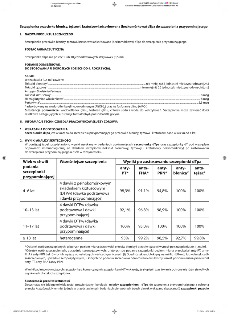 Size: 210x297 mm Pages: 4 Colors: C M Y K (4 Colors) Native File: Indesign CS5 Windows Generated in: Acrobat Distiller 9.0 Cutterguide: No Printing Process: Offset GD: RV 32305 Szczepionka przeciwko błonicy, tężcowi, krztuścowi adsorbowana (bezkomórkowa) dTpa do szczepienia przypominającego I. NAZWA PRODUKTU LECZNICZEGO Szczepionka przeciwko błonicy, tężcowi, krztuścowi adsorbowana (bezkomórkowa) dTpa do szczepienia przypominającego POSTAĆ FARMACEUTYCZNA Szczepionka dTpa ma postać 1 lub 10 jednodawkowych strzykawek (0,5 ml). PODANIE DOMIĘŚNIOWE. DO STOSOWANIA U DOROSŁYCH I DZIECI (OD 4. ROKU ŻYCIA). SKŁAD Jedna dawka (0,5 ml) zawiera: Toksoid błoniczy1 ..................................................................................................................................................... nie mniej niż 2 jednostki międzynarodowe (j.m.) Toksoid tężcowy1 ............................................................................................................................................. nie mniej niż 20 jednostek międzynarodowych (j.m.) Antygen Bordetella Pertussis Toksoid krztuścowy1 ................................................................................................................................................................................................................................... 8 mcg Hemaglutynina włókienkowa1................................................................................................................................................................................................................ 8 mcg Pertaktyna1 ..................................................................................................................................................................................................................................................2,5 mcg 1 adsorbowany na wodorotlenku glinu, uwodnionym (Al(OH)3) oraz na fosforanie glinu (AlPO4) Substancje pomocnicze: wodorotlenek glinu, fosforan glinu, chlorek sodu i woda do wstrzykiwań. Szczepionka może zawierać ilości resztkowe następujących substancji: formaldehyd, polisorbat 80, glicyna. II. INFORMACJE TECHNICZNE DLA PRACOWNIKÓW SŁUŻBY ZDROWIA 1. WSKAZANIA DO STOSOWANIA Szczepionka dTpa jest wskazana do szczepienia przypominającego przeciwko błonicy, tężcowi i krztuścowi osób w wieku od 4 lat. 2. WYNIKI ANALIZY SKUTECZNOŚCI W poniższej tabeli przedstawiono wyniki uzyskane w badaniach porównujących szczepionkę dTpa oraz szczepionkę dT pod względem odpowiedzi immunologicznej na składniki szczepionki (toksoid błonicowy, tężcowy i krztuścowy bezkomórkowy) po zastosowaniu do szczepienia przypominającego u osób w różnym wieku. Wiek w chwili podania szczepionki przypominającej Wcześniejsze szczepienia Wyniki po zastosowaniu szczepionki dTpa antyPT* antyFHA* antyPRN* antybłonicaΨ antytężecΨ 4–6 lat 4 dawki z pełnokomórkowym składnikiem krztuścowym (DTPw) (dawka podstawowa i dawki przypominające) 98,3% 91,1% 94,8% 100% 100% 10–13 lat 4 dawki DTPw (dawka podstawowa i dawki przypominające) 92,1% 96,8% 98,9% 100% 100% 11–17 lat 4 dawki DTPw (dawka podstawowa i dawki przypominające) 100% 95,0% 100% 100% 100% ≥ 18 lat heterogenne 95% 99,2% 98,5% 92,7% 99,8% Ψ Odsetek osób zaszczepionych, u których poziom miana przeciwciał przeciw błonicy i przeciw tężcowi wynosił po szczepieniu ≥0,1 j.m./ml. *Odsetek osób zaszczepionych, uprzednio seronegatywnych, u których po podaniu szczepionki poziom miana przeciwciał anty-PT, antyFHA i anty-PRN był równy lub wyższy od ustalonych wartości granicznych [tj. 5 jednostek endotoksyny na mililitr (EU/ml)] lub odsetek osób zaszczepionych, uprzednio seropozytywnych, u których po podaniu szczepionki odnotowano dwukrotny wzrost poziomu miana przeciwciał anty-PT, anty-FHA i anty-PRN. Wyniki badań porównujących szczepionkę z komercyjnymi szczepionkami dT wskazują, że stopień i czas trwania ochrony nie różni się od tych uzyskanych dla takich szczepionek. Skuteczność przeciw krztuścowi Dotychczas nie jakiegokolwiek został potwierdzony korelacja między szczepieniem dTpa do szczepienia przypominającego a ochroną przeciw krztuścowi. Niemniej jednak w przedstawionych badaniach pierwotnych trzech dawek wykazano skuteczność szczepionki przeciw GSKDC-PT-POL-2016-6203_D2.indd 1 2/1/2016 6:20:33 PM błonicy, tężcowi i krztuścowi (bezkomórkowej) adsorbowanej (DTPa) firmy GlaxoSmithKline Biologicals przeciw krztuścowi o typowym przebiegu zgodnie z definicją Światowej Organizacji Zdrowia (kaszel napadowy utrzymujący się przez 21 dni lub dłużej potwierdzony badaniem laboratoryjnym). • Badanie prospektywne metodą ślepej próby przeprowadzone jako badanie kontaktów domowych w Niemczech z podaniem szczepionki według schematu trzy, cztery i pięć miesięcy. Na podstawie zebranych danych dotyczących wtórnych kontaktów zaszczepionych domowników z chorym, u których stwierdzono przypadek wskaźnikowy krztuśca, skuteczność ochrony szczepionki DTPa wyniosła 88,7%. Ochrona przeciw krztuścowi o przebiegu łagodnym, który jest definiowany jako dowolnego rodzaju kaszel utrzymujący się przez 14 dni lub dłużej i potwierdzony badaniem laboratoryjnym, wynosiła 73%, a ochrona przed chorobą o tej samej charakterystyce utrzymującą się przez 7 dni lub dłużej wyniosła 67%. • Badanie skuteczności sponsorowane przez National Institutes of Health (NIH) przeprowadzone we Włoszech według schematu dwa, cztery i sześć miesięcy. Skuteczność szczepionki wyniosła 84%. Po rozszerzeniu zakresu definicji krztuśca o przypadki o łagodniejszym przebiegu klinicznym kaszlu i krótszym czasie trwania, skuteczność szczepionki DTPa wyniosła 71% w przypadku kaszlu dowolnego rodzaju i czasie trwanie wynoszącym powyżej siedmiu dni oraz 73% w przypadku kaszlu utrzymującego się przez 14 dni. U osób immunizowanych szczepionką dTpa do sz