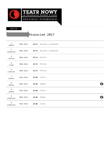repertuar kwiecień 2017 1 sobota 2 niedziela 4 wtorek 5 środa 6 czwartek 7 piątek 8 sobota 8 sobota 9 niedziela 9 niedziela Mała Sala 19:15 Wszystko o kobietach Mała Sala 19:15 Wszystko o kobietach Mała Sala 19:15 Policja Mała Sala 19:15 Policja Mała Sala 19:15 Policja Duża Sala 19:00 Lolita Mała Sala 16:00 Komeda Duża Sala 19:00 Lolita Mała Sala 16:00 Komeda Duża Sala 19:00 Lolita repertuar kwiecień 2017 20 czwartek 21 piątek 22 sobota 22 sobota 23 niedziela 23 niedziela 28 piątek 28 piątek 28 piątek 29 sobota Duża Sala 19:00 Lolita Duża Sala 19:00 Lolita Duża Sala 19:00 Lolita Mała Sala 19:15 Niżyński Duża Sala 16:00 Lolita Mała Sala 19:15 Niżyński Duża Sala 19:00 Wiele demonów Mała Sala 19:15 Metoda Grönholm Mała Sala 21:15 IMPRO ATAK! Duża Sala 19:00 Wiele demonów repertuar kwiecień 2017 29 sobota 29 sobota 30 niedziela 30 niedziela 30 niedziela Mała Sala 19:15 Metoda Grönholm Mała Sala 21:15 IMPRO ATAK! W pogoni za Haroldem Mała Sala 11:00 IMPRO ATAK! Bajka improwizowana Duża Sala 16:00 Wiele demonów Mała Sala 19:15 Metoda Grönholm