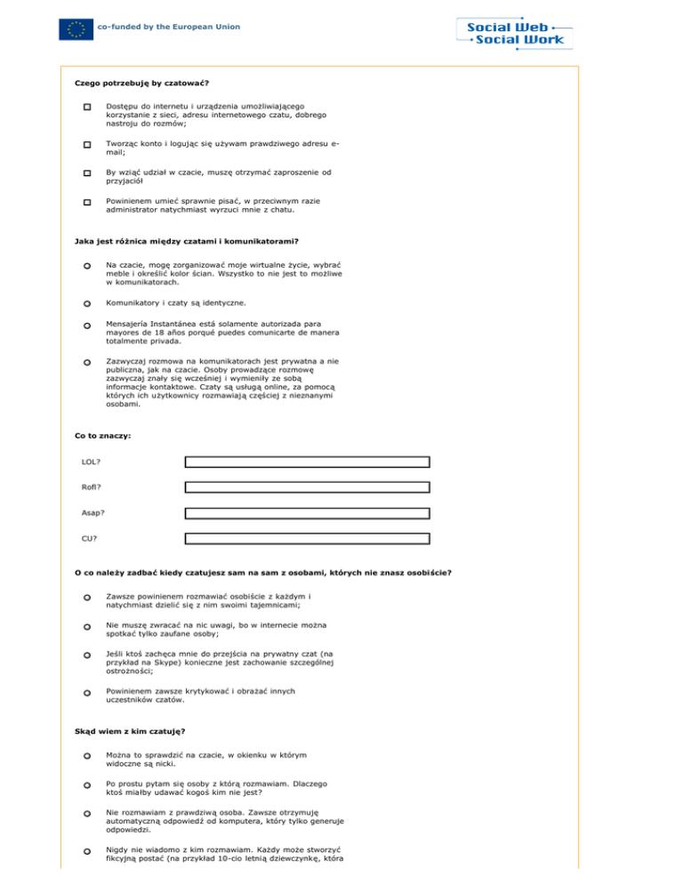 co-funded by the European Union Czego potrzebuję by czatować? Dostępu do internetu i urządzenia umożliwiającego korzystanie z sieci, adresu internetowego czatu, dobrego nastroju do rozmów; Tworząc konto i logując się używam prawdziwego adresu email; By wziąć udział w czacie, muszę otrzymać zaproszenie od przyjaciół Powinienem umieć sprawnie pisać, w przeciwnym razie administrator natychmiast wyrzuci mnie z chatu. Jaka jest różnica między czatami i komunikatorami? Na czacie, mogę zorganizować moje wirtualne życie, wybrać meble i określić kolor ścian. Wszystko to nie jest to możliwe w komunikatorach. Komunikatory i czaty są identyczne. Mensajería Instantánea está solamente autorizada para mayores de 18 años porqué puedes comunicarte de manera totalmente privada. Zazwyczaj rozmowa na komunikatorach jest prywatna a nie publiczna, jak na czacie. Osoby prowadzące rozmowę zazwyczaj znały się wcześniej i wymieniły ze sobą informacje kontaktowe. Czaty są usługą online, za pomocą których ich użytkownicy rozmawiają częściej z nieznanymi osobami. Co to znaczy: LOL? Rofl? Asap? CU? O co należy zadbać kiedy czatujesz sam na sam z osobami, których nie znasz osobiście? Zawsze powinienem rozmawiać osobiście z każdym i natychmiast dzielić się z nim swoimi tajemnicami; Nie muszę zwracać na nic uwagi, bo w internecie można spotkać tylko zaufane osoby; Jeśli ktoś zachęca mnie do przejścia na prywatny czat (na przykład na Skype) konieczne jest zachowanie szczególnej ostrożności; Powinienem zawsze krytykować i obrażać innych uczestników czatów. Skąd wiem z kim czatuję? Można to sprawdzić na czacie, w okienku w którym widoczne są nicki. Po prostu pytam się osoby z którą rozmawiam. Dlaczego ktoś miałby udawać kogoś kim nie jest? Nie rozmawiam z prawdziwą osoba. Zawsze otrzymuję automatyczną odpowiedź od komputera, który tylko generuje odpowiedzi. Nigdy nie wiadomo z kim rozmawiam. Każdy może stworzyć fikcyjną postać (na przykład 10-cio letnią dziewczynkę, która ma w domu dużo zabawek i żywego kucyka). Nikt nie może udowodnić, że ta osoba mówi prawdę lub kłamie. contact us co-funded by the European Union Czego potrzebuję by czatować? Dostępu do internetu i urządzenia umożliwiającego korzystanie z sieci, adresu internetowego czatu, dobrego nastroju do rozmów; Tworząc konto i logując się używam prawdziwego adresu email; By wziąć udział w czacie, muszę otrzymać zaproszenie od przyjaciół Powinienem umieć sprawnie pisać, w przeciwnym razie administrator natychmiast wyrzuci mnie z chatu. Prawidłowa odpowiedź to: Wystarczy tylko dostęp do Internetu, urządzenie umożliwiające podłączenie się do sieci, adres internetowy czatu oraz nastrój do rozmowy. W większości czatów by prowadzić rozmowę musi zostać utworzone konto, które jest weryfikowane poprzez wiadomość email. Niektóre czaty dla dzieci i młodzieży, wymagają przesłania pocztą formularza z pisemną zgodą rodziców. Istnieją również czaty bez konieczności rejestracji. Jaka jest różnica między czatami i komunikatorami? Na czacie, mogę zorganizować moje wirtualne życie, wybrać meble i określić kolor ścian. Wszystko to nie jest to możliwe w komunikatorach. Komunikatory i czaty są identyczne. Mensajería Instantánea está solamente autorizada para mayores de 18 años porqué puedes comunicarte de manera totalmente privada. Zazwyczaj rozmowa na komunikatorach jest prywatna a nie publiczna, jak na czacie. Osoby prowadzące rozmowę zazwyczaj znały się wcześniej i wymieniły ze sobą informacje kontaktowe. Czaty są usługą online, za pomocą których ich użytkownicy rozmawiają częściej z nieznanymi osobami. Prawidłowa odpowiedź to: Zazwyczaj rozmowa na komunikatorach jest prywatna, a nie publiczna, jak na czacie. Osoby prowadzące rozmowę zazwyczaj znały się i wcześniej wymieniły ze sobą informacje kontaktowe. Czaty są usługą online, w których internauci częściej rozmawiają z nieznanymi osobami. Co to znaczy: LOL? Rofl? Asap? CU? Prawidłowa odpowiedź: Lol (ang. Laughing out Loud) - Śmiać się na głos; Rofl (ang. Rolling on (the) floor laughing) Tarzać się po podłodze ze śmiechu Asap (ang. As soon as possible) - Tak szybko jak tylko możliwe CU (ang. See you!) - Do zobaczenia! O co należy zadbać kiedy czatujesz sam na sam z osobami, których nie znasz osobiście? Zawsze powinienem rozmawiać osobiście z każdym i natychmiast dzielić się z nim swoimi tajemnicami; Nie muszę zwracać na nic uwagi, bo w internecie można spotkać tylko zaufane osoby; Jeśli ktoś zachęca mnie do przejścia na prywatny czat (na przykład na Skype) konieczne jest zachowanie szczególnej ostrożności; Powinienem zawsze krytykować i obrażać innych uczestników czatów. Prawidłowa odpowiedź to: Jeśli ktoś zachęca cię do przejścia na prywatny czat (na przykład na Skype) konieczne jest zachowanie szczególnej uwagi. Wiele osób które czatują, ma intencje o charakterze seksualnym; po krótkiej rozmowie zapraszają dzieci do przełączenia się na prywatny czat (na przykład na Skype). Podczas rozmowy może się zdarzyć, że zobaczysz niekomfortowe dla Ciebie zdjęcia twojego rozmówcy. Możesz być również namawiany by włączyć kamerę internetową i robić rzeczy, na które nie masz ochoty. W takiej sytuacji natychmiast zakończ rozmowę. Spójrz na ustawienia programu, z którego korzystasz i sprawdź jak blokować niepożądanych użytkowników. O przykrych doświadczeniach na czacie dobrze jest porozmawiać z zaufaną osobą. Skąd wiem z kim czatuję? Można to sprawdzić na czacie, w okienku w którym widoczne są nicki. Po prostu pytam się osoby z którą rozmawiam. Dlaczego ktoś miałby udawać kogoś kim nie jest? Nie rozmawiam z prawdziwą osoba. Zawsze otrzymuję automatyczną odpowiedź od komputera, który tylko generuje odpowiedzi. Nigdy nie wiadomo z kim ro