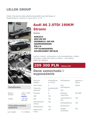 LELLEK GROUP Źródło: http://portal.lellek.pl/lel/komis/auto9911,Audi.pdf?grupa=3 Wygenerowano: Czwartek, 2 marca 2017, 11:19 Audi A6 2.0TDI 190KM Stronic Używany ROK2015 MOC190 KM PRZEBIEG11 500 KM NADWOZIESEDAN POJ.2.0 TYP SILNIKADIESEL KOLORCZARNY METALIK kupiony w polsce serwisowany w aso bezwypadkowy książka serwisowa I właściciel kupiony w salonie stan idealny właściciel niepalący 209 300 PLN faktura VAT Dane samochodu i wyposażenie Handlowiec Skrzynia biegów automatyczn a s-tronic Pochodzenie kupiony w Polsce Ilość miejsc 5 Polska Tapicerka skórzana alcantara/skó ra Kraj pochodzenia Maciej Stenzel +48 77 400 70 40 zapytaj Poduszki 6 ABS Tak mobile +48 783 001 002 ESP Tak ASR (kontrola trakcji) Tak Klimatyzacja Tak Elektryczne szyby Tak Charakterystyka spalania cykl miejski 4.7 l/100km VIN Pierwsza rejestracja 00-0000 serwisowany w aso Tak bezwypadkowy Tak garażowany książka serwisowa Tak cykl pozamiejski 3.9 l/100km cykl mieszany 4.2 l/100km emisja CO2 110 g/km Gwarancja Gwarancja dostępna Ubezpieczenie Ubezpieczenie dostępne Kredyt Kredyt dostępny Zeskanuj kod, aby zobaczyć ofertę online Elektryczne lusterka Tak I właściciel Tak Tak Wspomaganie kierownicy Tak kupiony w salonie Komputer Tak Radioodtwarza cz Tak Alarm Tak Immobilizer Tak Centralny zamek Tak Nawigacja satelitarna Tak Światła przeciwmgieln e Tak Czujnik deszczu Tak Czujniki parkowania Tak Kierownica wielofunkcyjna Tak Podgrzewane fotele Tak Tempomat Tak Bluetooth Tak Światła LED Tak Alufelgi 18" Miejsce postoju AUDI LELLEK Sławice k/Opola tunning homologacja stan idealny Tak właściciel niepalący Tak Opis dodatkowy Lakier czarny Havanna metaliczny Tapicerka Alcantara/skóra Fotele sportowe wraz z regulacją odcinka lędźwiowego kręgosłupa, elektryczną S line selection - sportowa stylistyka przednich i tylnych zderzaków – dyfuzor w kolorze platynowo-szarym – logo S line na przednich błotnikach Obręcze ze stopu metali lekkich, 8 J x 18, 10-ramienne w układzie V, częściowo polerowane, Opony 245/45 R18 Asystent świateł drogowych Audi pre sense basic - (aktywne napinacze pasów bezpieczeństwa, funkcja kontroli szyb bocznych) Czujnik kontroli zapięcia pasów bezpieczeństwa Czujnik zmierzchowy świateł z czujnikiem deszczu Hamulec postojowy, elektromechaniczny z asystentem podjazdu Kurtyny powietrzne chroniące głowy pasażerów z przodu i z tyłu Poduszki powietrzne, boczne z przodu Poduszki powietrzne, czołowe dla kierowcy i pasażera z funkcją deaktywacji poduszki powietrznej pasażera Reflektory tylne w technice LED Servotronic - wspomaganie układu kierowniczego zależne od prędkości jazdy System zmywania reflektorów Światła hamowania - adaptacyjne Centralny zamek sterowany falami radiowymi Szyby boczne z przodu i z tyłu regulowane elektrycznie Tempomat Isofix - mocowanie fotelika dziecięcego na skrajnych fotelach z tyłu i fotelu pasażera z przodu Kanapa tylna z dzielonym i składanym oparciem Lusterka zewnętrzne, składane, z automatyczną funkcją przeciwoślepieniową z lewej i prawej strony Lusterko wewnętrzne z automatyczną funkcją przeciwoślepieniową Pakiet dla palących Audi drive select Koło zapasowe dojazdowe Listwy ozdobne wokół szyb, srebrne Szyby termoizolacyjne Śruby zabezpieczające koła przed kradzieżą Wskaźnik kontroli ciśnienia w oponach Zawieszenie dynamiczne Zbiornik paliwa o pojemności 73l MMI NAVIGATION plus z MMI touch Ogrzewanie foteli przednich Audi Connect Audi phone box Audi sound system Kierownica 3-ramienna, wielofunkcyjna, sportowa, obszyta skórą Klimatyzacja automatyczna, 4-strefowa Pakiet oświetlenia zewnętrznego i wnętrza Ambiente – lampki make-up – lampki do czytania z przodu i z tyłu – podświetlenie kieszeni drzwi – oświetlenie przestrzeni nóg – iluminacja konsoli środkowej – oświetlenie listew progowych Reflektory w technologii LED - statyczny reflektor skrętu - światła autostradowe - światła na złe warunki pogodowe - kierunkowskazy dynamiczne z tyłu Audi Extensive - gwarancja 5 lat / 150 000 km Zestaw schowków – siatka mocująca bagaż w bagażniku (dla limuzyny) – gniazdo 12V z tyłu – 2 uchwyty na kubki w tylnym podłokietniku Audi parking system plus (przód/tył) z wizualizacją na ekranie Kluczyk komfortowy z funkcją otwierania bagażnika za pomocą gestów (zawiera opcje: kluczyk komfortowy i alarm oraz wspomaganie unoszenia i opuszczania pokrywy bagażnika elektryczne) Żaluzja przeciwsłoneczna z elektryczną regulacją na tylną szybę i manualną na szyby boczne Nasi doradcy są do Państwa dyspozycji: Maciej Stenzel GSM: +48 783 001 002 Wojciech Sowa GSM: +48 601 545 492 Nota prawna Informacja nie stanowi oferty w rozumieniu art. 66 Kodeksu Cywilnego. Podane dane mają charakter wyłącznie informacyjny. Pełna informacja dostępna jest u handlowca. Sprzedający nie odpowiada za ewentualne błędy lub nieaktualność ogłoszenia.